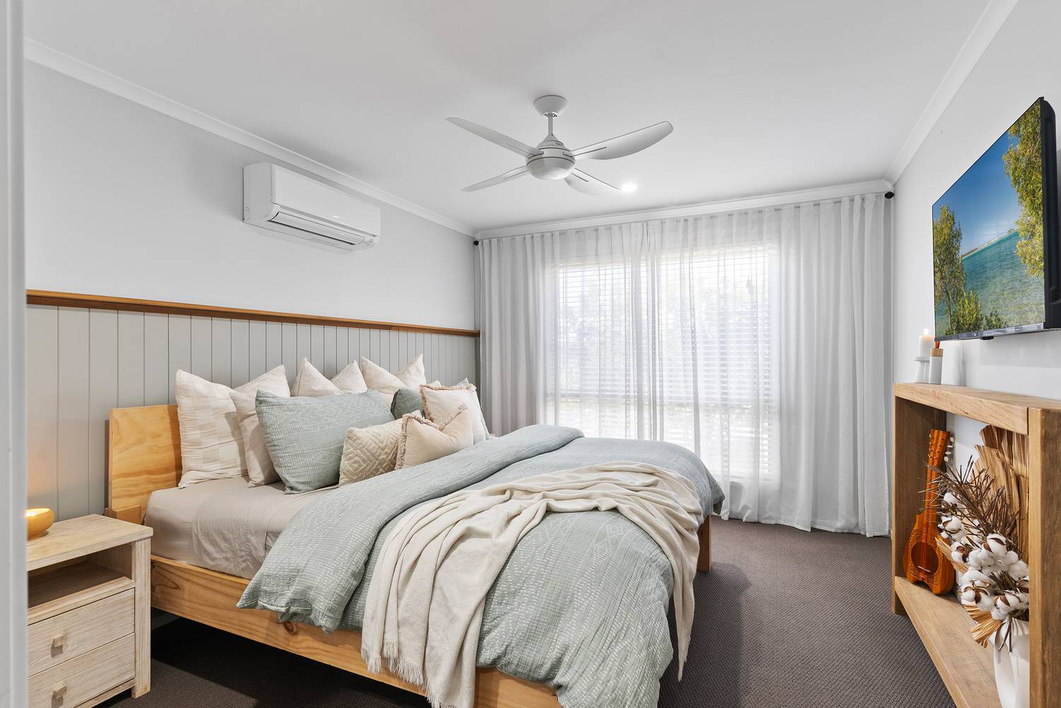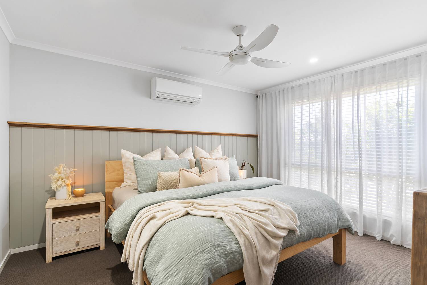-Master bedroom with floor-to-ceiling sheers, VJ panelled feature wall, walk-in robe and double vanity ensuite