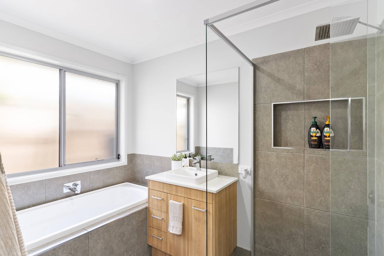 -Main bathroom with bathtub beneath the window, vanity and shower with rainfall head and niche