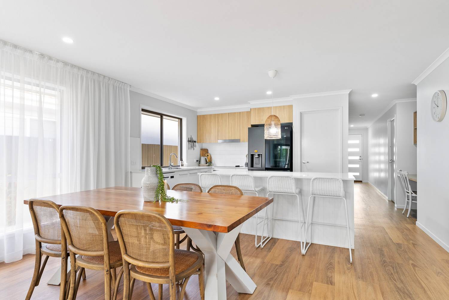 With wood-effect vinyl planking and a coastal chic aesthetic, the masterful open-plan design welcomes you through to a spacious and inviting living area. Adorned with large windows providing abundant natural light and views to the swimming pool this is your own slice of paradise to relax and unwind. The kitchen, dining and living space seamlessly connects with the decked alfresco outside making it ideal for entertaining guests or spending quality time with family.