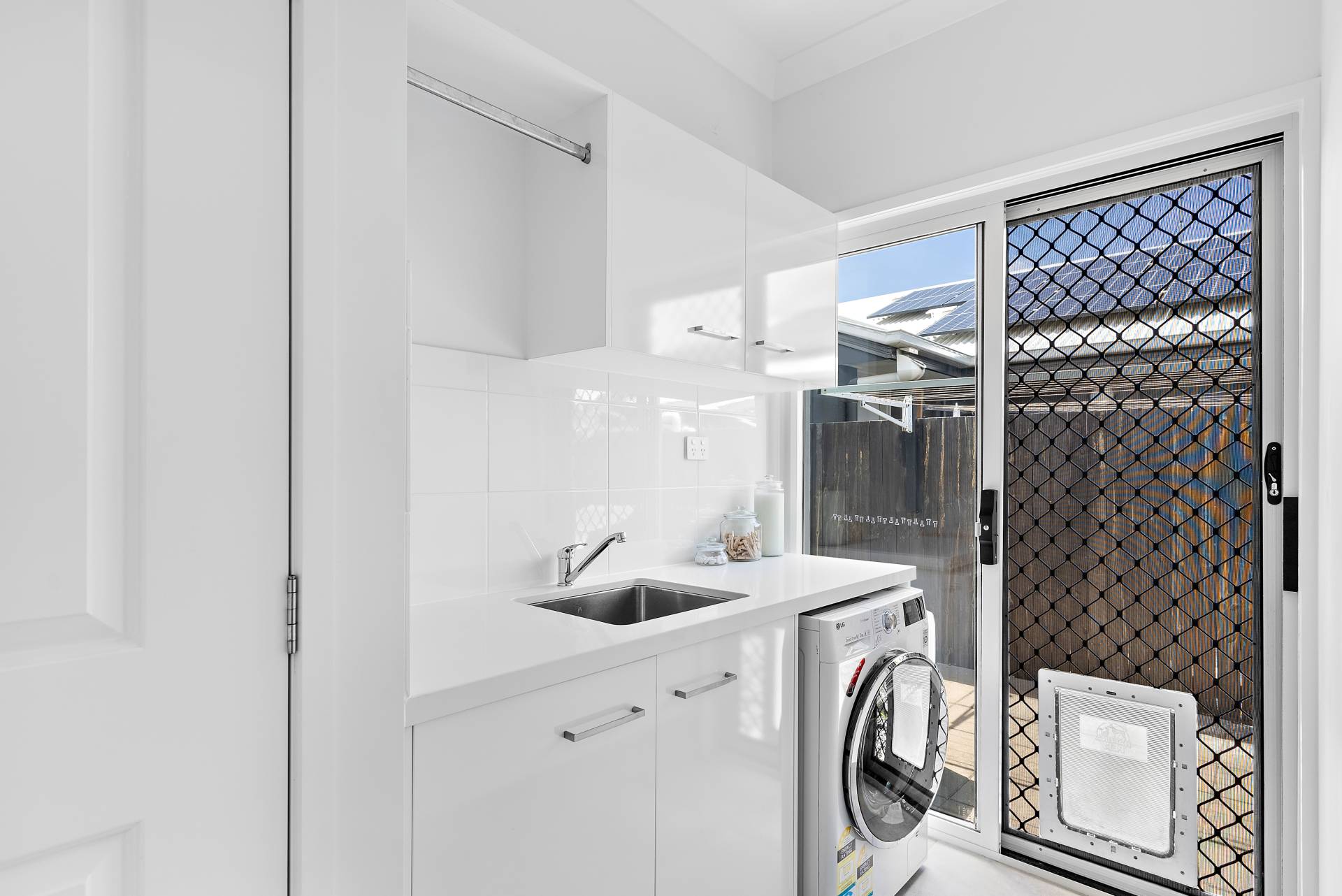 - Separate laundry with built-in bench-tops, sink, hanging rail and direct access to drying area