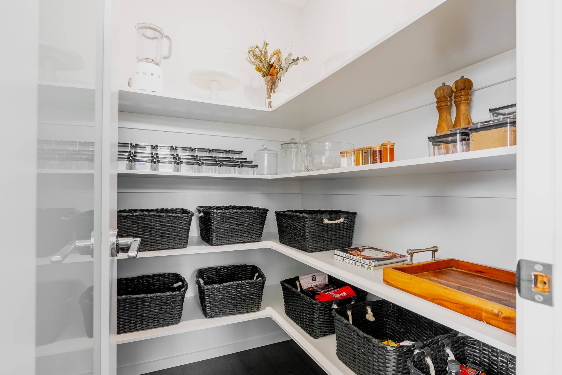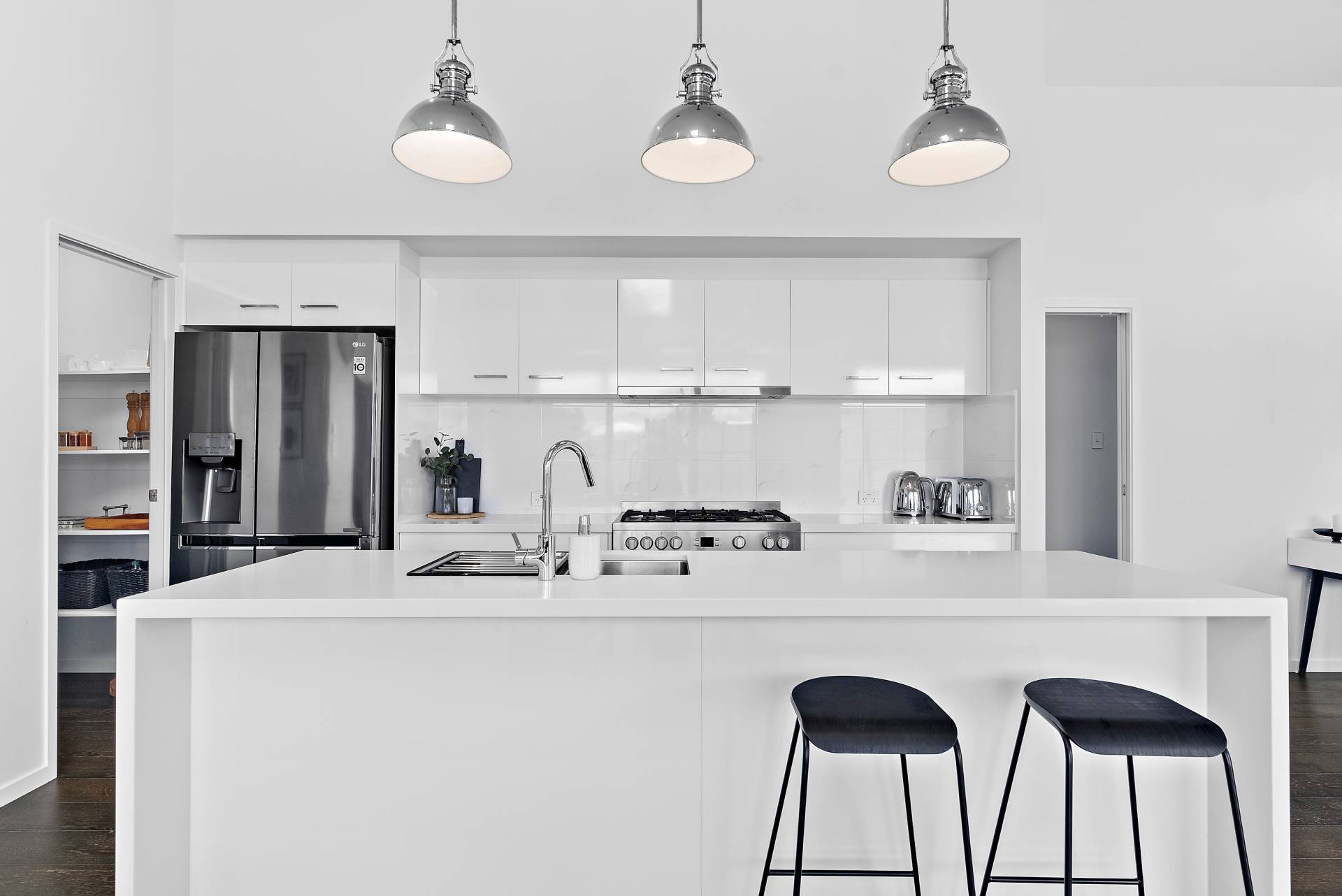 - Modern kitchen with walk-in pantry, quality appliances, and stunning pendant lighting over island bar
