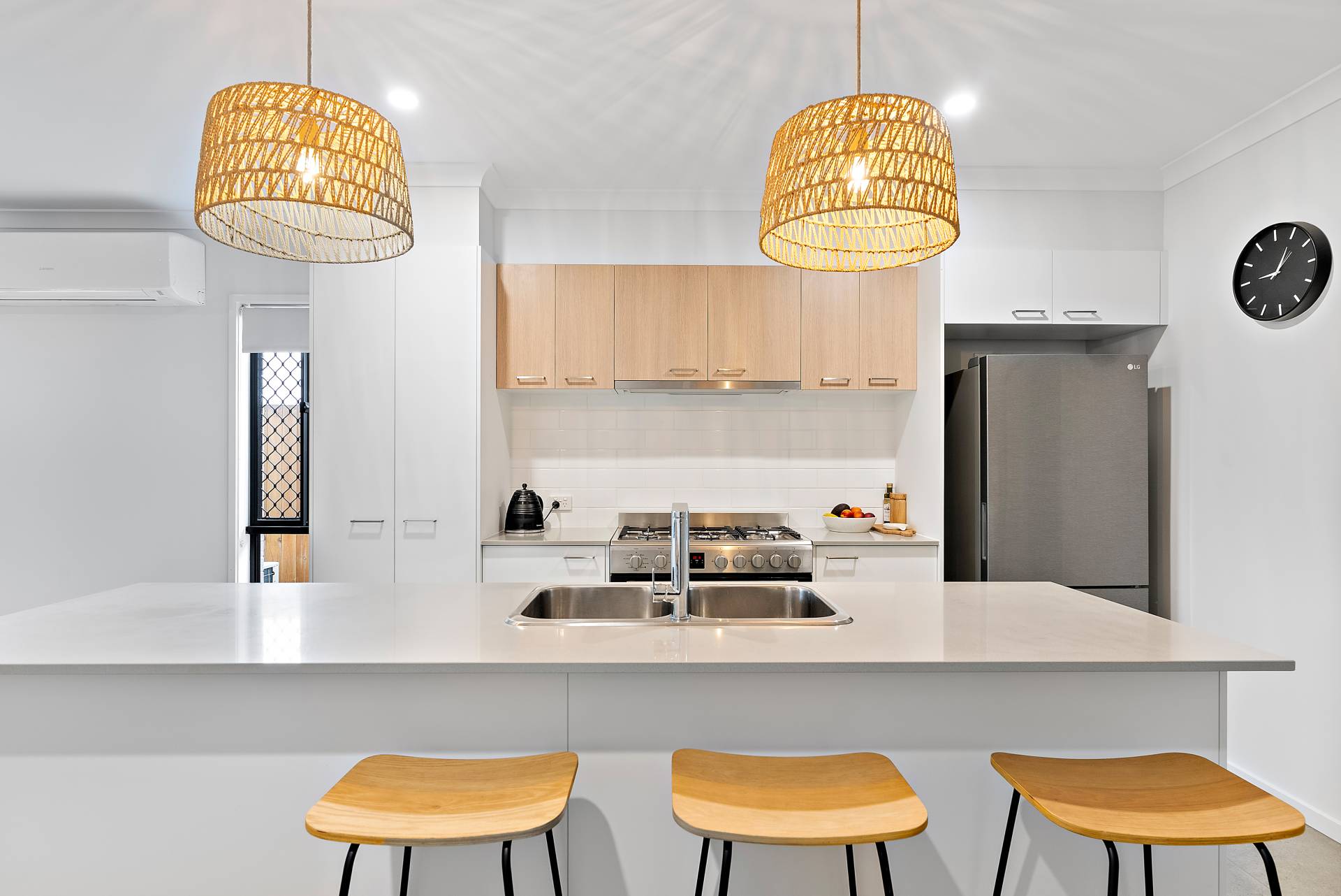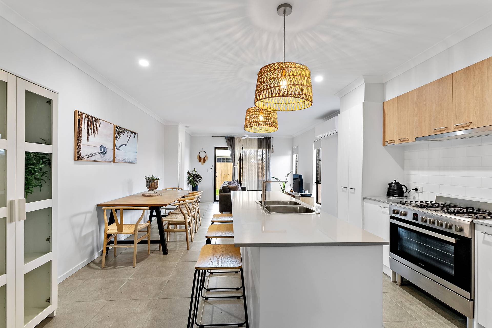 - Well appointed kitchen with 900mm freestanding oven and gas cooktop, dishwasher, and reconstituted stone benchtops