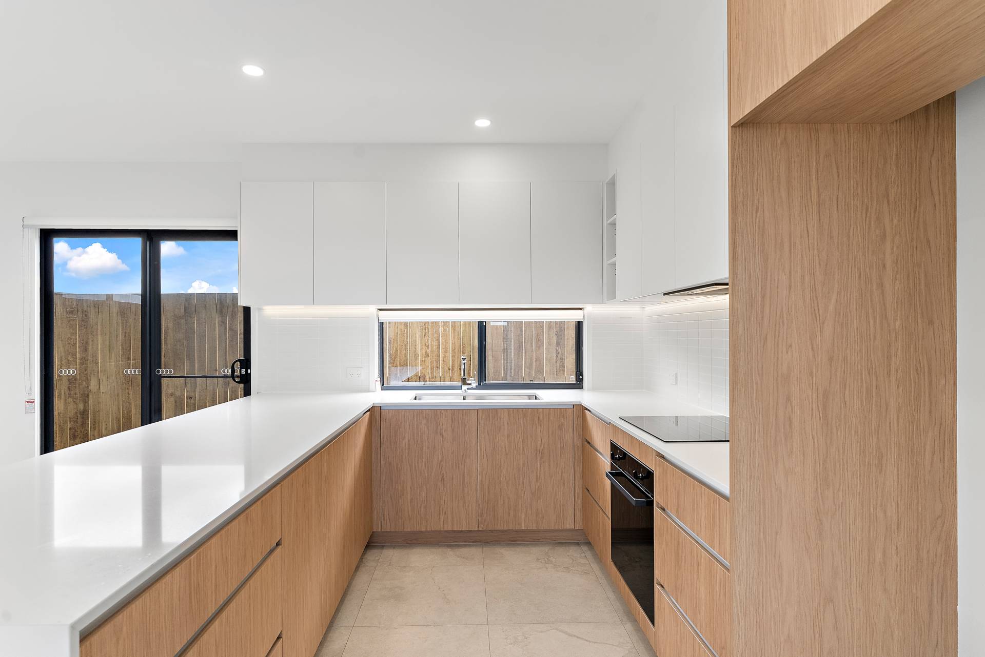 - Modern kitchen with back-lit splash-back, reconstituted stone waterfall edge benchtops, quality appliances including an integrated dishwasher and ample bench space
