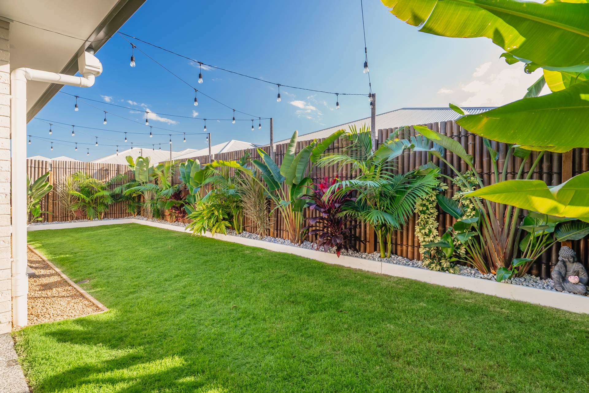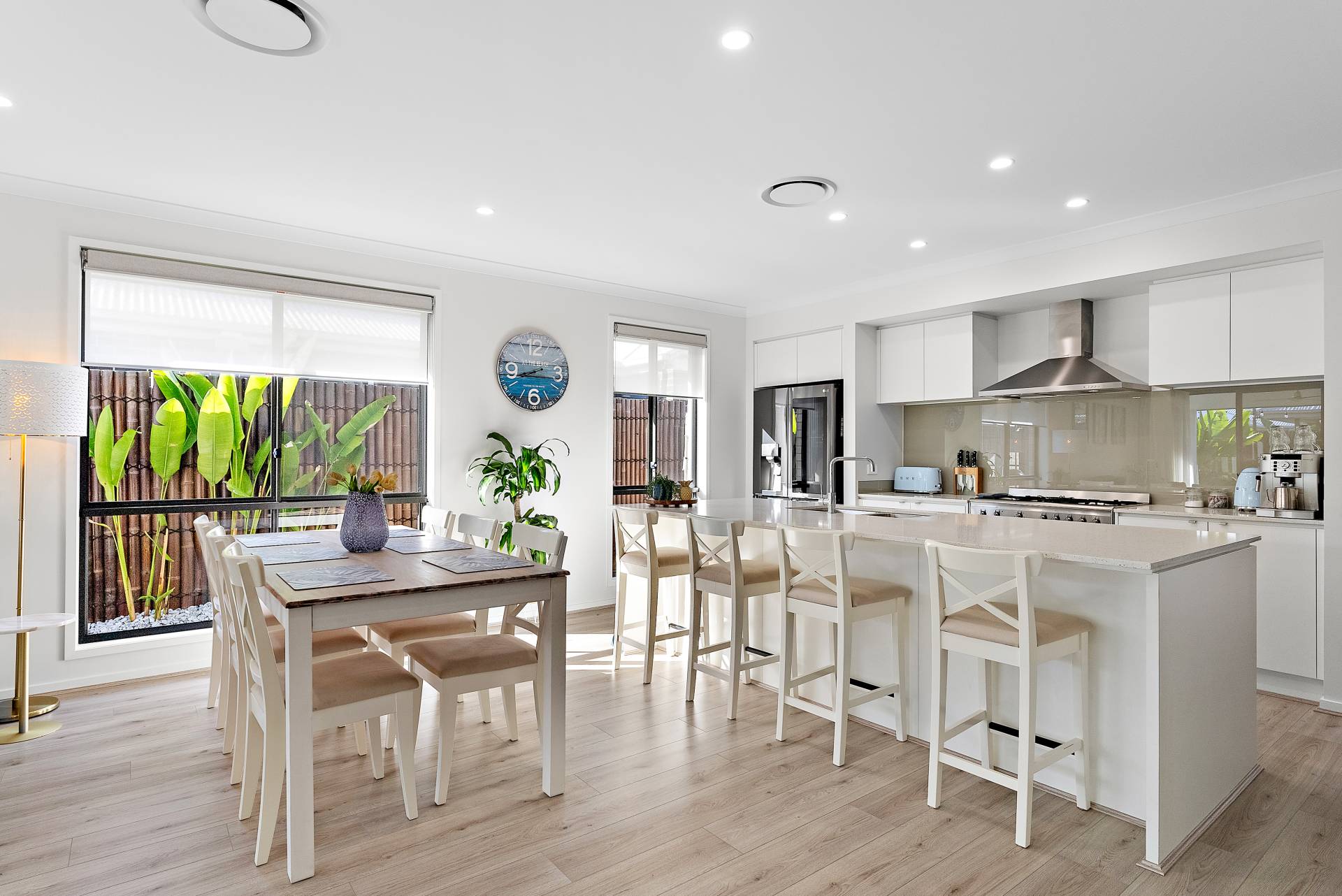 The heart of the home is the spectacular open-plan kitchen, living, and dining area which opens into a beautifully landscaped alfresco and garden. This masterfully designed space is bright and inviting with large windows and high ceilings. The kitchen is a chef's dream, boasting expansive bench space, island breakfast bar, walk-in pantry, and premium SMEG appliances including a 900mm oven and gas cooktop. The living area flows effortlessly to the outdoors through three stacker sliding doors, leading to an enchanting alfresco retreat surrounded by lush greenery. The meticulously landscaped garden creates a serene backdrop, evoking a sense of tropical paradise living.