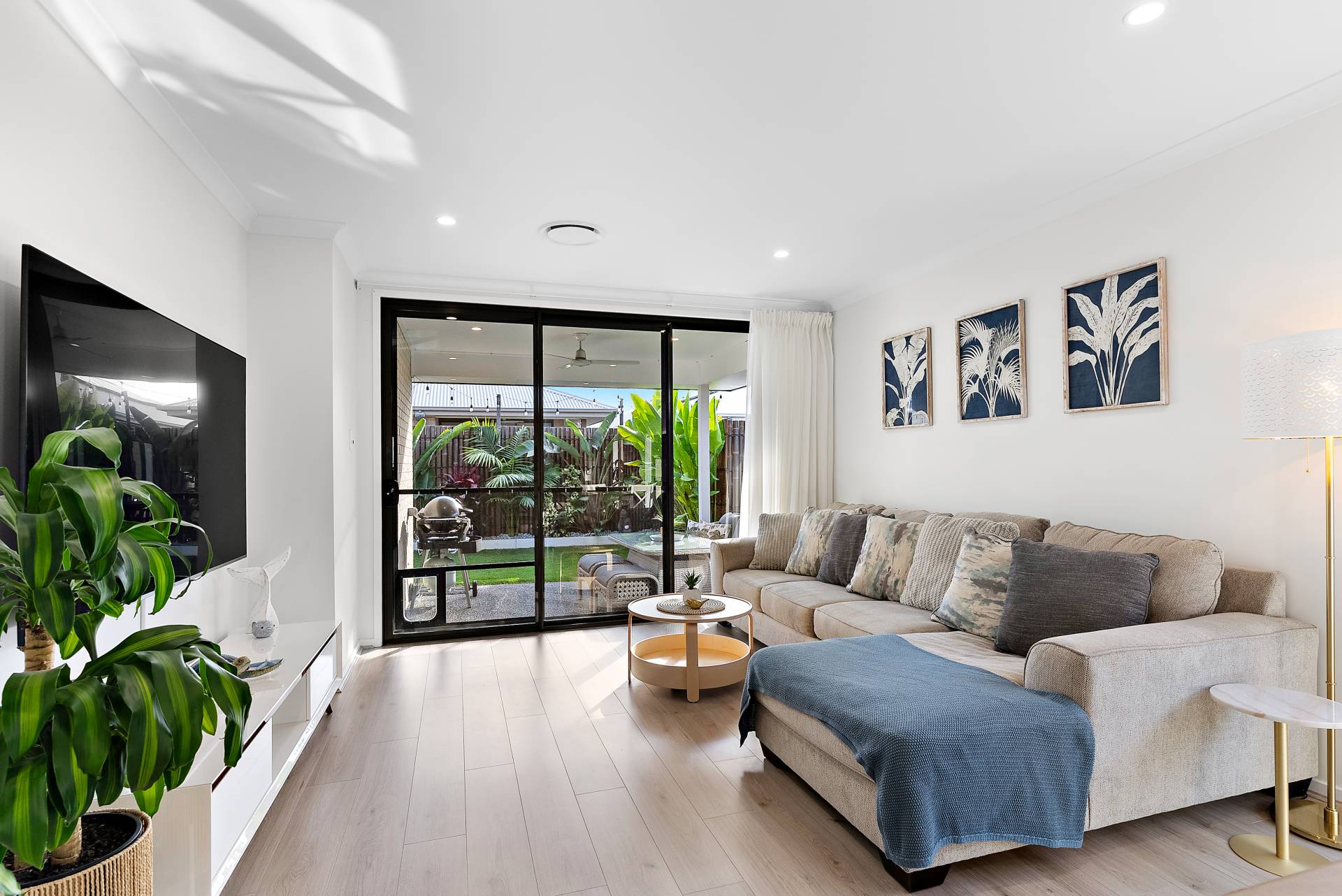 - Lounge with three-stacking sliding doors and floor-to-ceiling sheers, opening onto alfresco entertaining