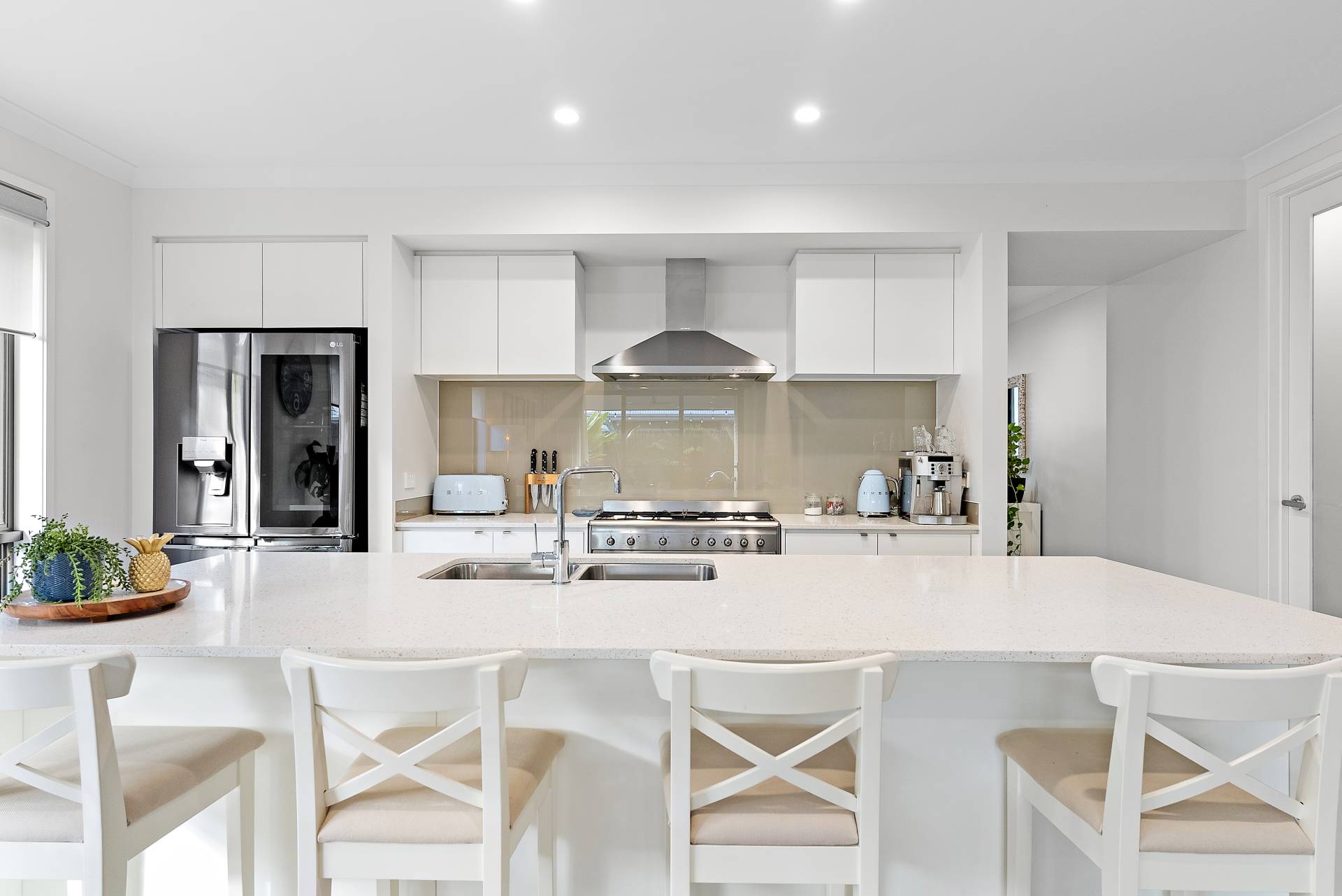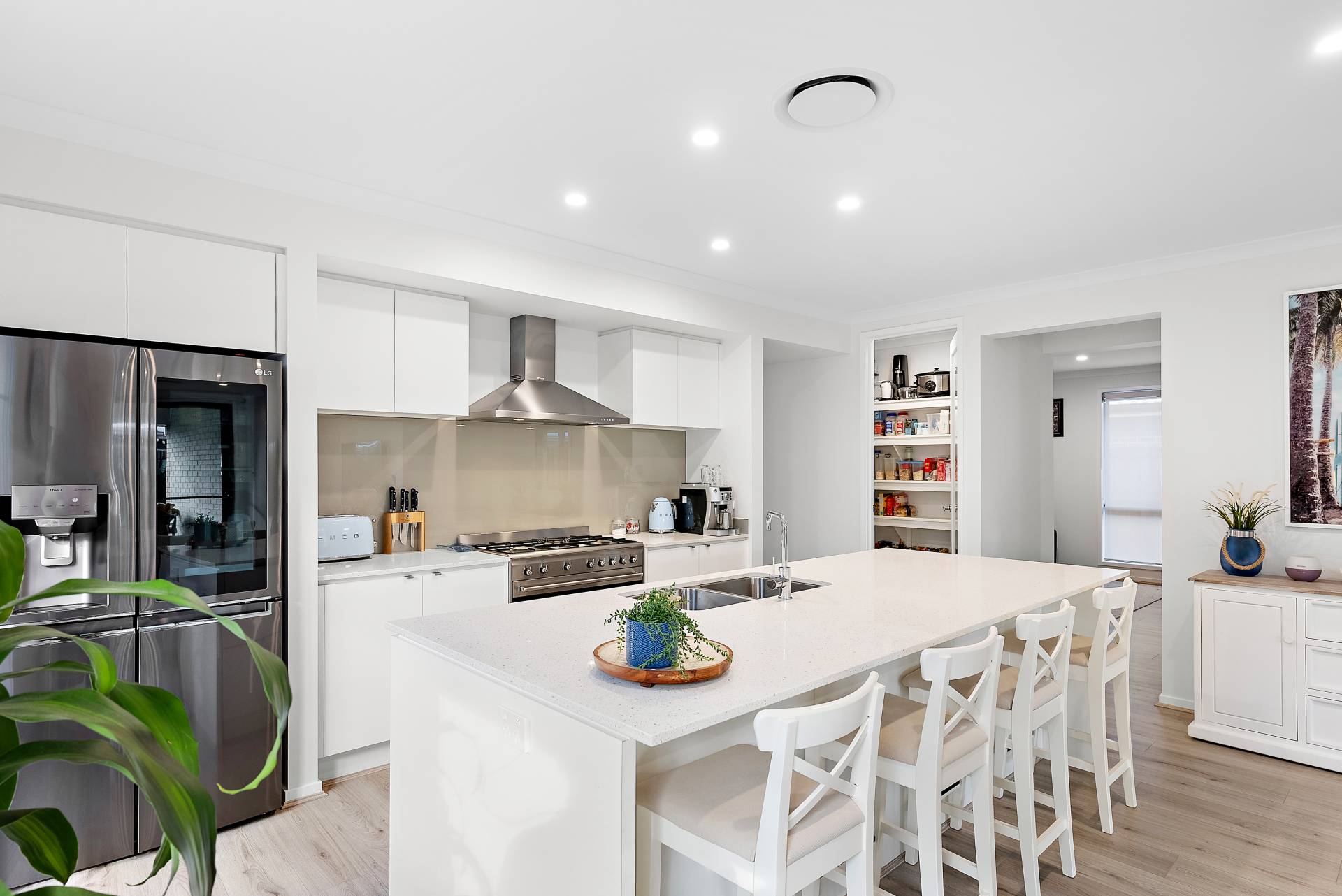 - Modern kitchen boasting ample bench space, large kitchen island, walk-in pantry with frosted glass door, reconstituted stone bench-tops, SMEG appliances, 900mm oven, and gas cooktop
