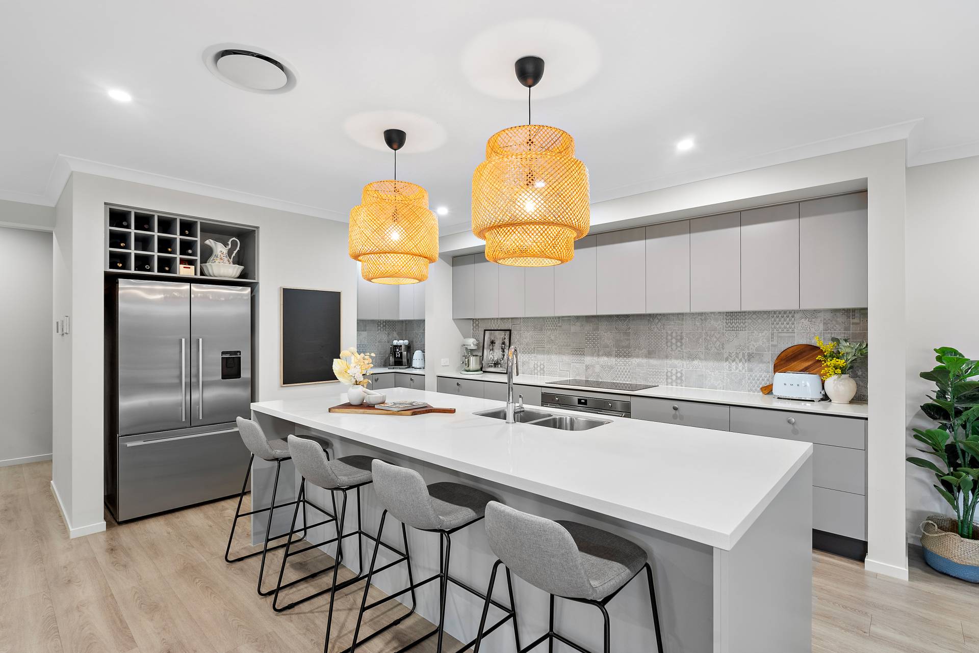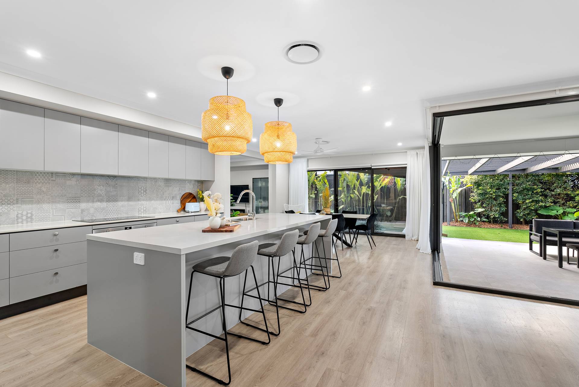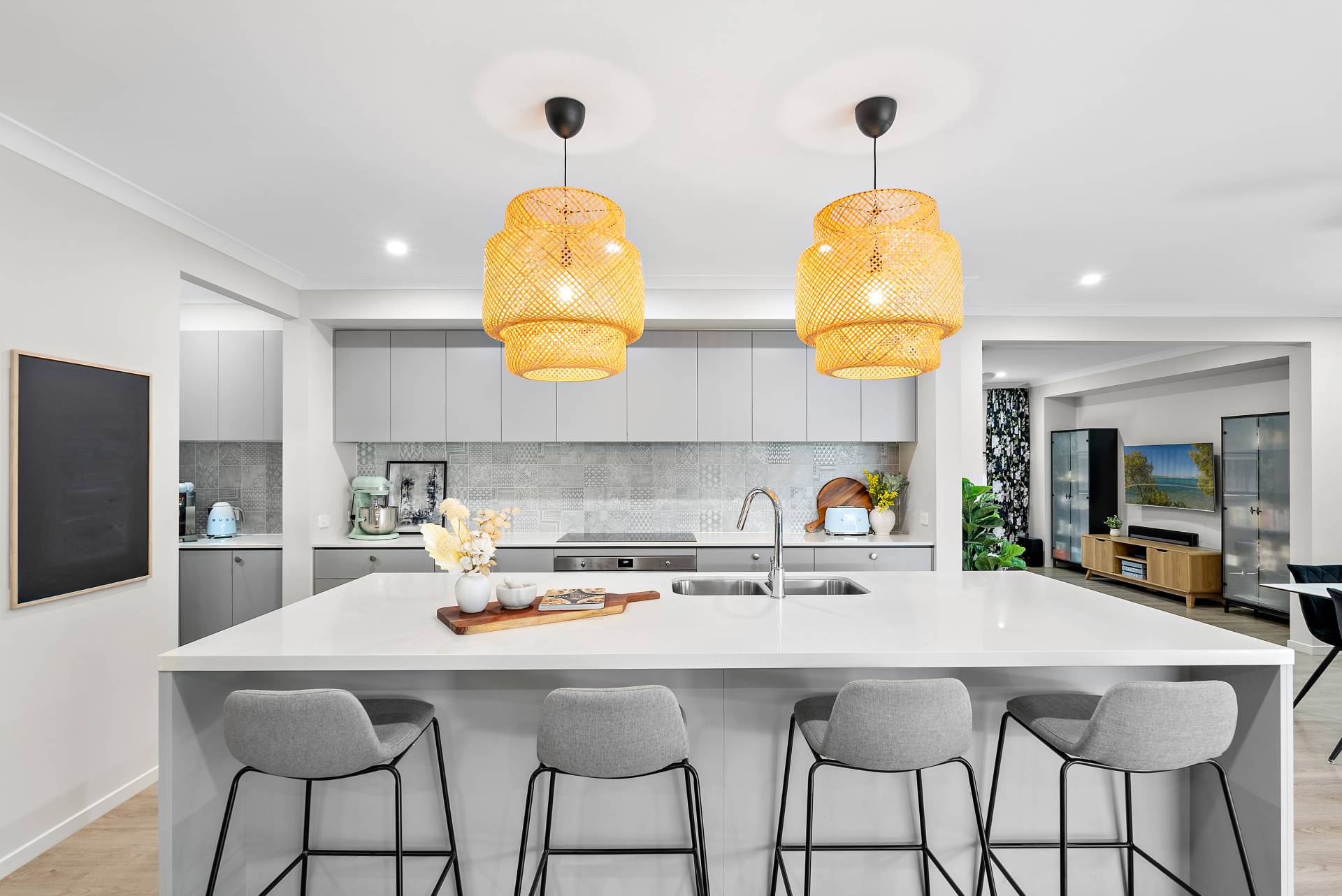 - Entertainer's kitchen with pendant lighting, an opulent kitchen island with 40mm stone bench-top , stunning feature tile splashback, and in-built sink