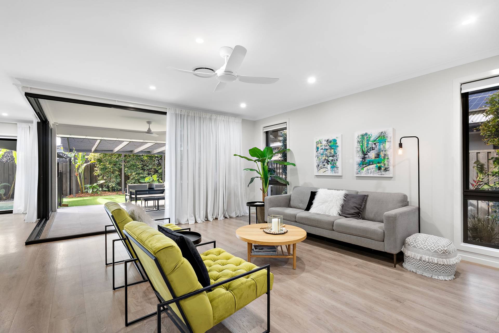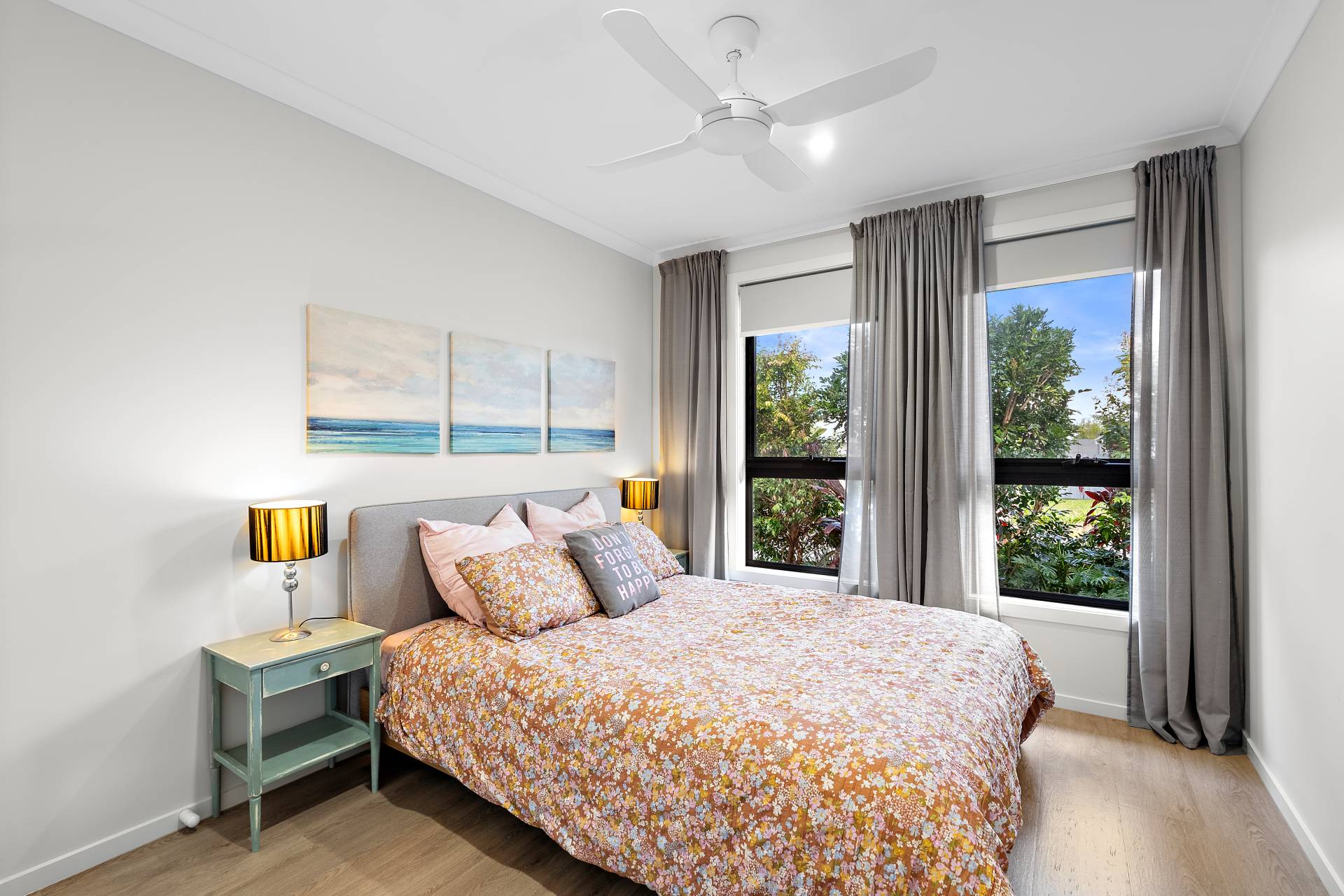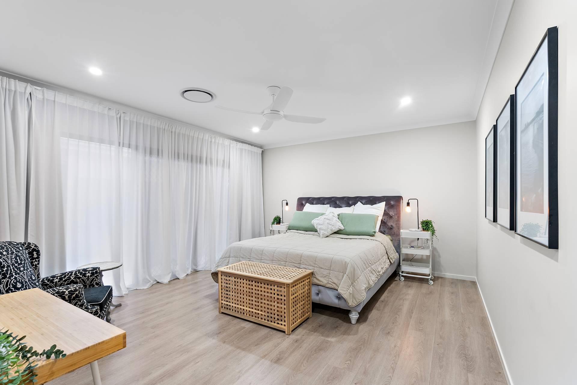 - Three generously sized bedrooms off the third living space, each with built-in wardrobes and ceiling fans