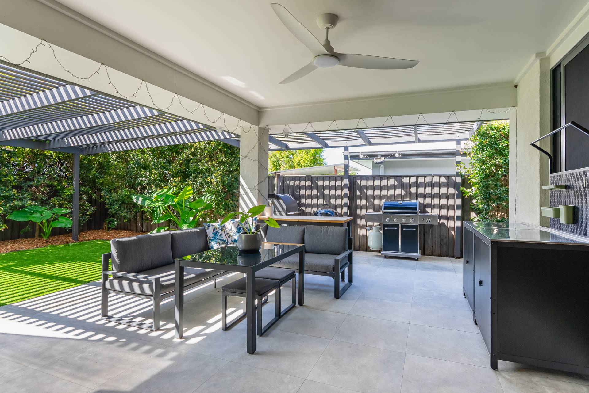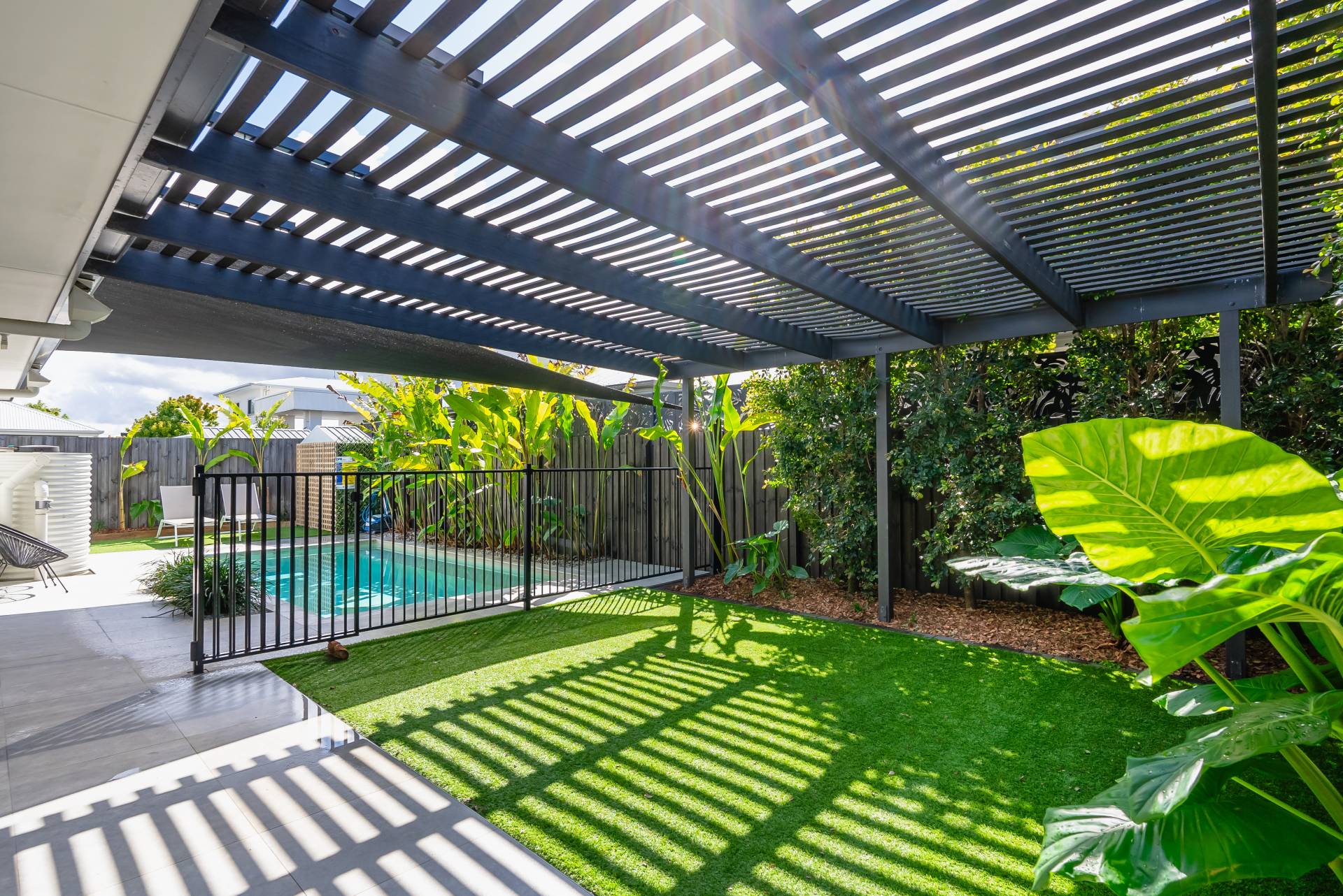 - Multi-zoned outdoor living space featuring an extensive covered alfresco area, pergola, artificial turf, and lush established greenery for ultimate privacy and filtered sunlight, along with a tiled patio for soaking up the sun by the pool
