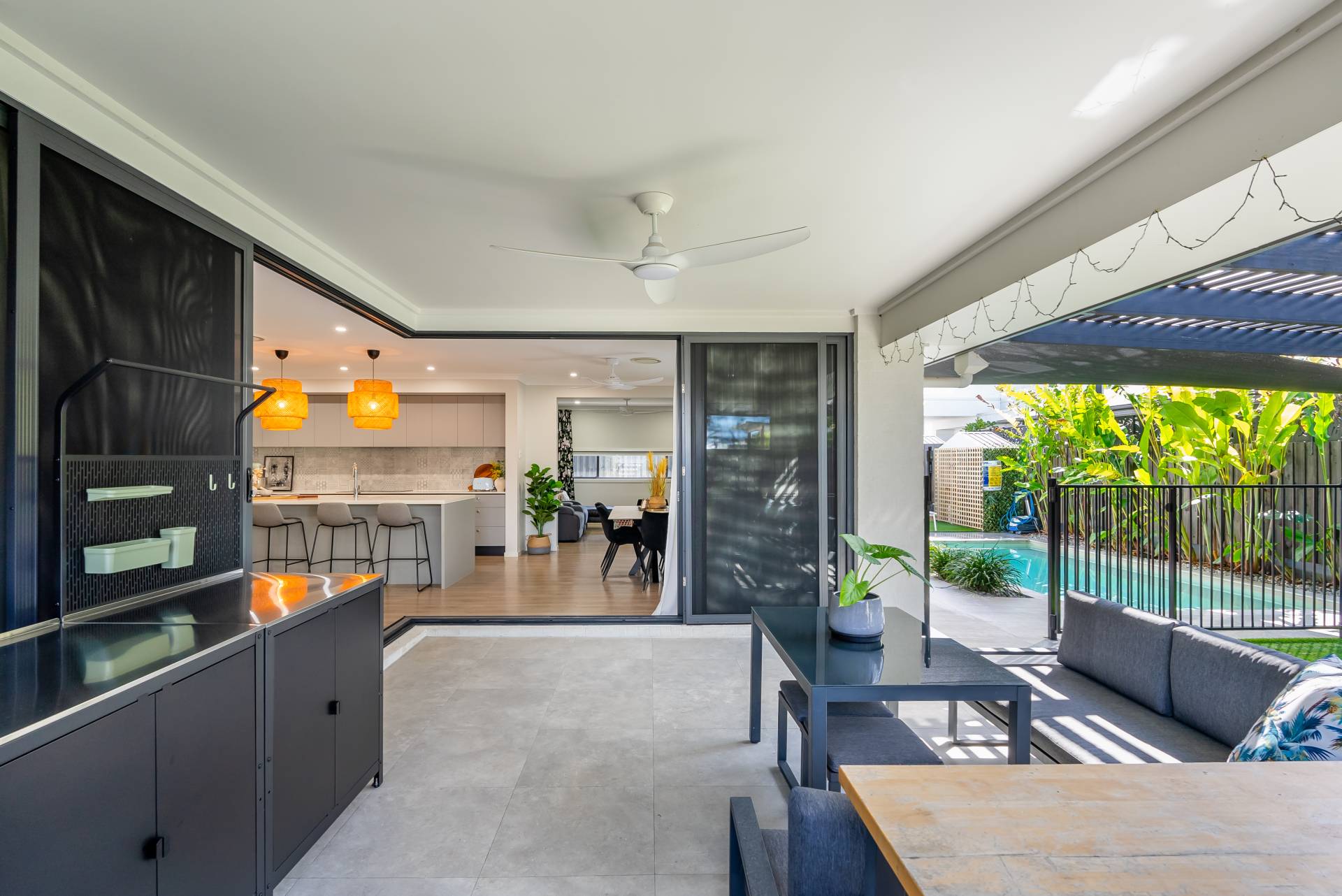 - Expansive open-plan living and dining area flowing outside to alfresco entertaining and the swimming pool