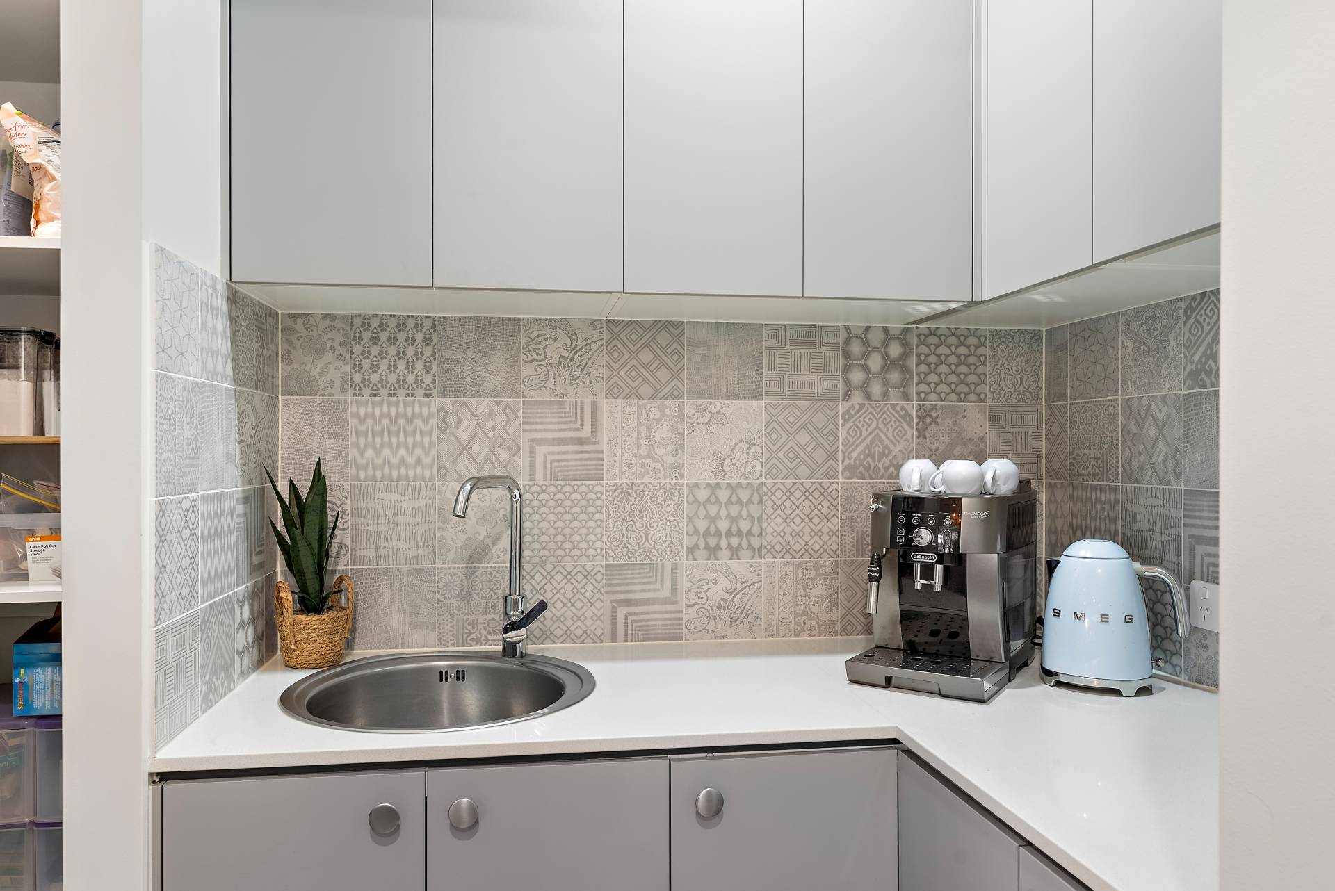 - Butler's pantry with a sink, extended bench-top, kitchen splashback, power sockets, ample storage, and overhead cabinetry