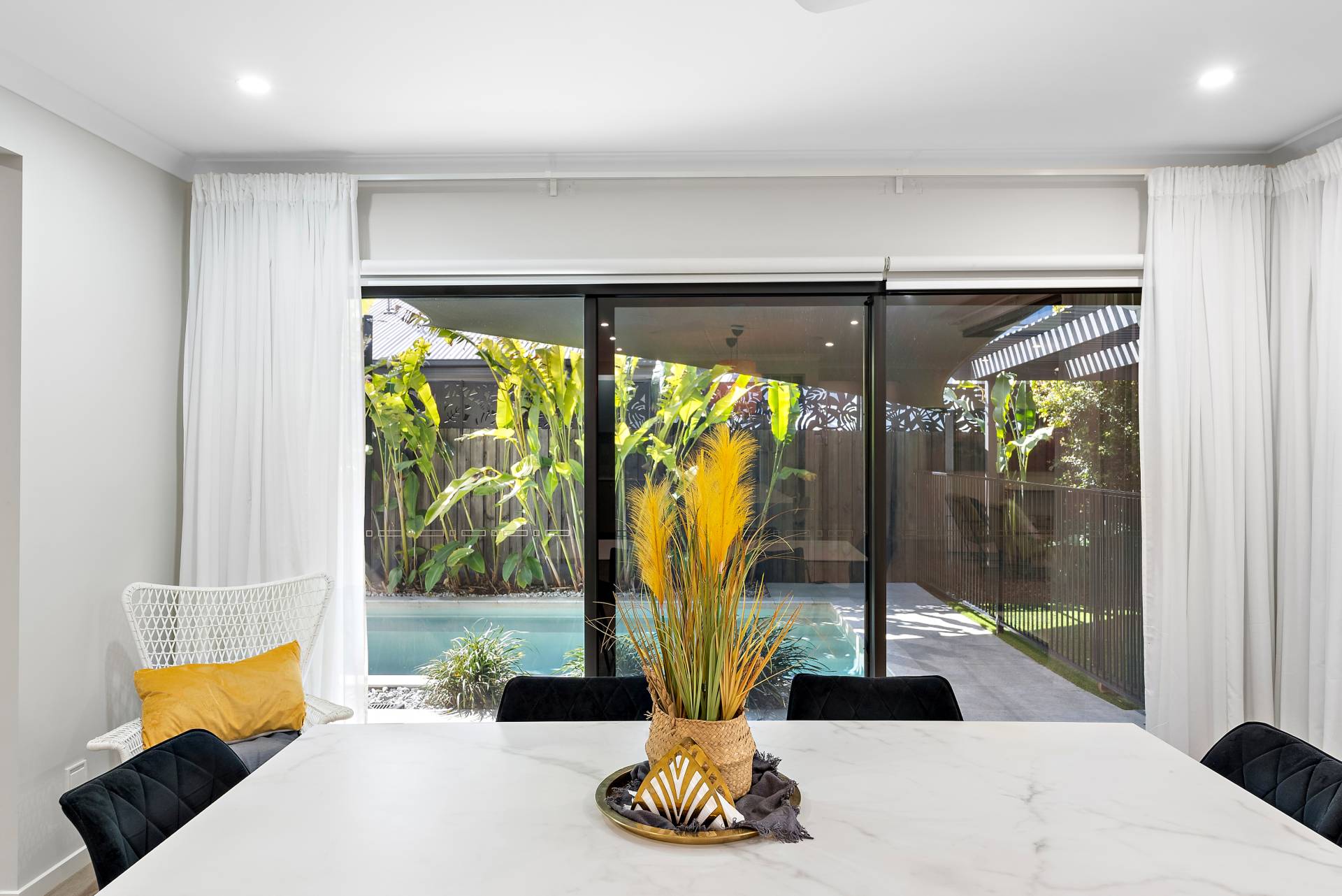 - Dining area with stunning floor-to-ceiling stacking windows and magnificent pool views