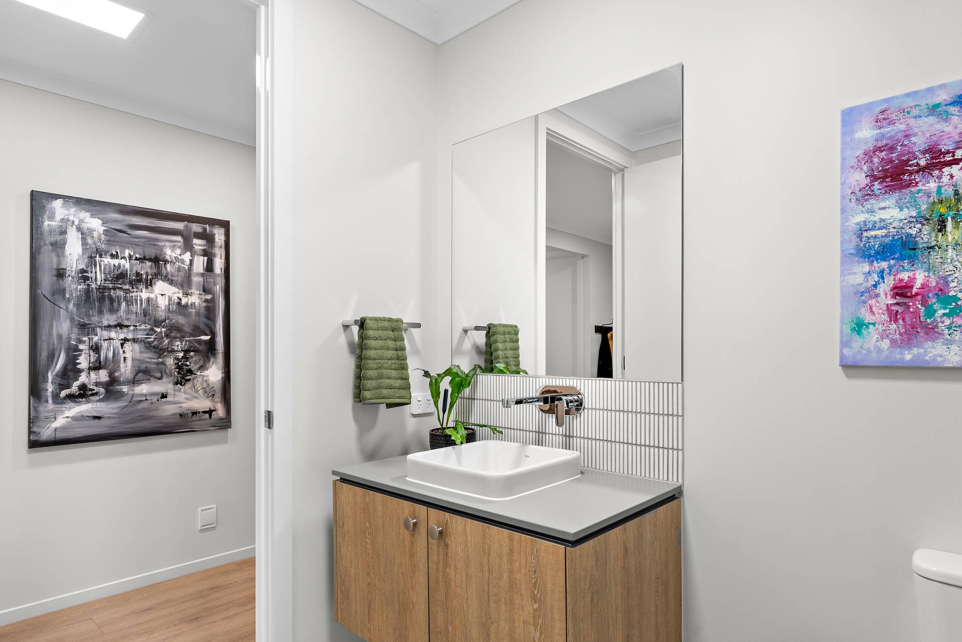 - Separate powder room with basin, vanity, and feature tile