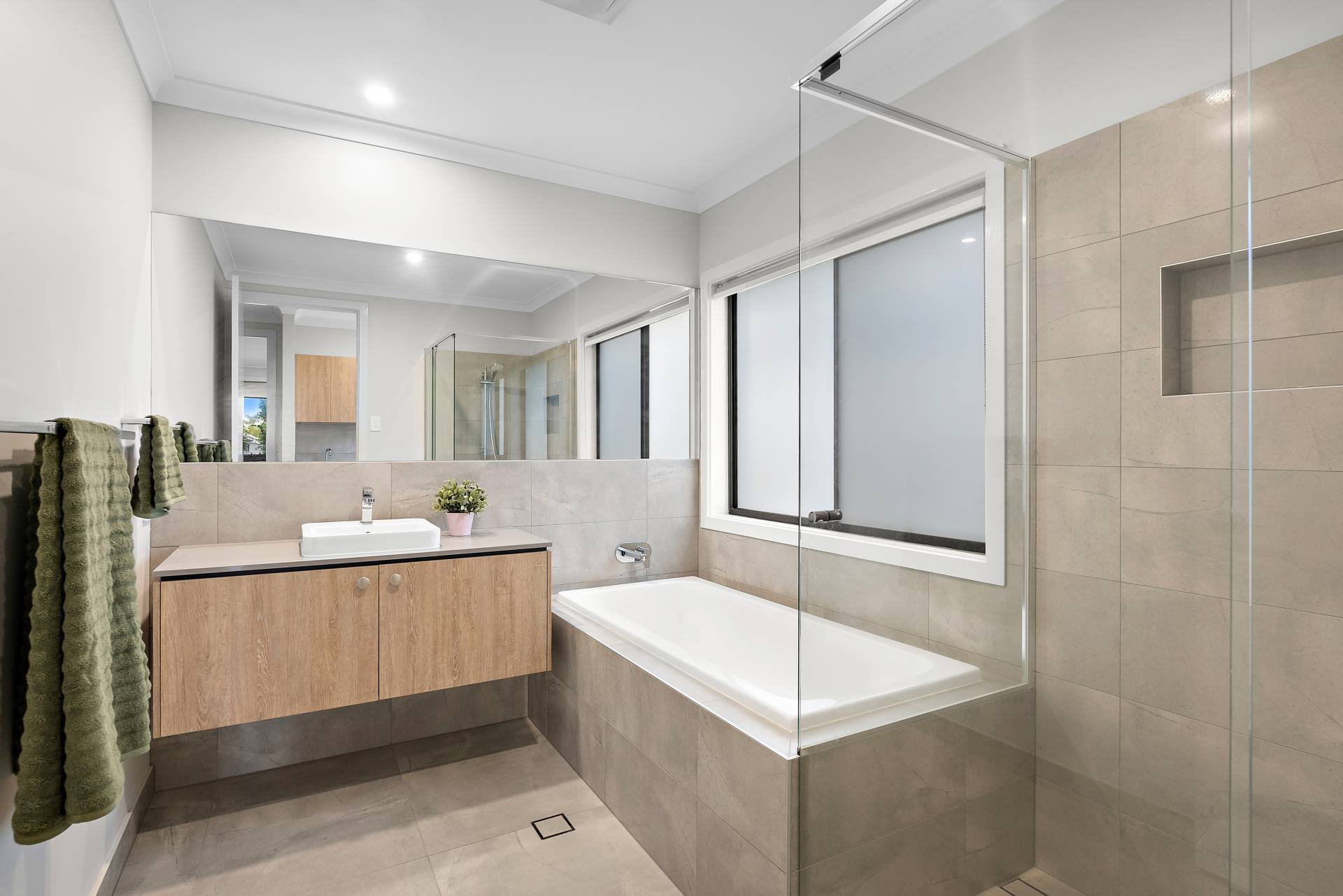 - Main bathroom with a full wall-width mirror, bath, shower, niche shelving, and adjustable shower head