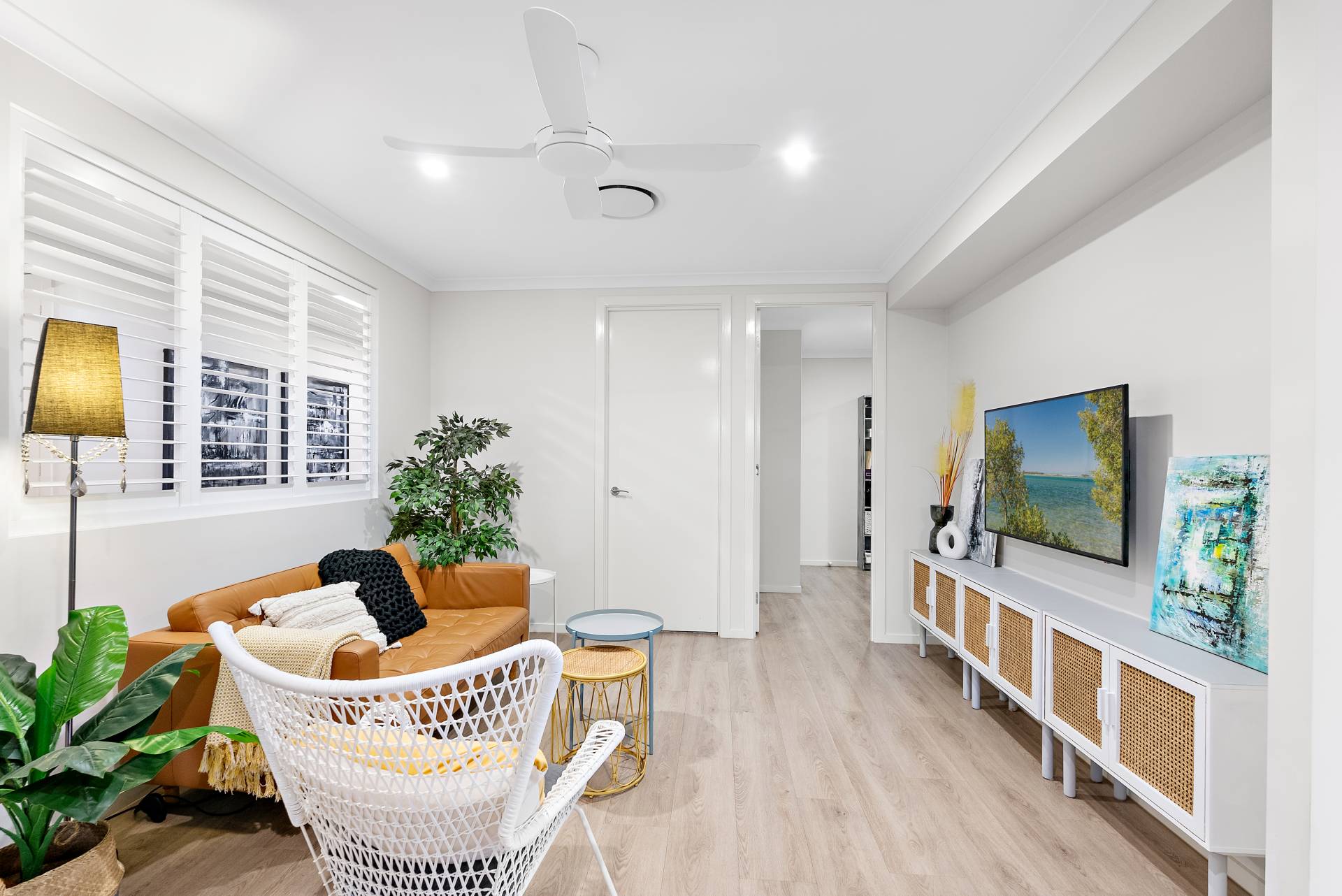 - Third living space with a frosted glass door and plantation shutters to separate the space