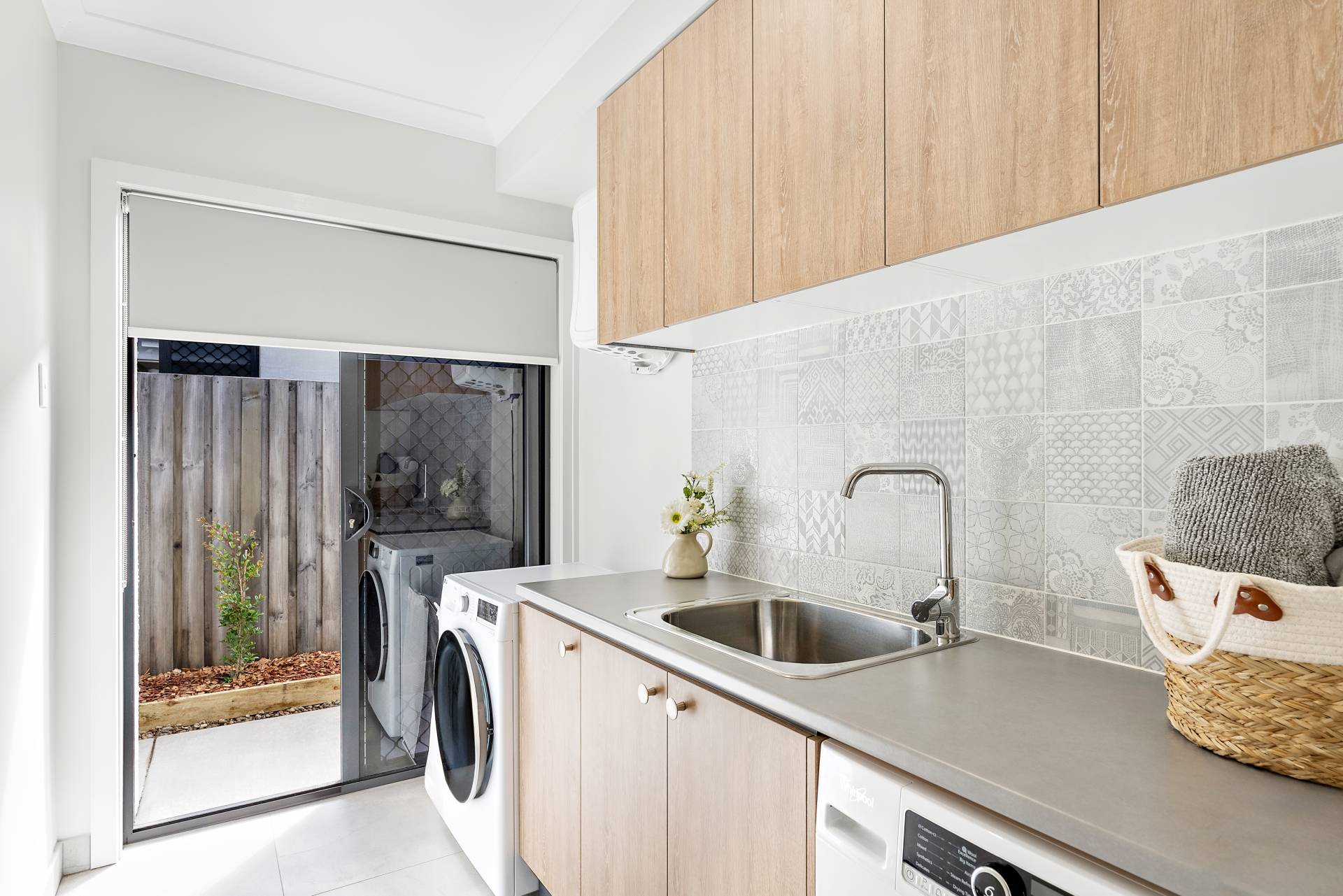- Laundry equipped with direct access to the clothesline, cabinetry, and ample storage