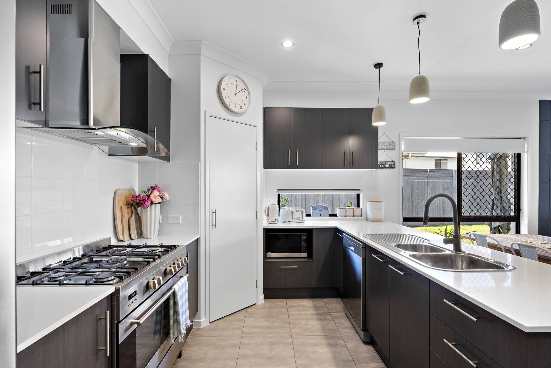 - Kitchen equipped with pendant lighting, black tapware, gas cooktop, stone benchtops, stainless steel dishwasher, and ample storage space