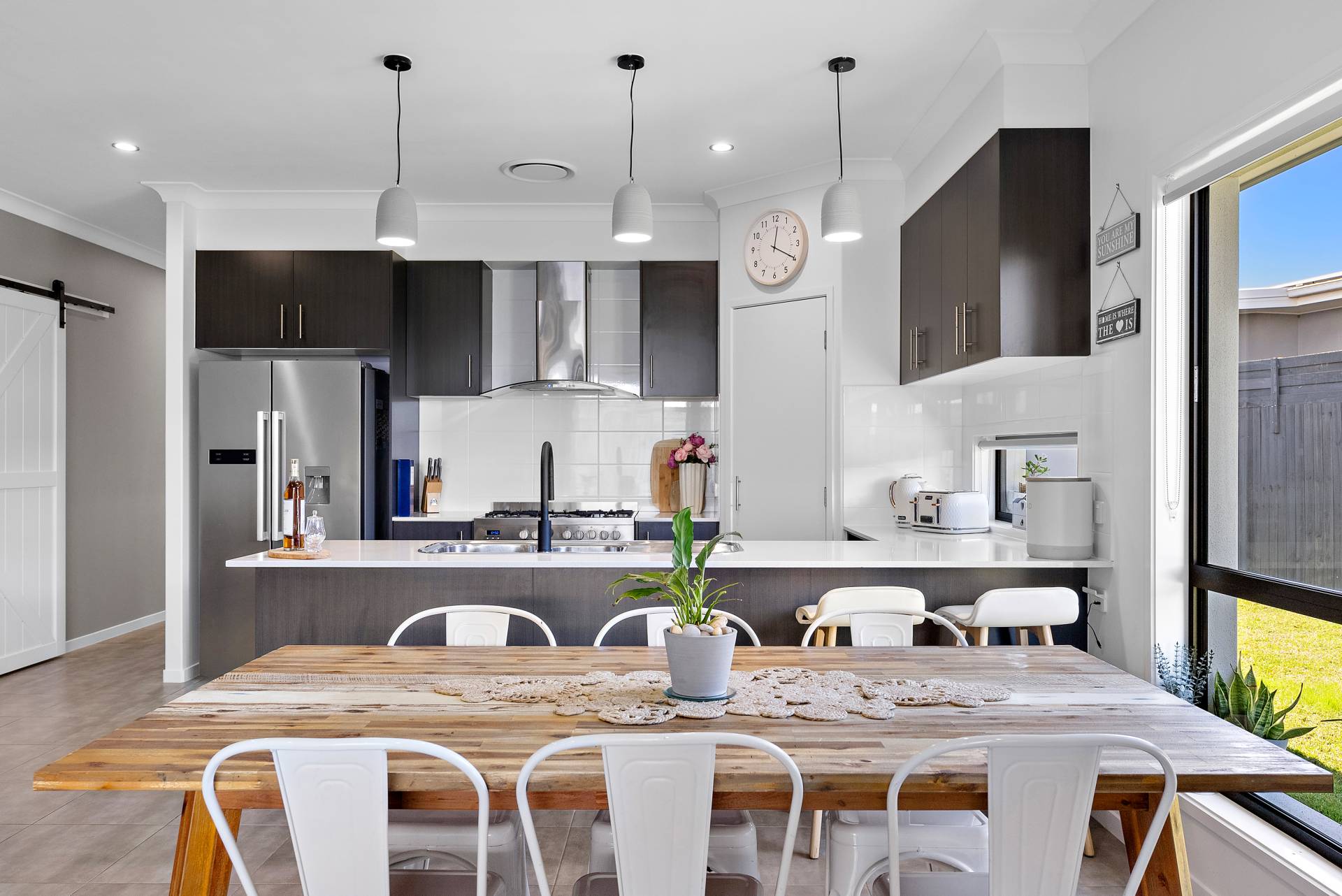 A stylish barn door with black hardware, set against a sage green feature wall, perfectly completes this living hub while sectioning off the further four bedrooms and main bathroom from the main living space.