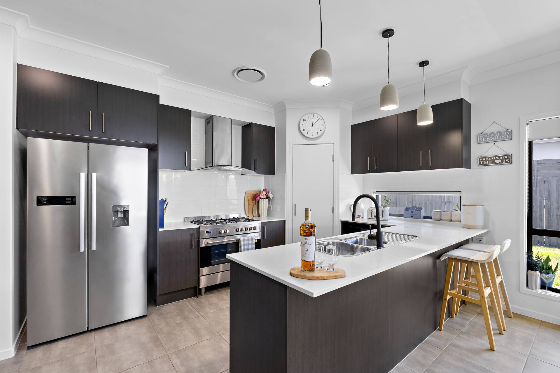 Where modern elegance meets functionality, 57 Birchgrove Circuit features an expansive open-plan living, kitchen, and dining area. With views of the large backyard, ample windows, and sliding stacker doors leading to the covered alfresco, this slice of paradise is designed for both relaxation and entertaining. This immaculate home showcases a moody colour palette while still welcoming natural light and openness. A feature wall enhances the inviting ambiance with warm, subtle texture in the lounge. The kitchen features dark wood-effect cabinetry with stunning pendant lighting over the breakfast bar. Boasting an oversized gas cooktop, elegant stone benchtops, a stainless steel dishwasher, and ample storage space for all your culinary needs, this is the perfect space for cooking and entertaining.