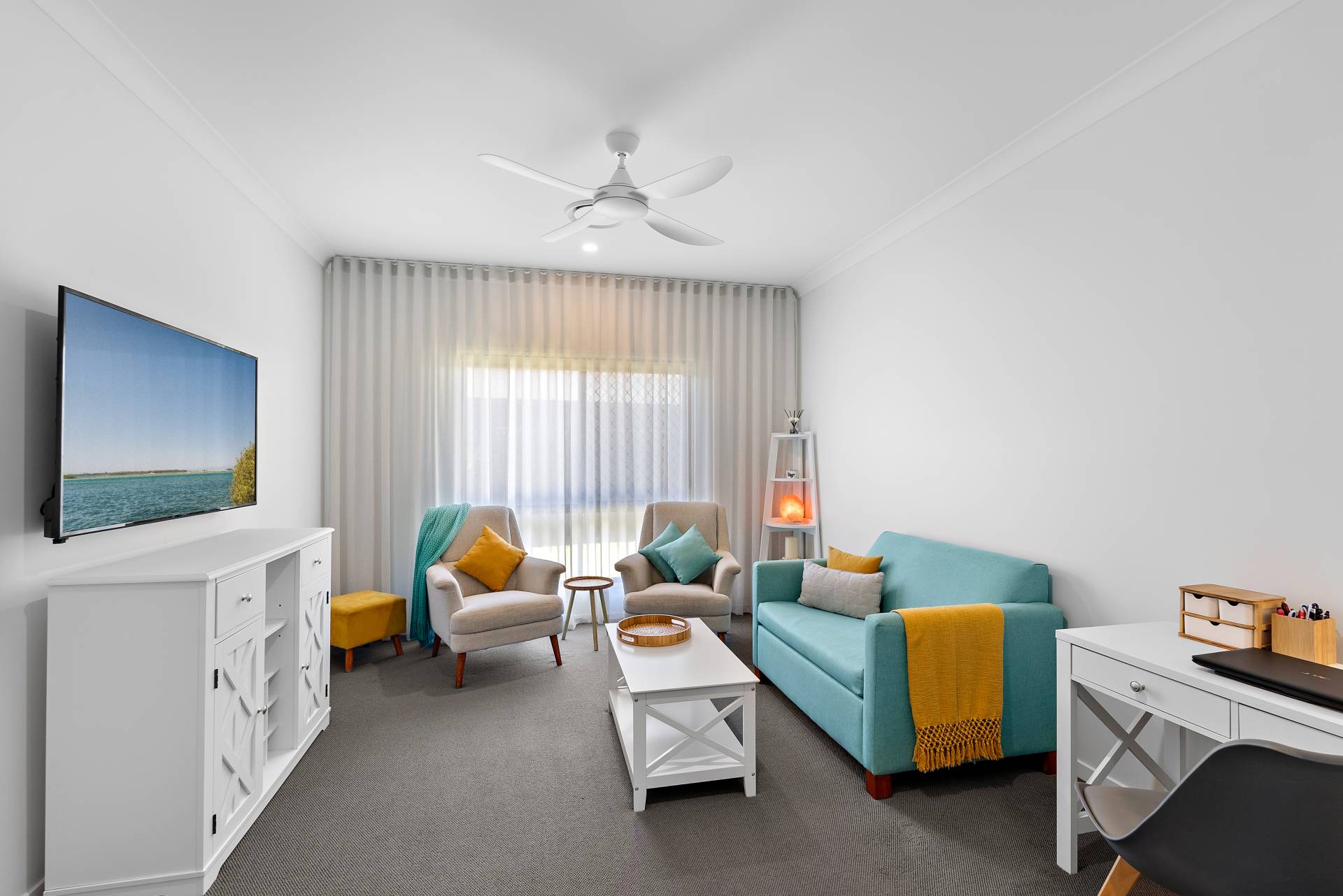 - Dedicated media room with roller blinds and floor-to-ceiling sheer curtains