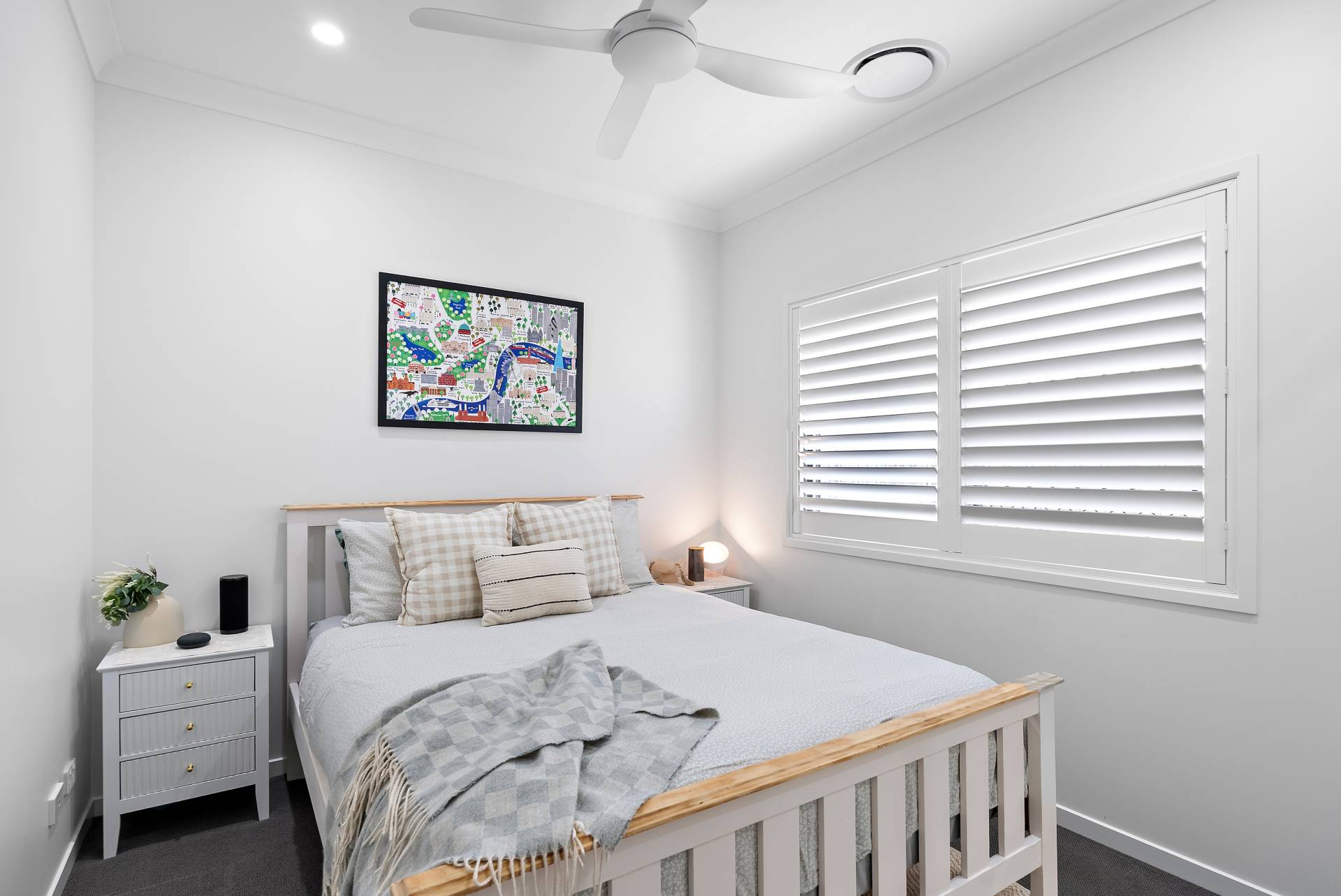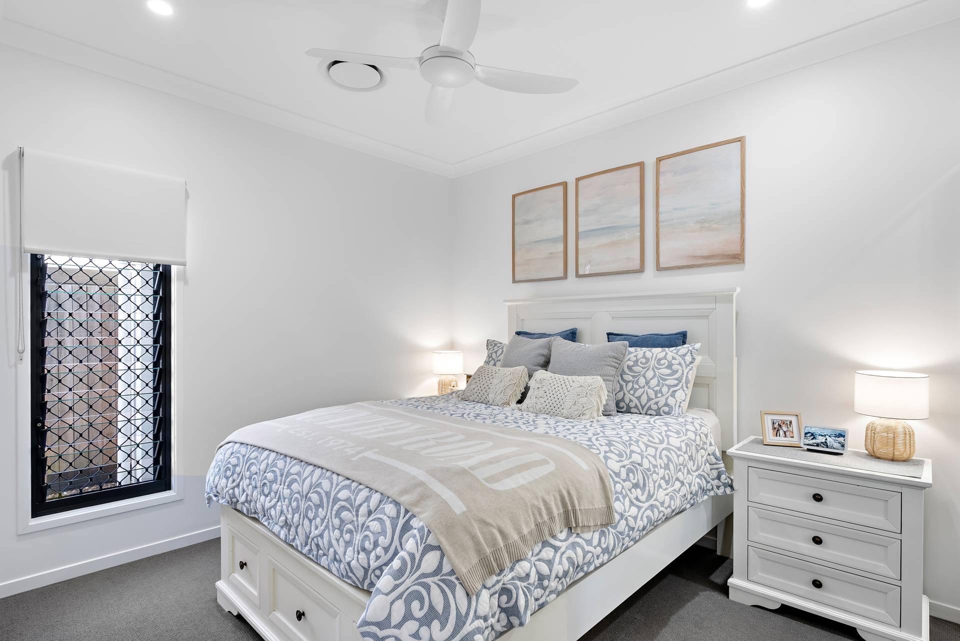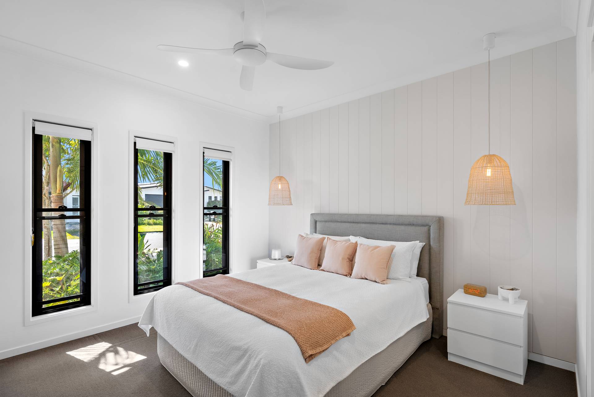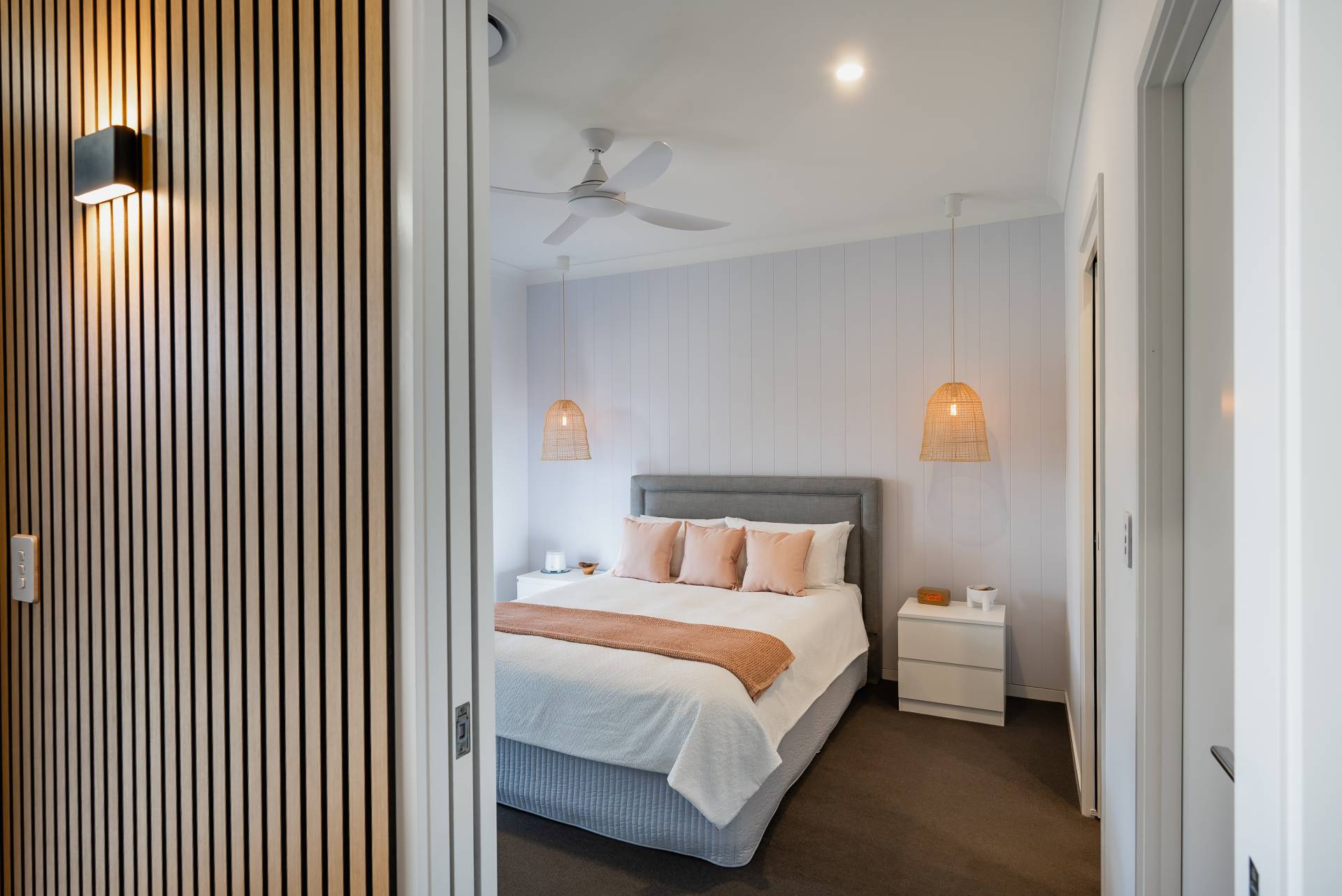 - Luxurious master suite with a VJ panel feature wall and pendant bedside lighting
