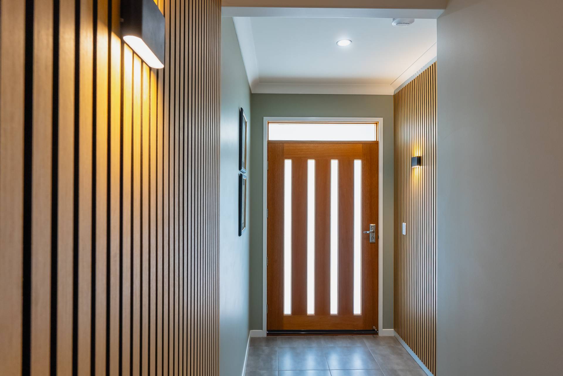 - Elegant entry featuring a large timber front door, panelled walls, and feature lighting