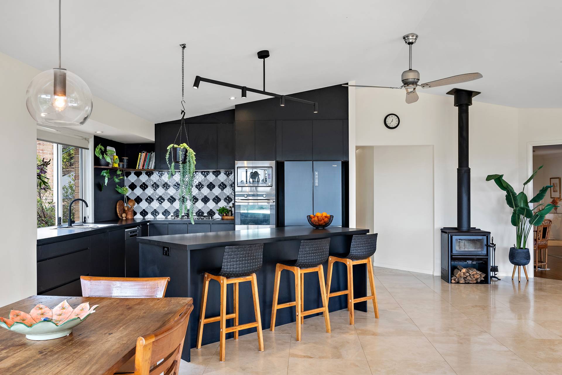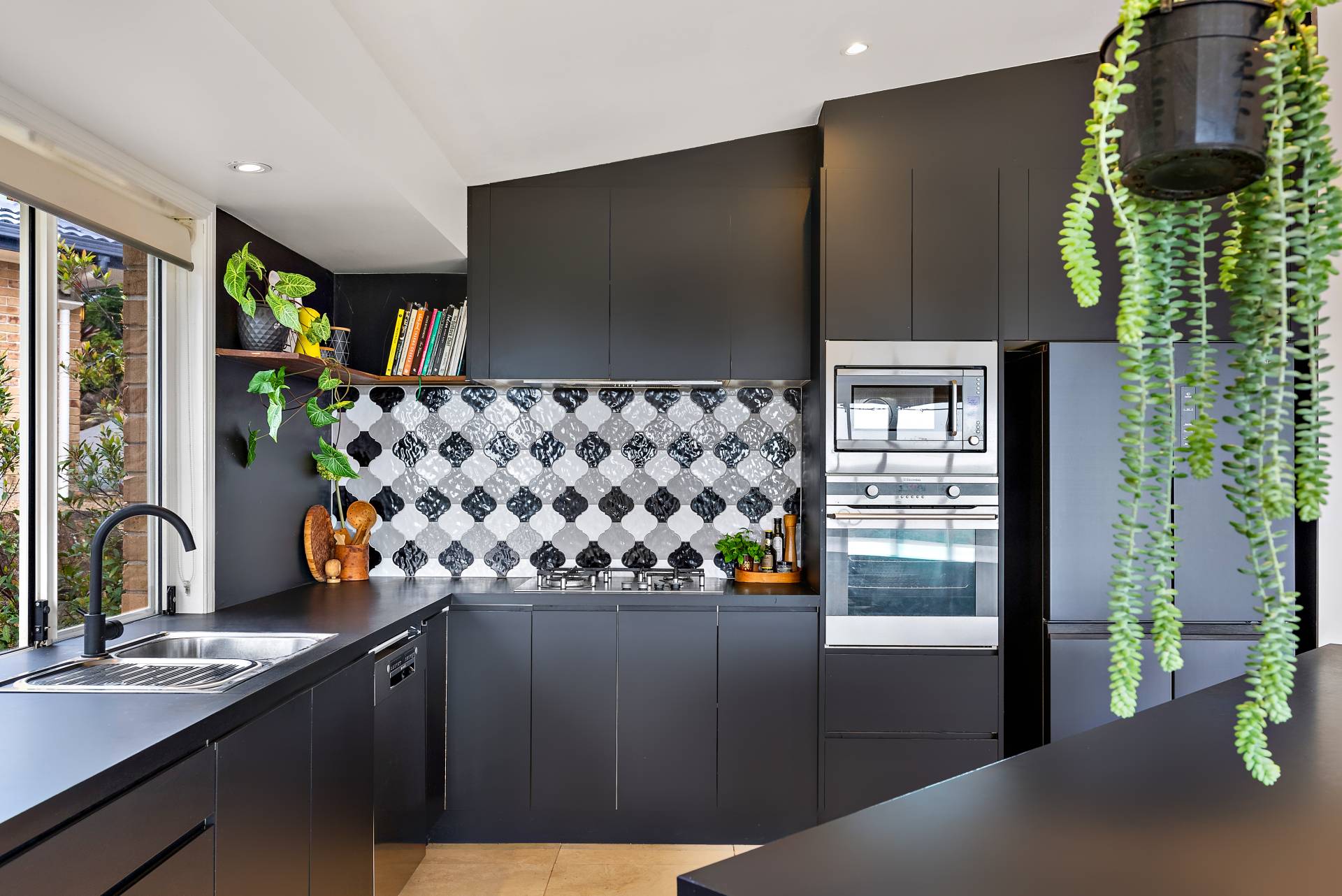 - Contemporary kitchen with custom black cabinetry and benchtops, feature tiling, stainless appliances and double wall oven