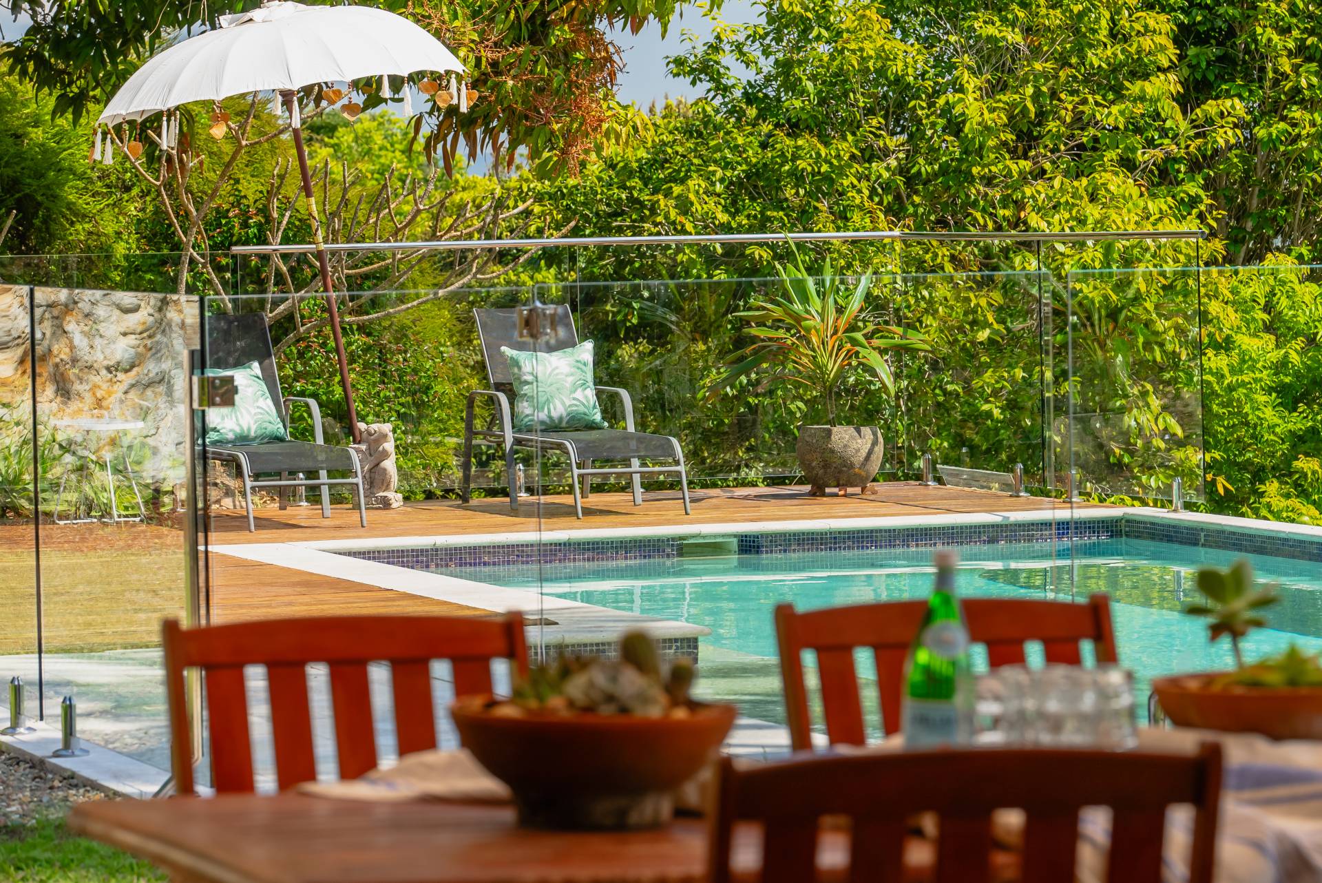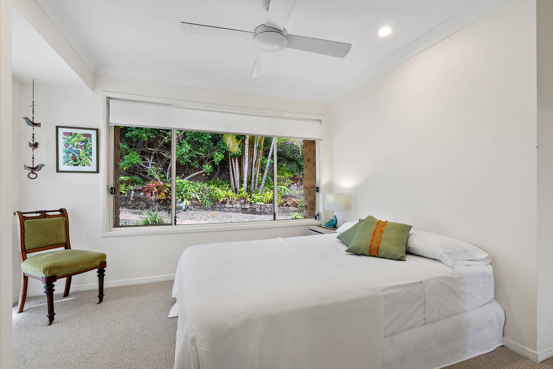 Landscaped gardens feature a mix of level lawns and tiered beds, tropical plants and established fruit trees. Mangos, bananas and limes all grow in abundance here, and wallabies and kookaburras are regular visitors.