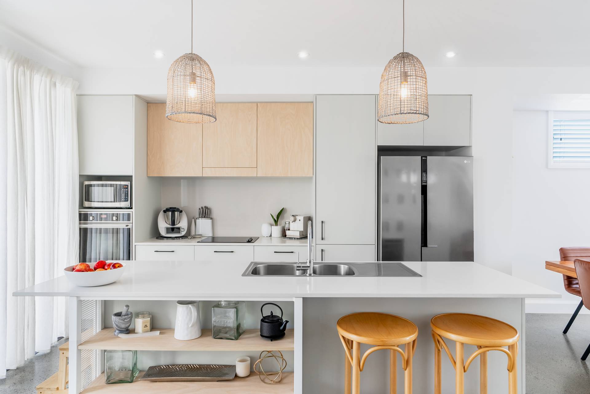 - Modern kitchen with quality appliances, bespoke cabinetry, pendant lighting, breakfast bar, inbuilt sink and reconstituted stone bench-tops