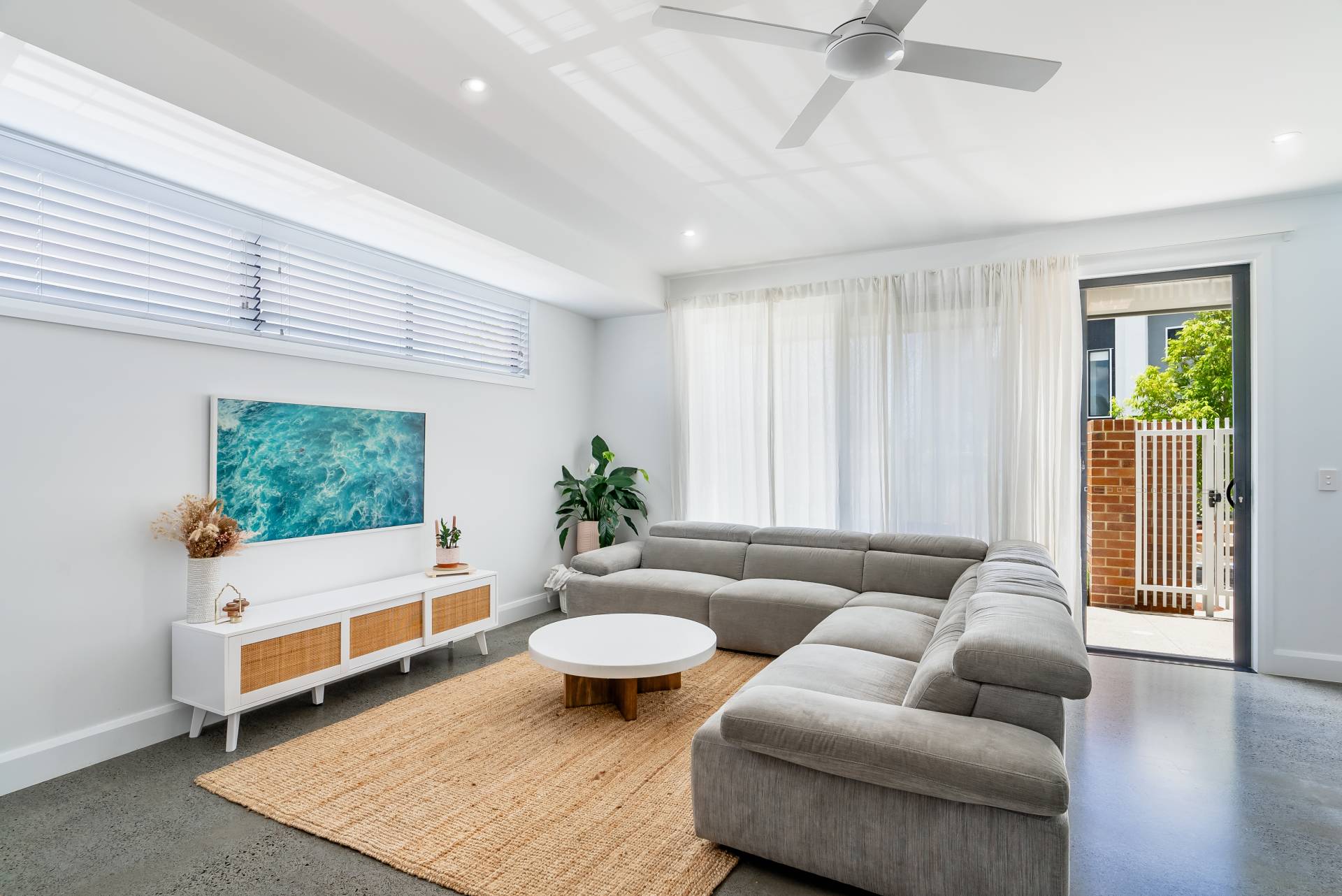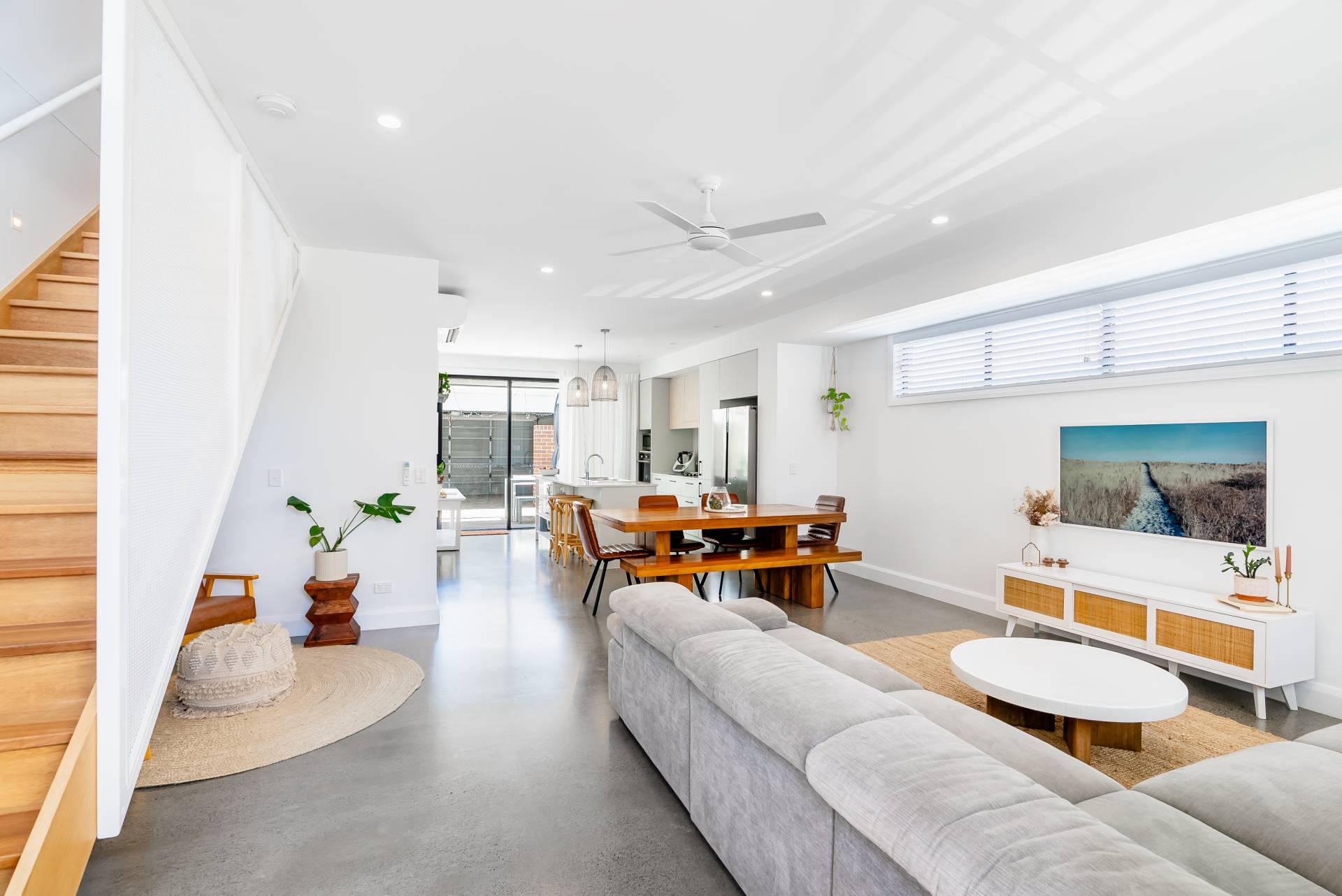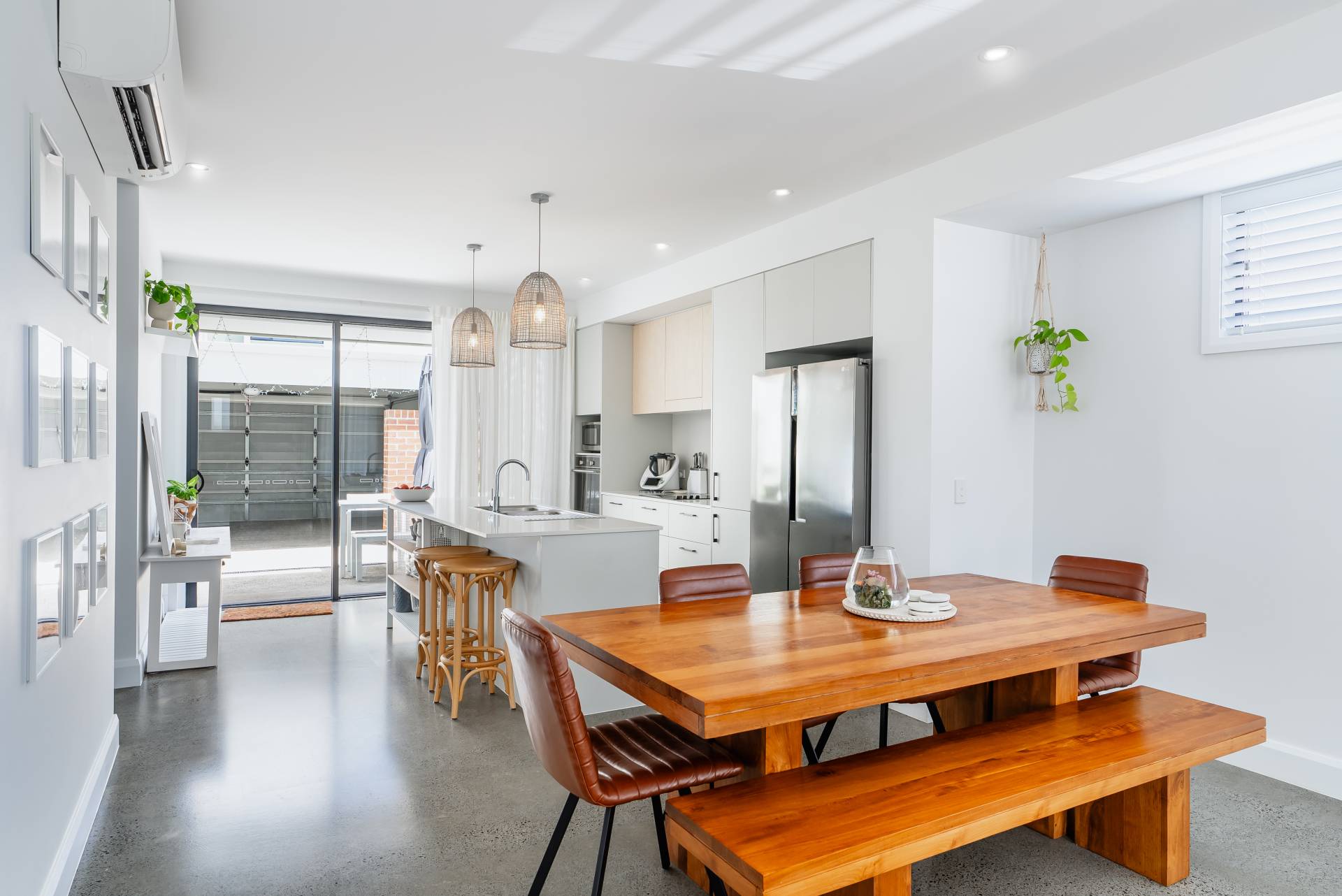 - Impressive open-plan living, kitchen and dining with polished concrete flooring and a charming coastal ambiance