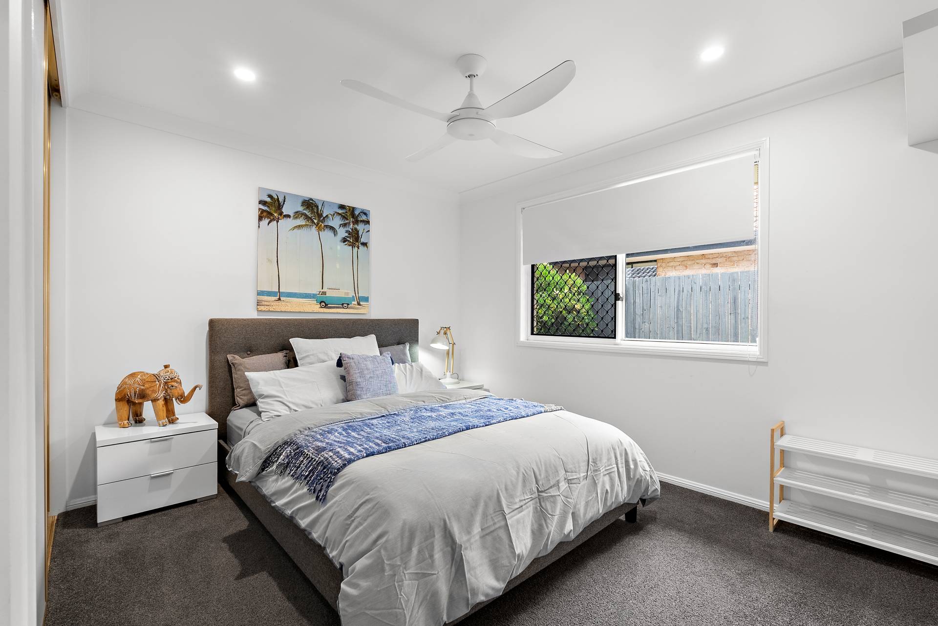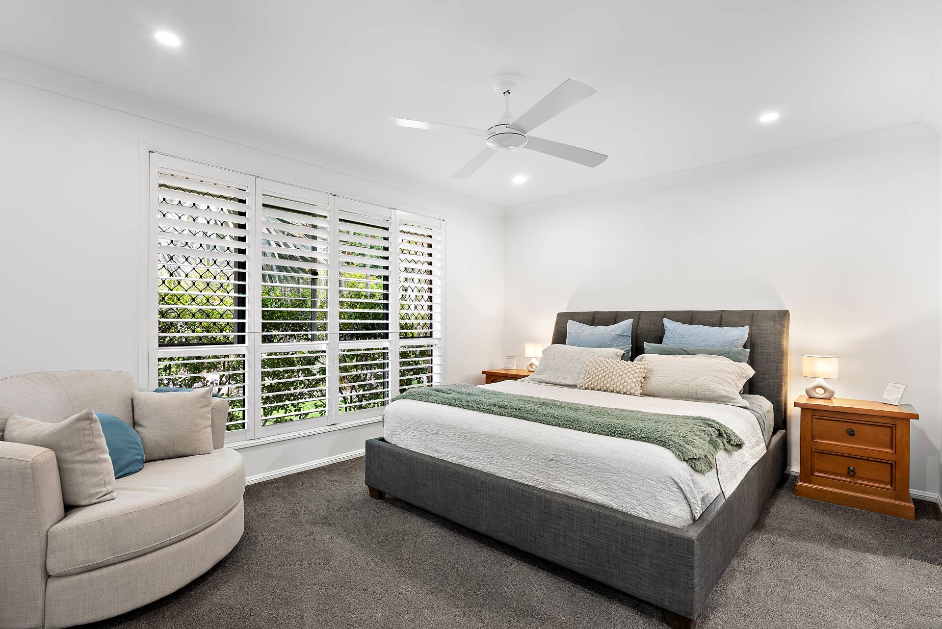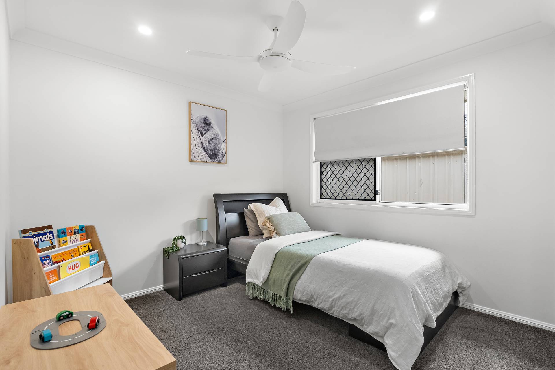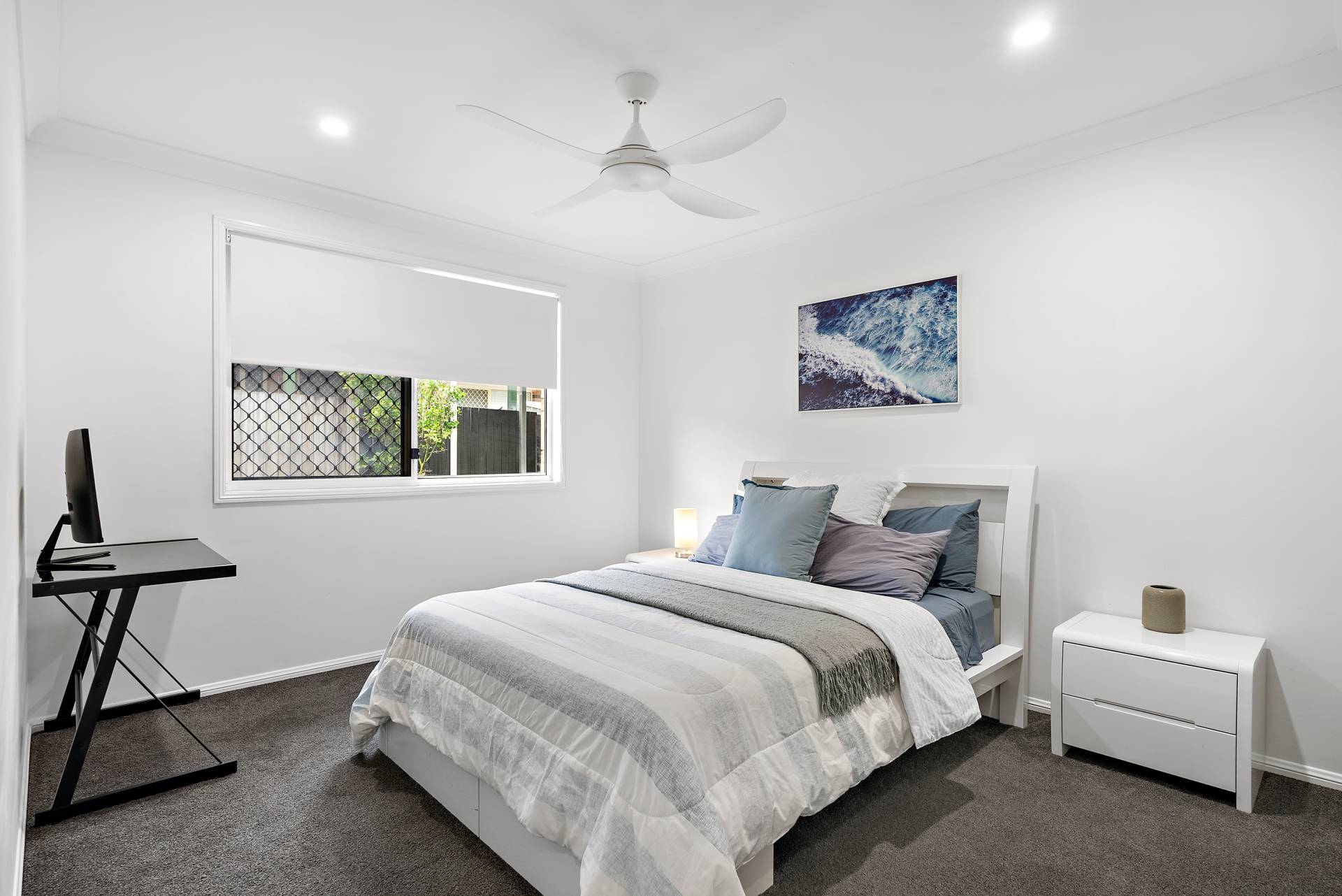 Additional three bedrooms conveniently located in a separate wing, each featuring built-in robes and ceiling fans, all with large windows adorned with blinds.