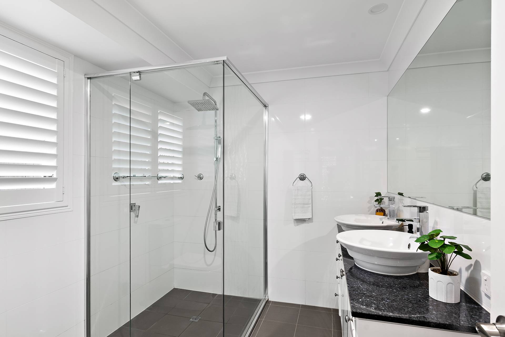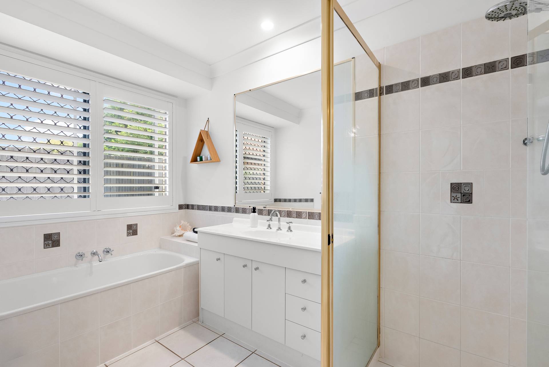 Main bathroom with large bathtub under window with plantation shutters, rainfall and adjustable shower heads and separate toilet