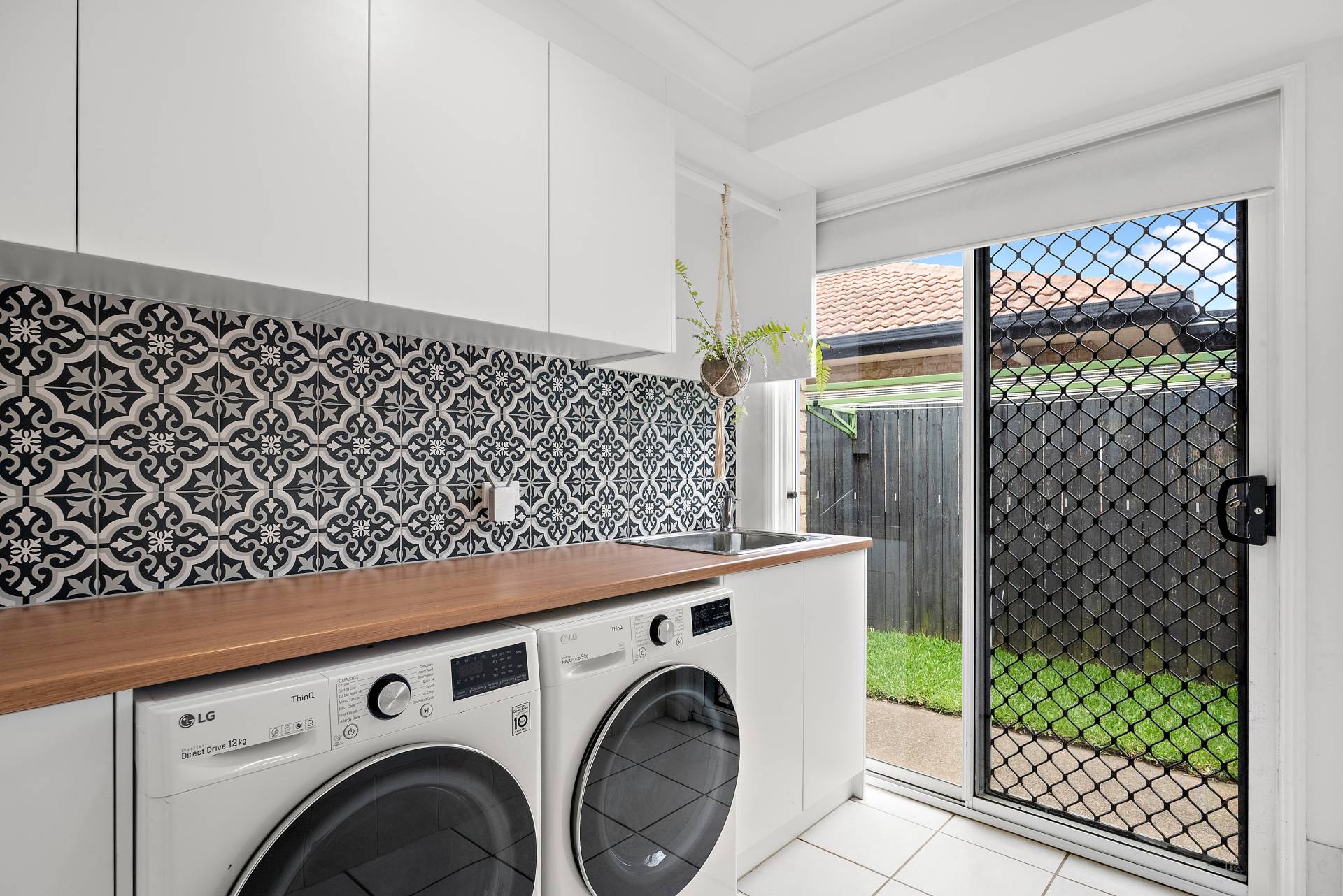 Laundry with ample storage, bench space and hanging rail, ideally positioned with direct access to the outdoor drying area