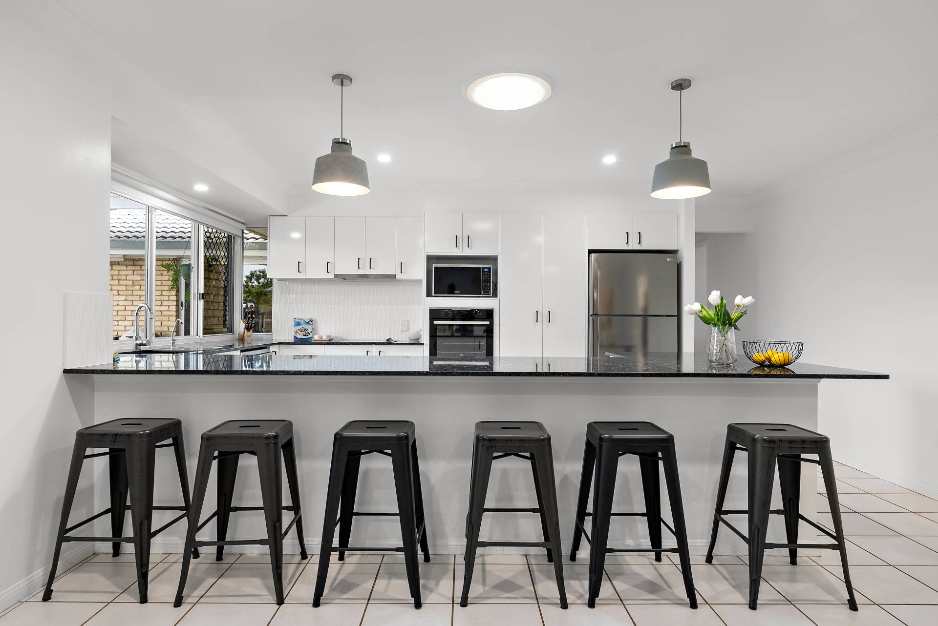 Modern kitchen with stone bench tops, bespoke cabinetry, black hardware and quality appliances, pendant lighting over the large breakfast bar and serving window to the alfresco outside