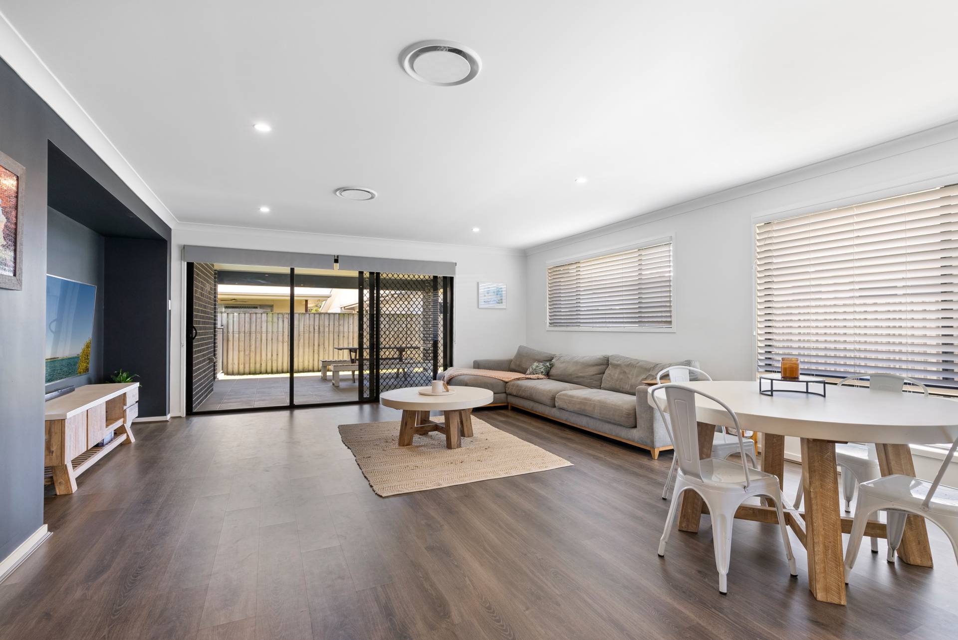 - Open-plan kitchen, dining and lounge with large windows and three-stacker glass sliding doors