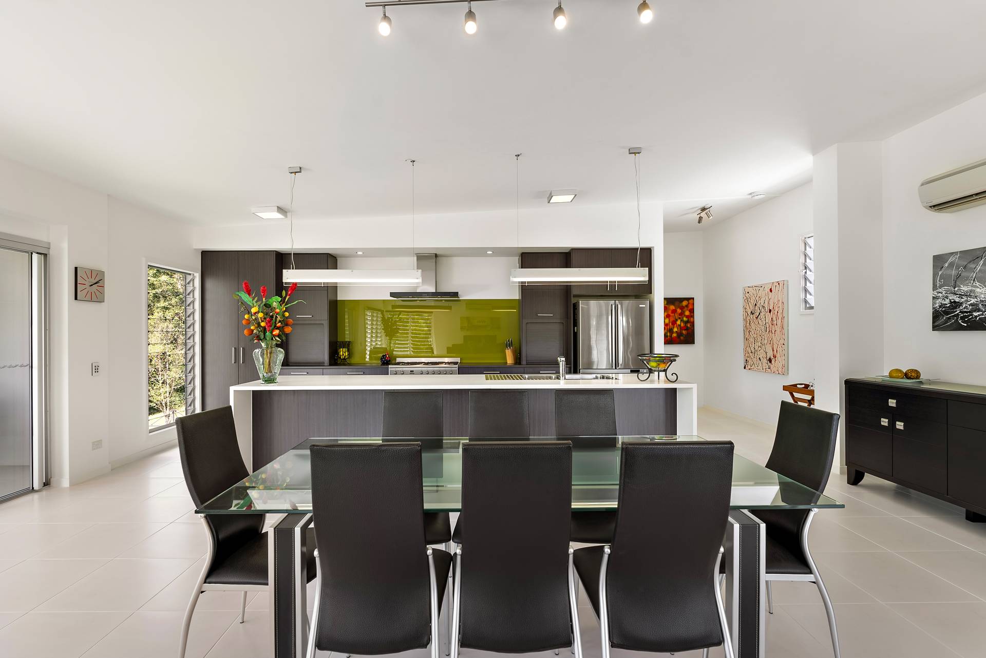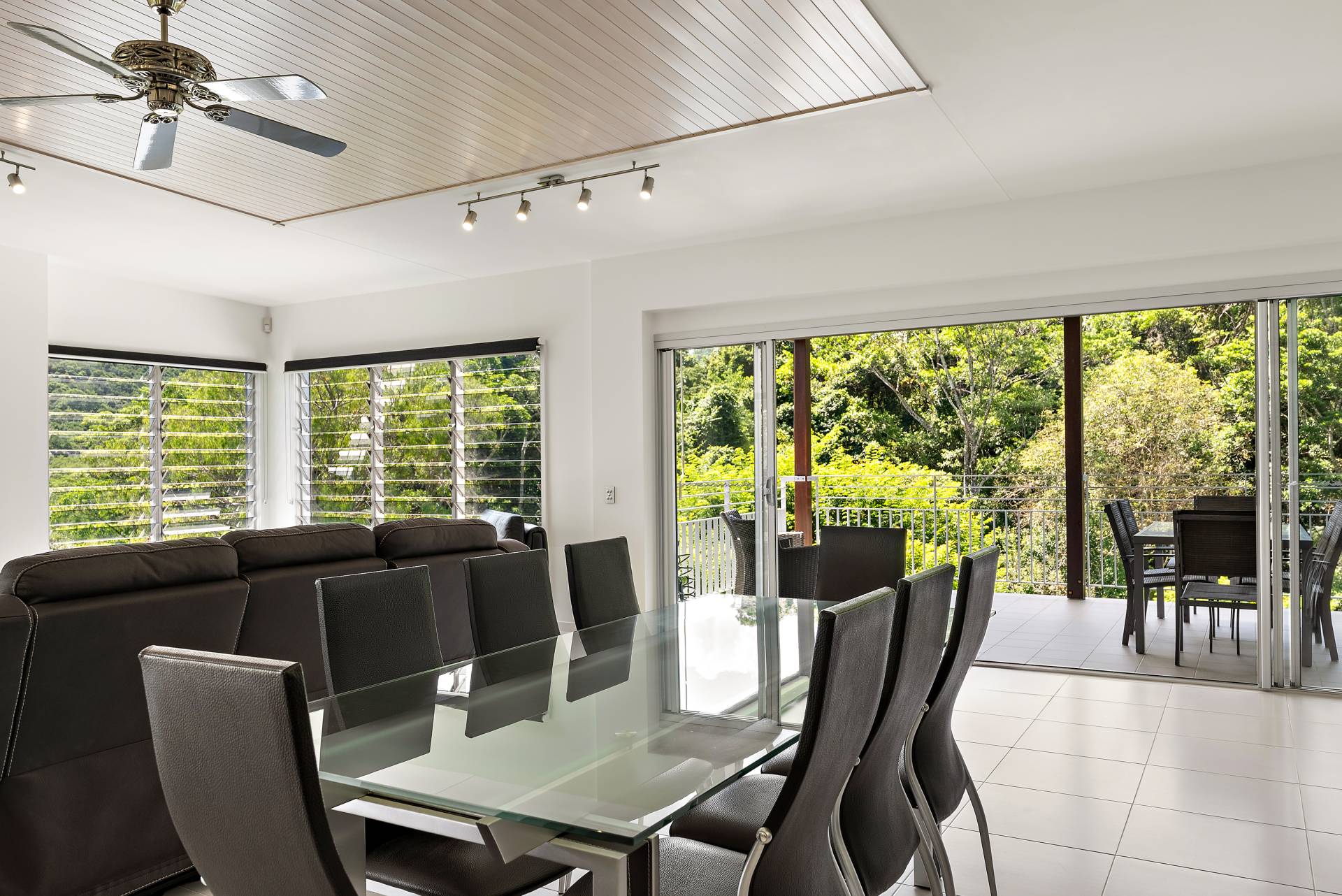 - Large central living/dining space opening on two sides to alfresco decks