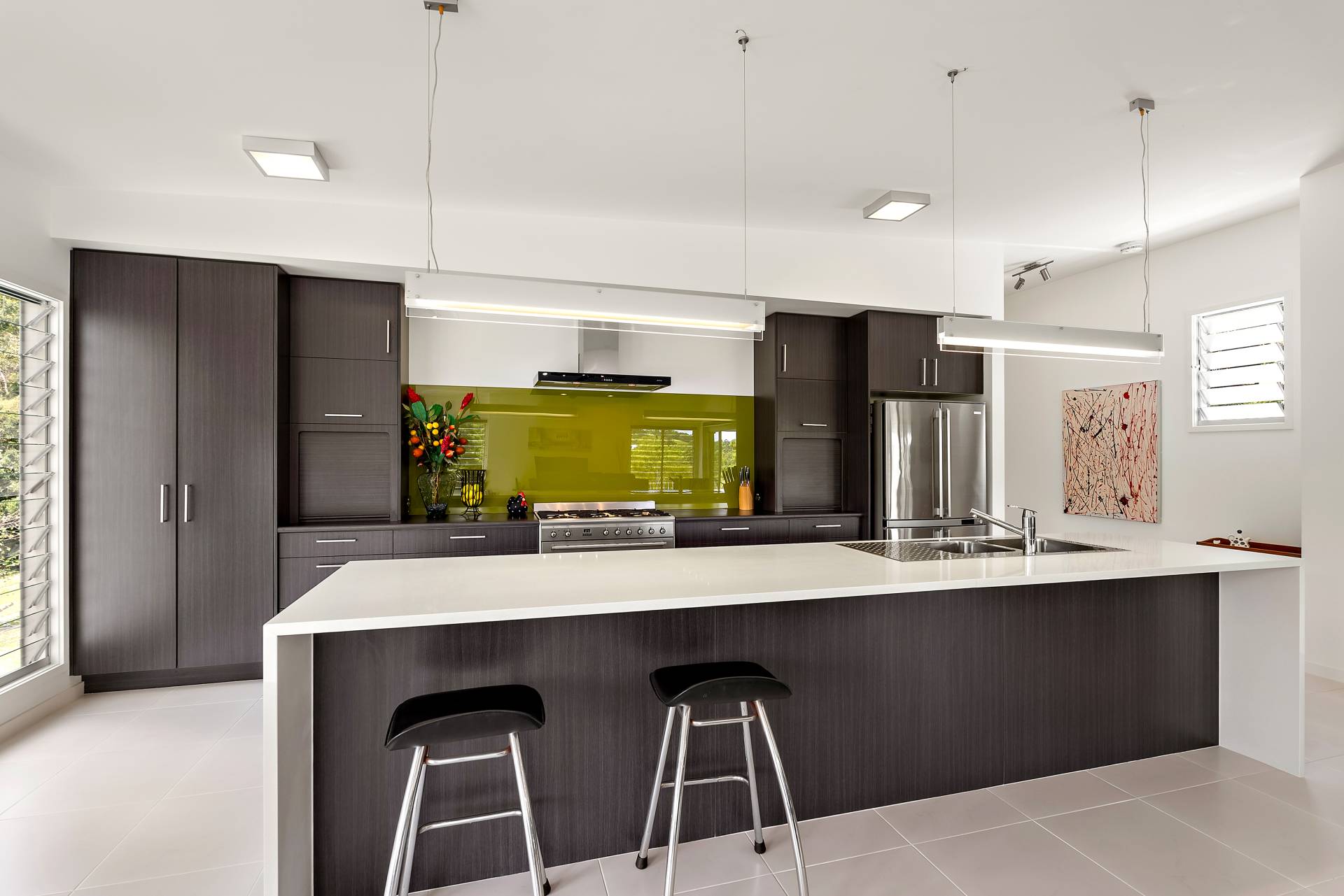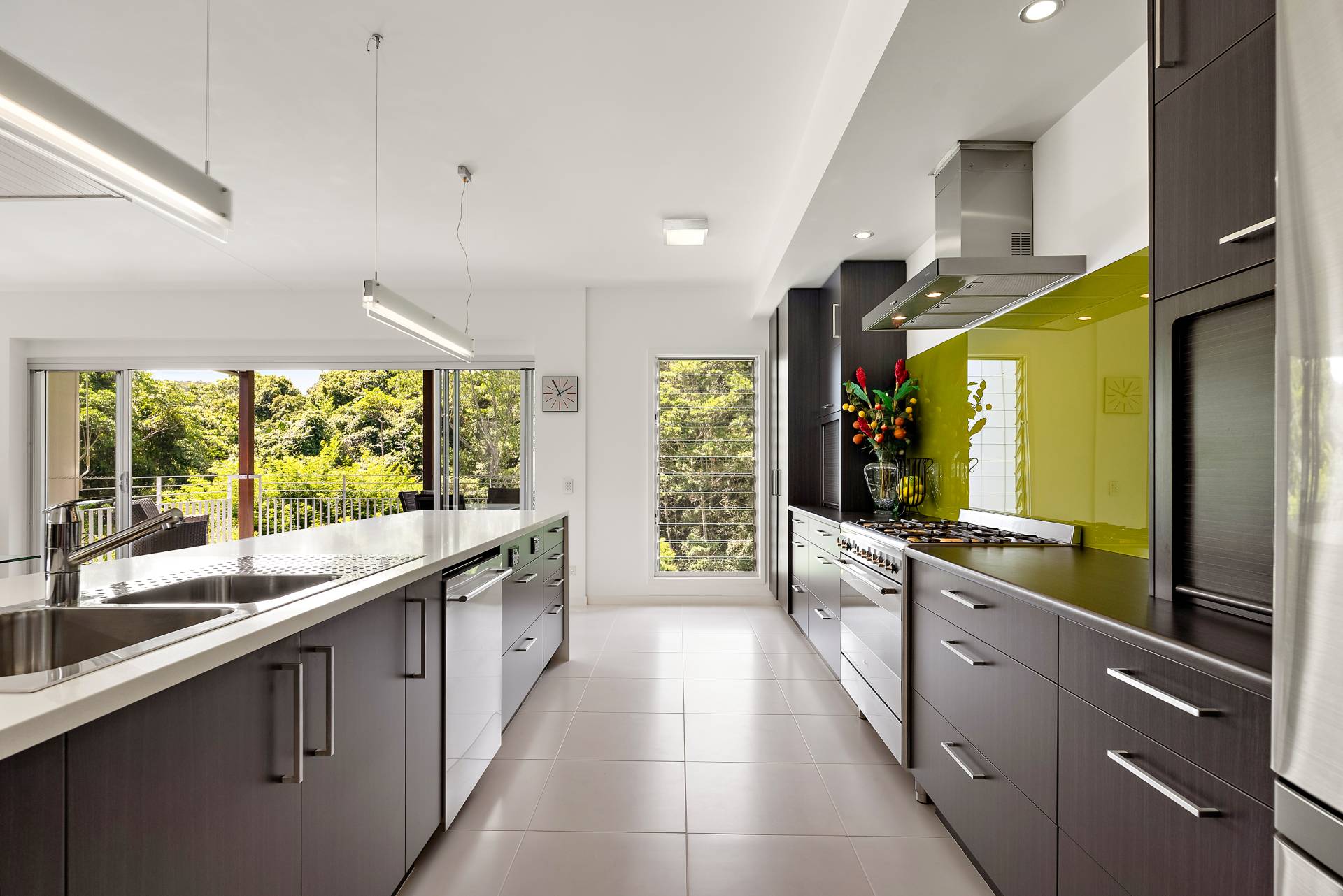 - Contemporary kitchen with sit-up island, Caesarstone benchtop, custom cabinetry, 900mm Smeg oven with gas hob, double sinks and pull-out pantry storage