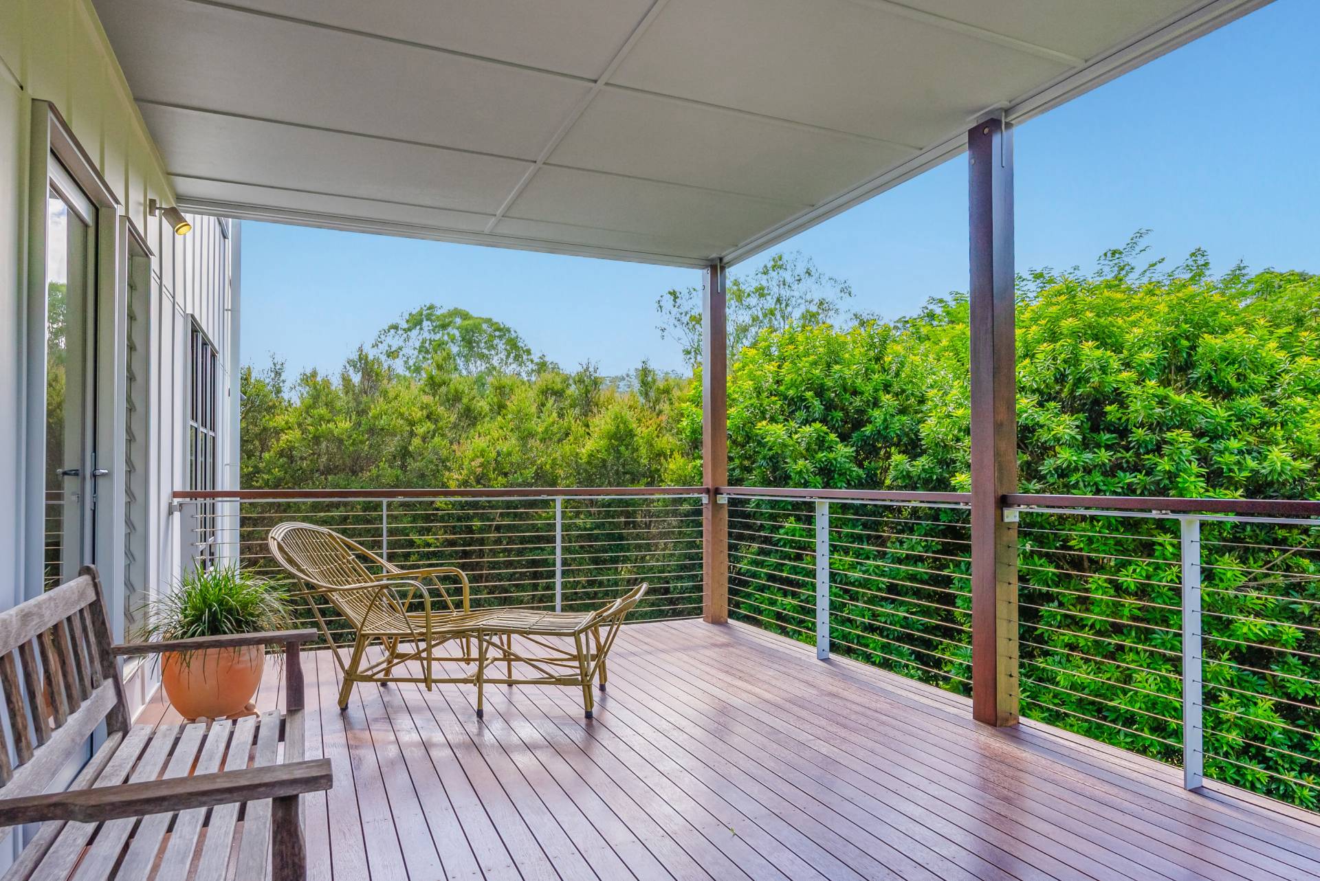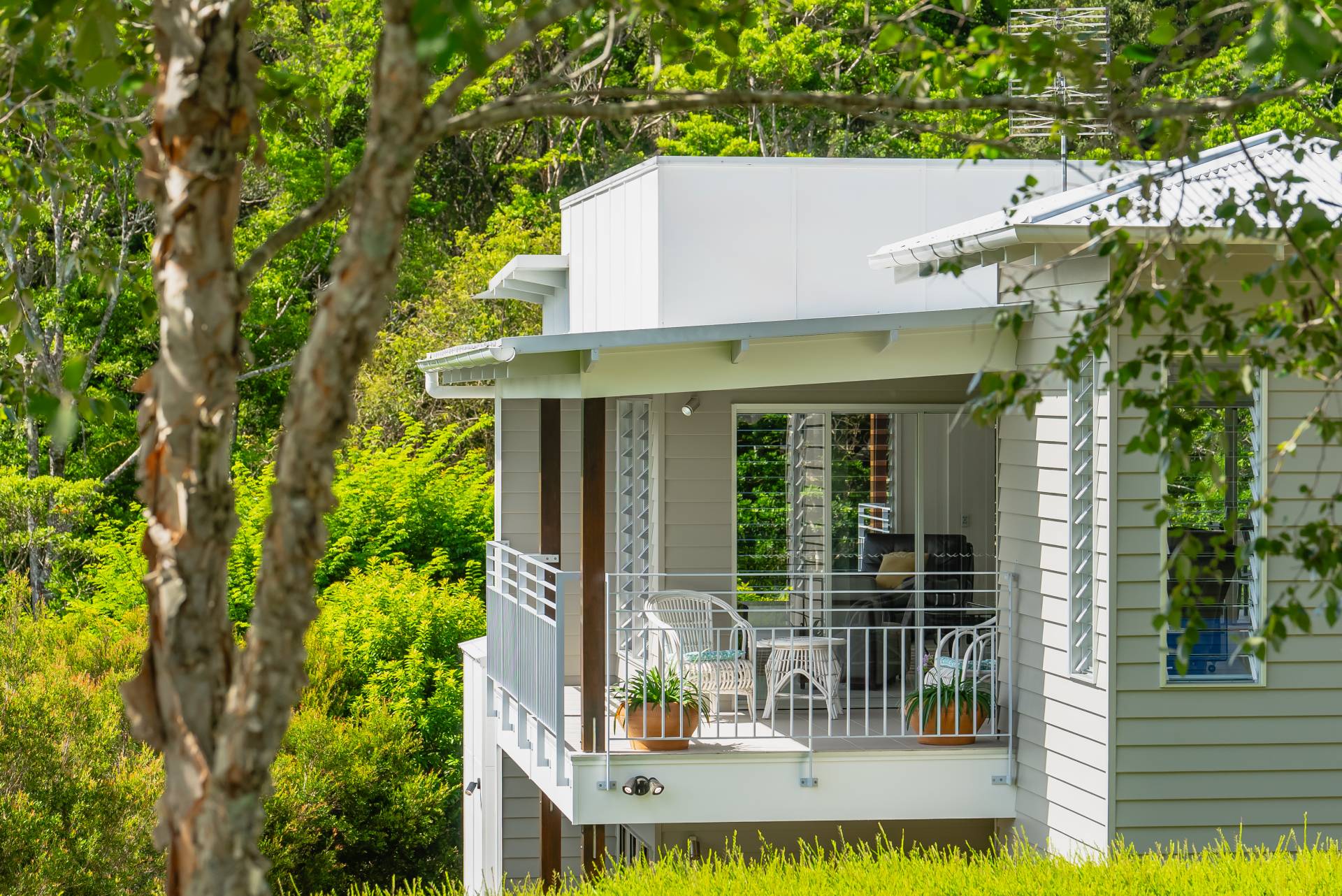 Outside, the gardens encompass an acre of cleared lawns and sheltering trees set against a stunning rainforest backdrop. Perfect for children and pets to explore, there's space for veggie beds and fruit trees here, and a delightful creek runs through the bottom of the property.