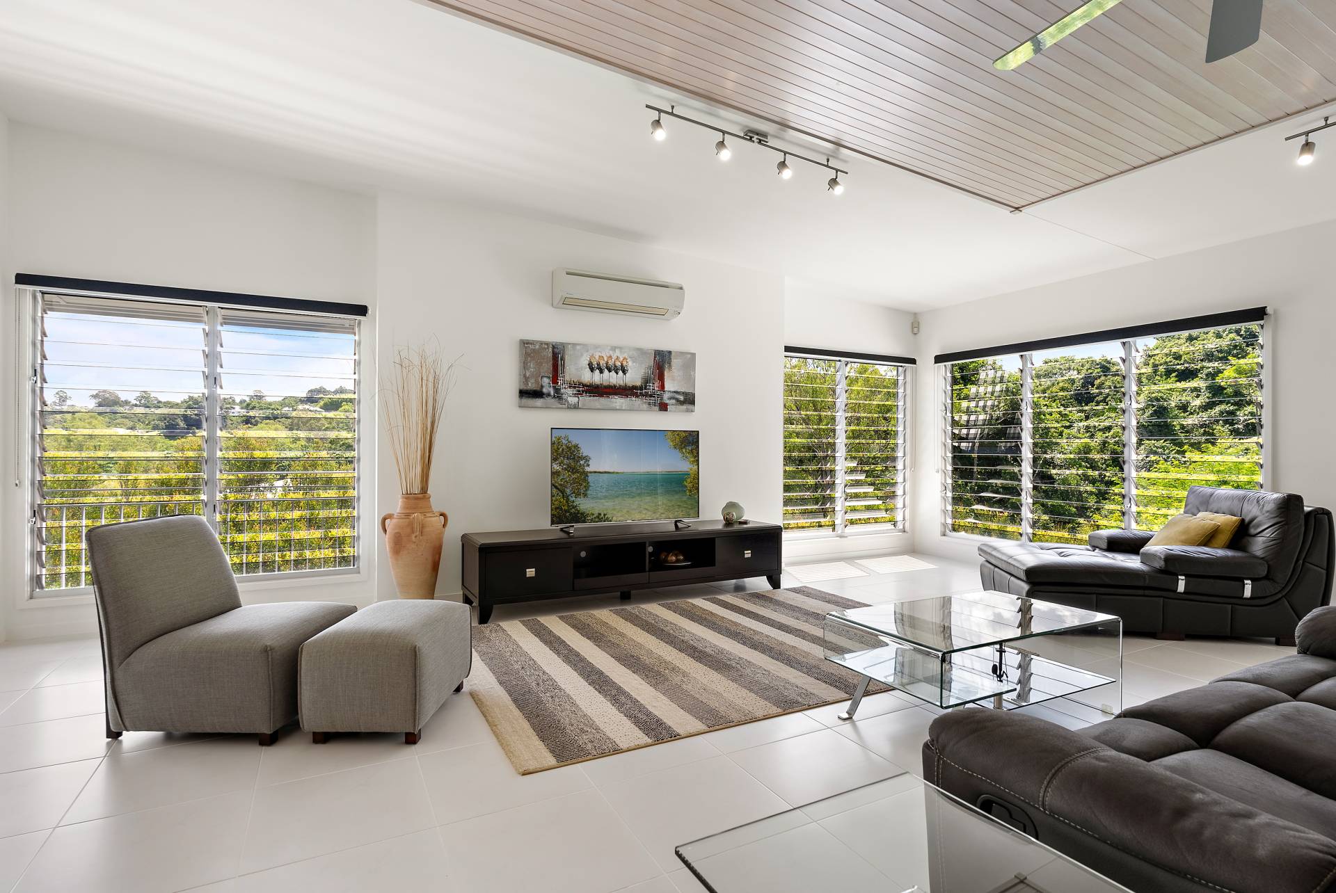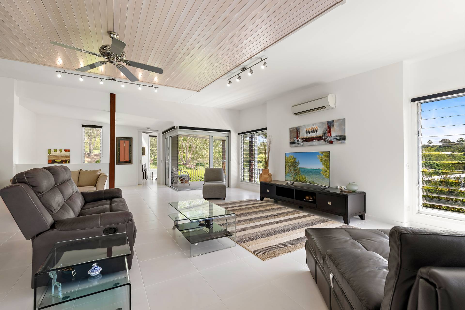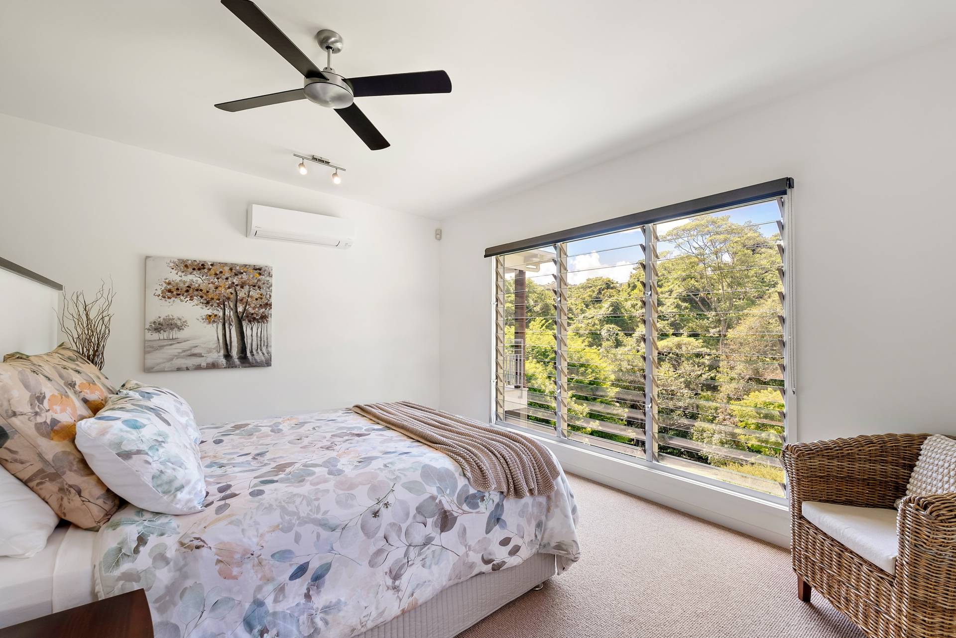 Louvred windows and ceiling fans throughout allow for constant airflow, while cooling is ensured through split-system air conditioning.