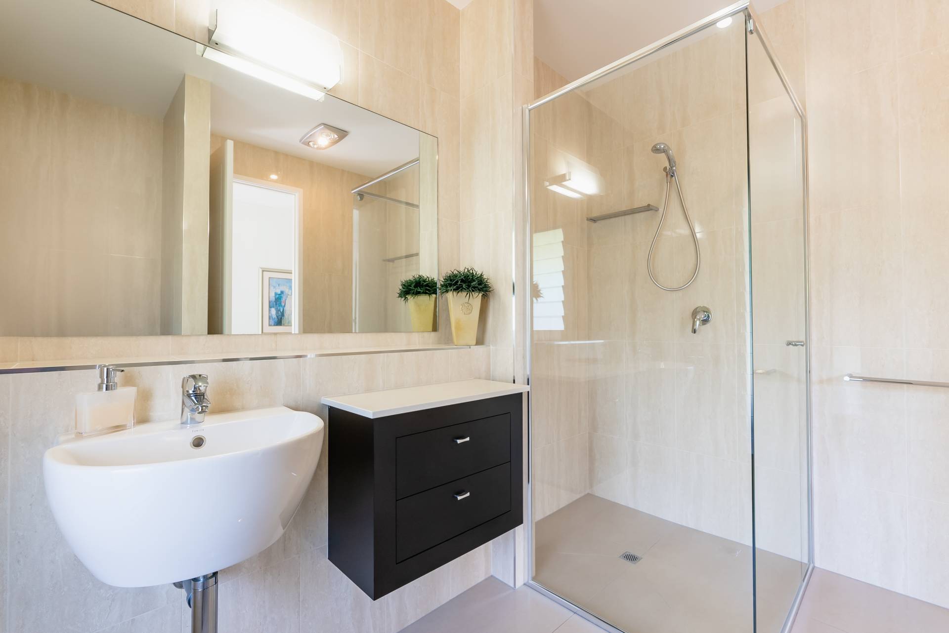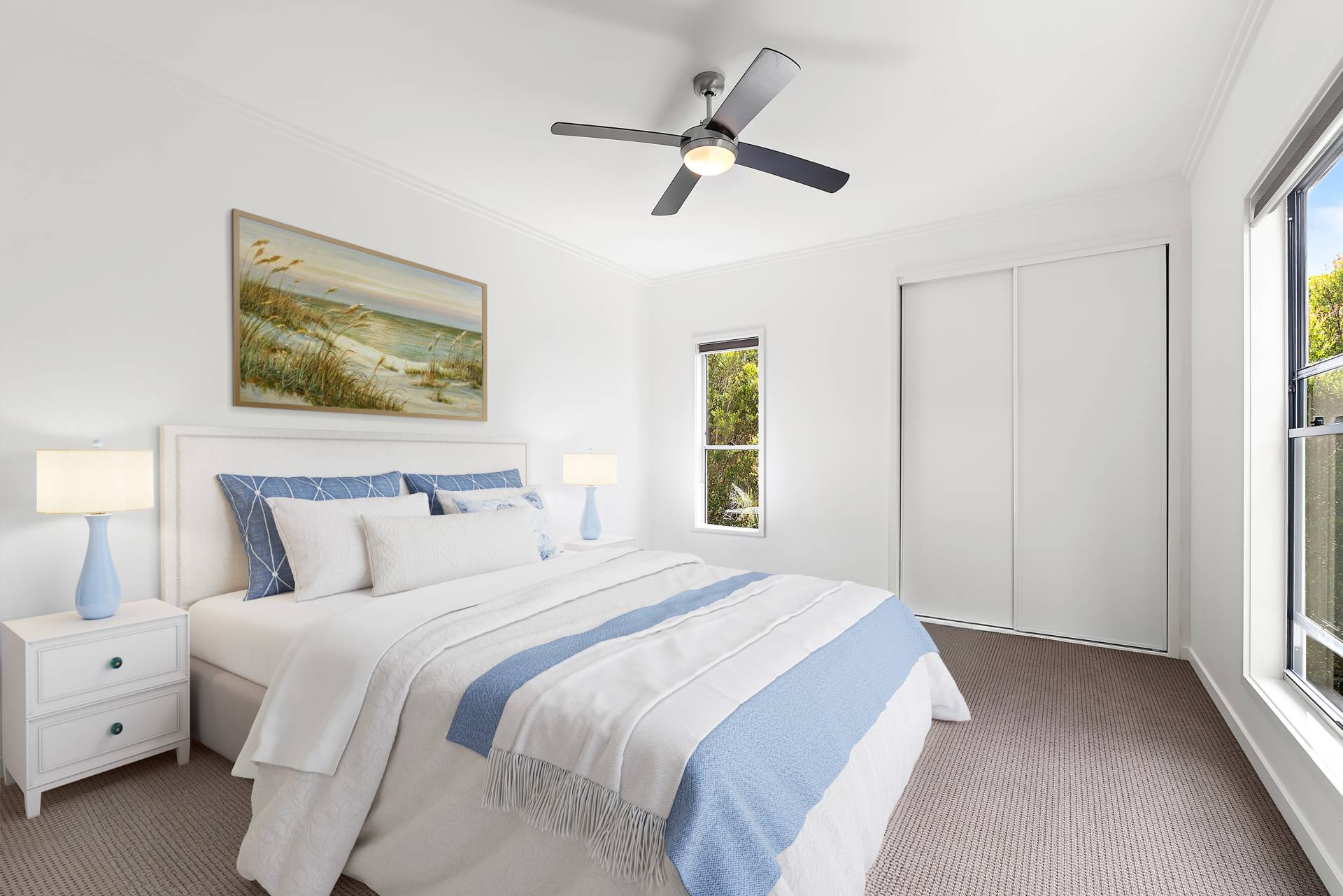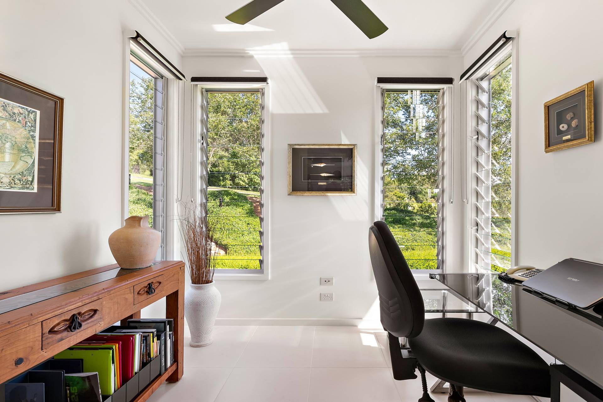 Louvred windows and ceiling fans throughout allow for constant airflow, while cooling is ensured through split-system air conditioning.