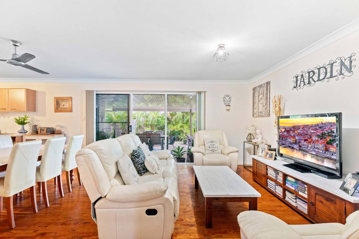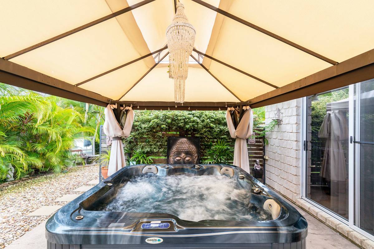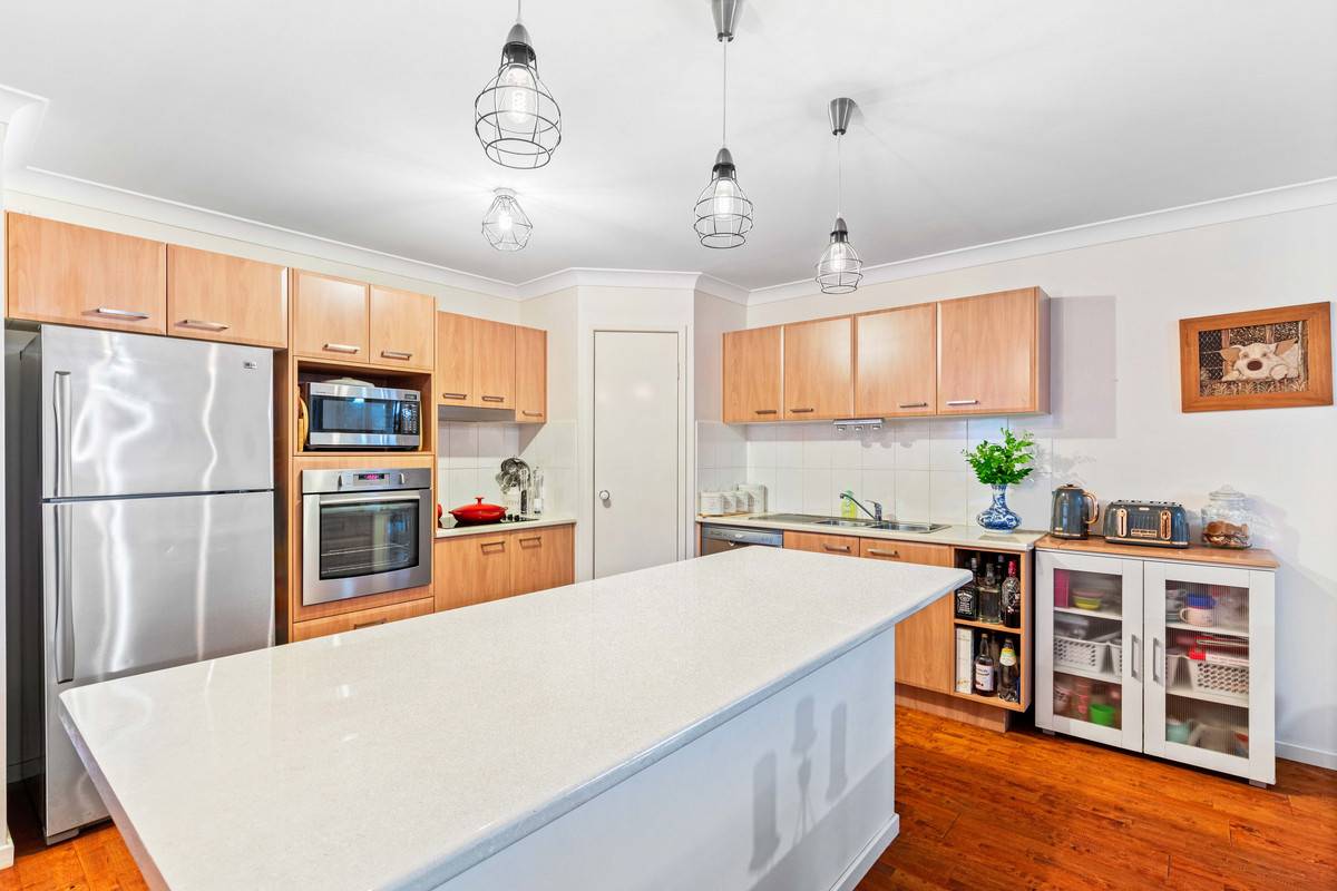 The entrance hallway opens to a large living room and leads through to a contemporary kitchen complete with stainless steel appliances and sit-up island. The kitchen flows into the central dining/living area and out to a private and leafy covered entertainment space and spa bath. Looking for a pool? There’s excellent access and scope to install one here.
