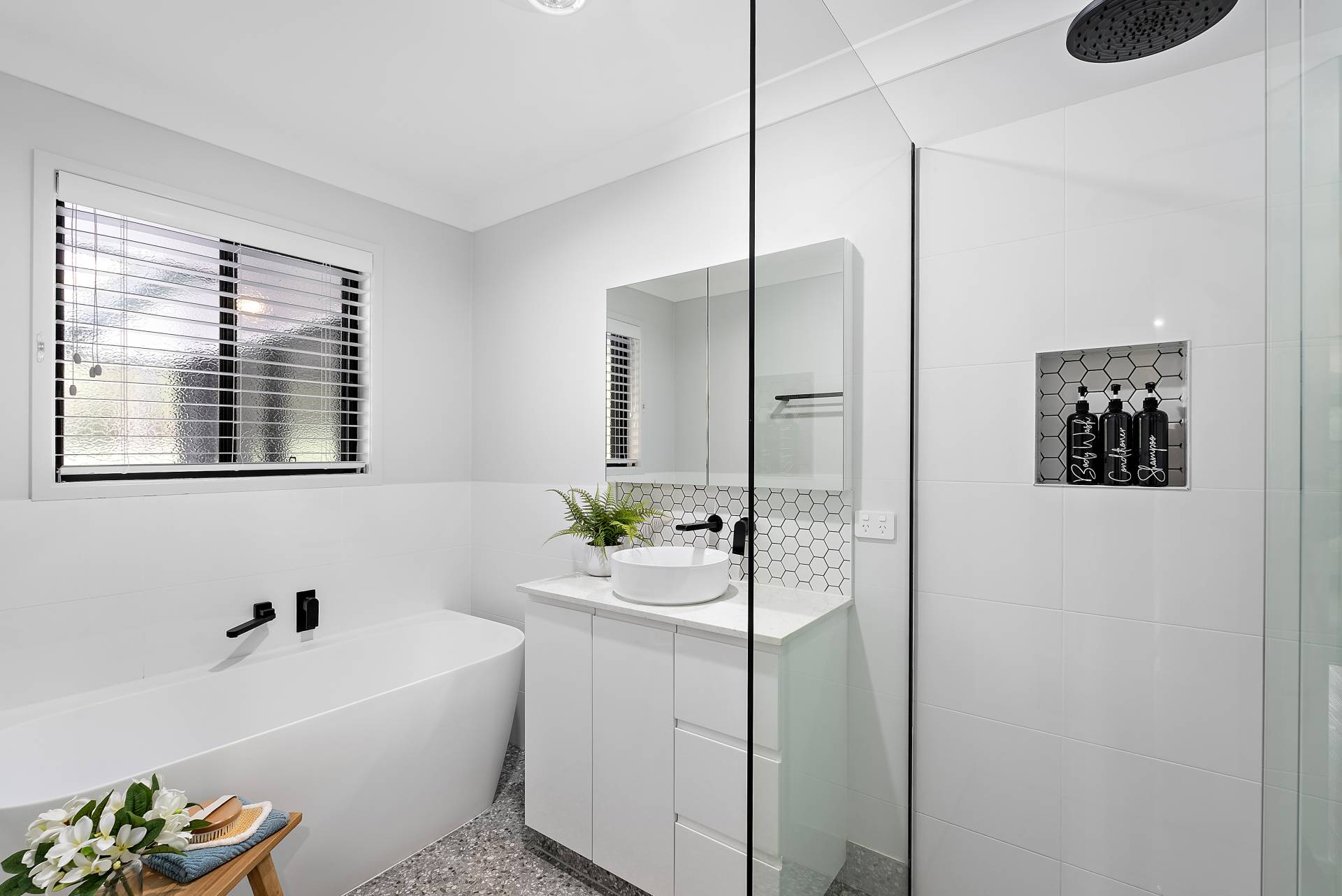 At one end of the house are four queen bedrooms, including a spacious master encompassing walk-in wardrobe and chic double-vanity ensuite, plus a stylish family bathroom with standalone tub.