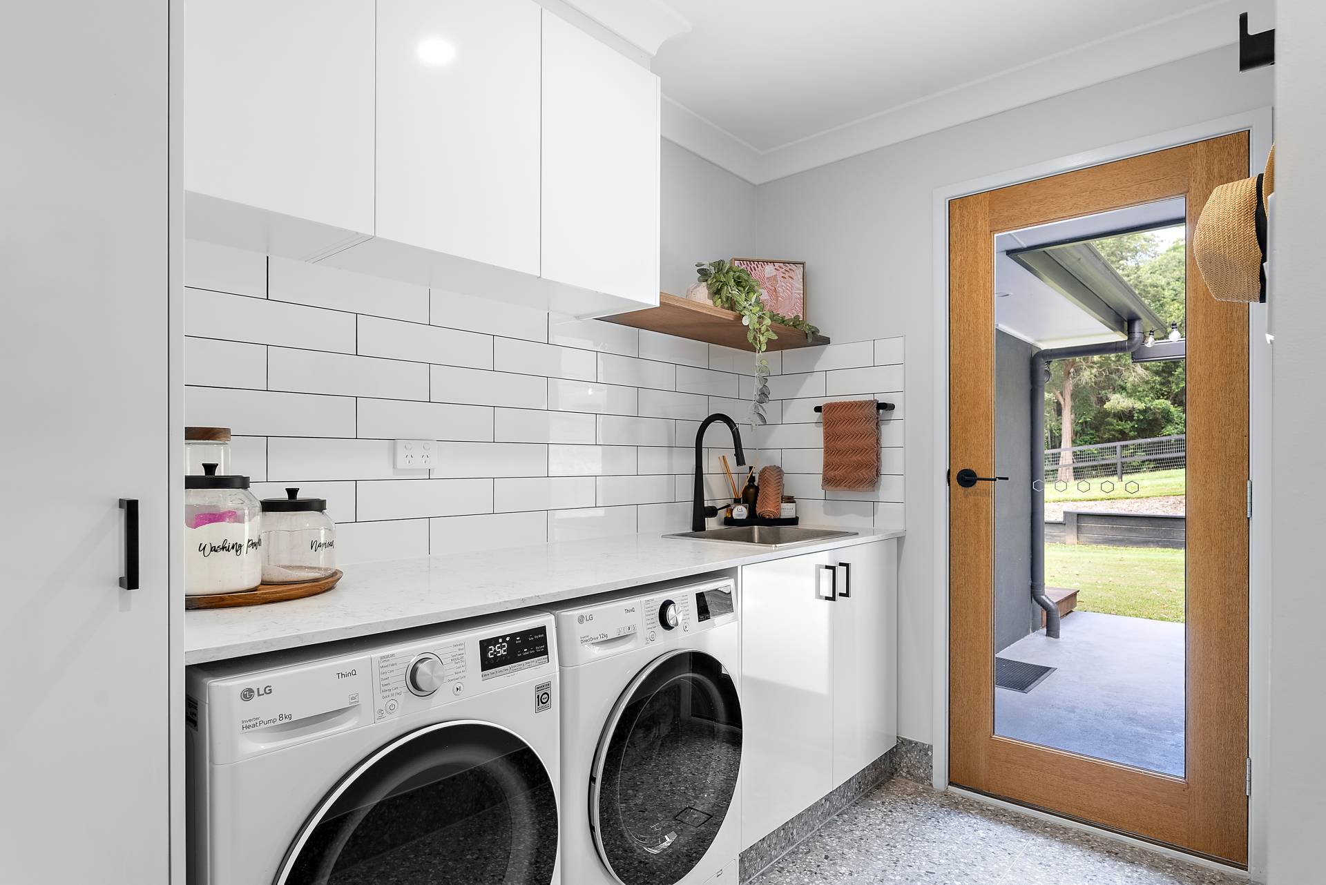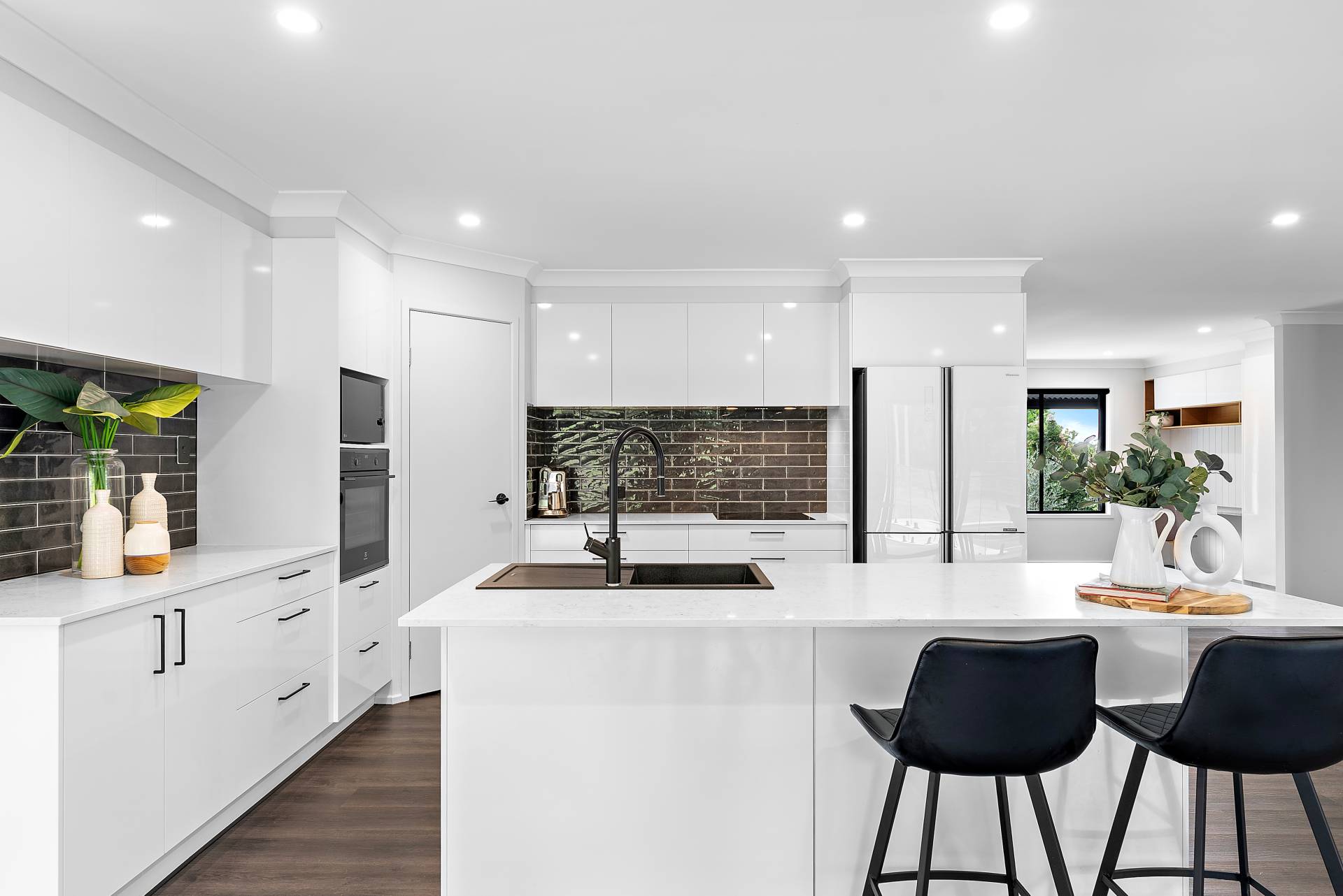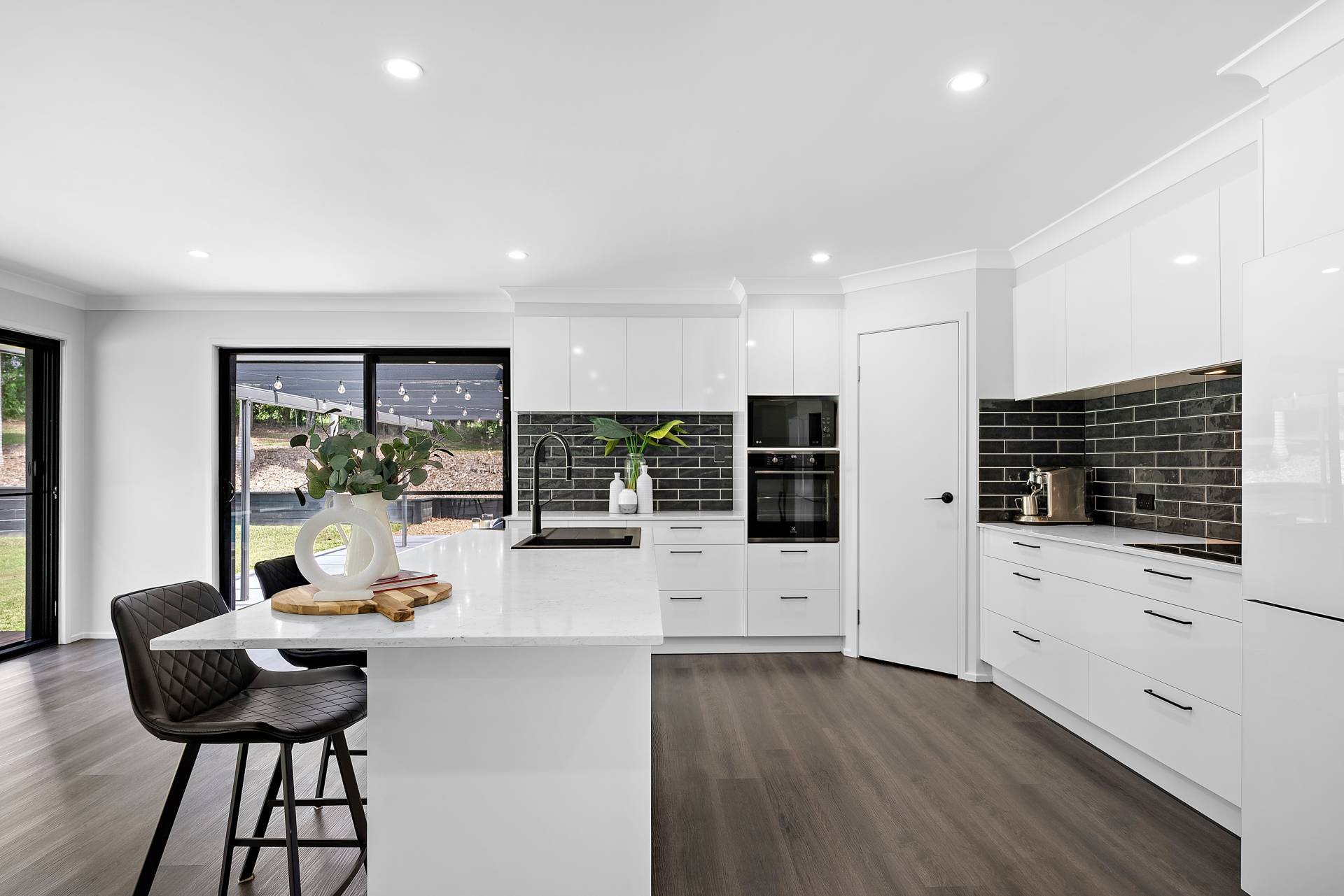 The sleek contemporary kitchen features a sit-up island, engineered stone benchtops, black subway tiling, custom cabinetry, brand new appliances, induction cooktop, wall oven and walk-in pantry.