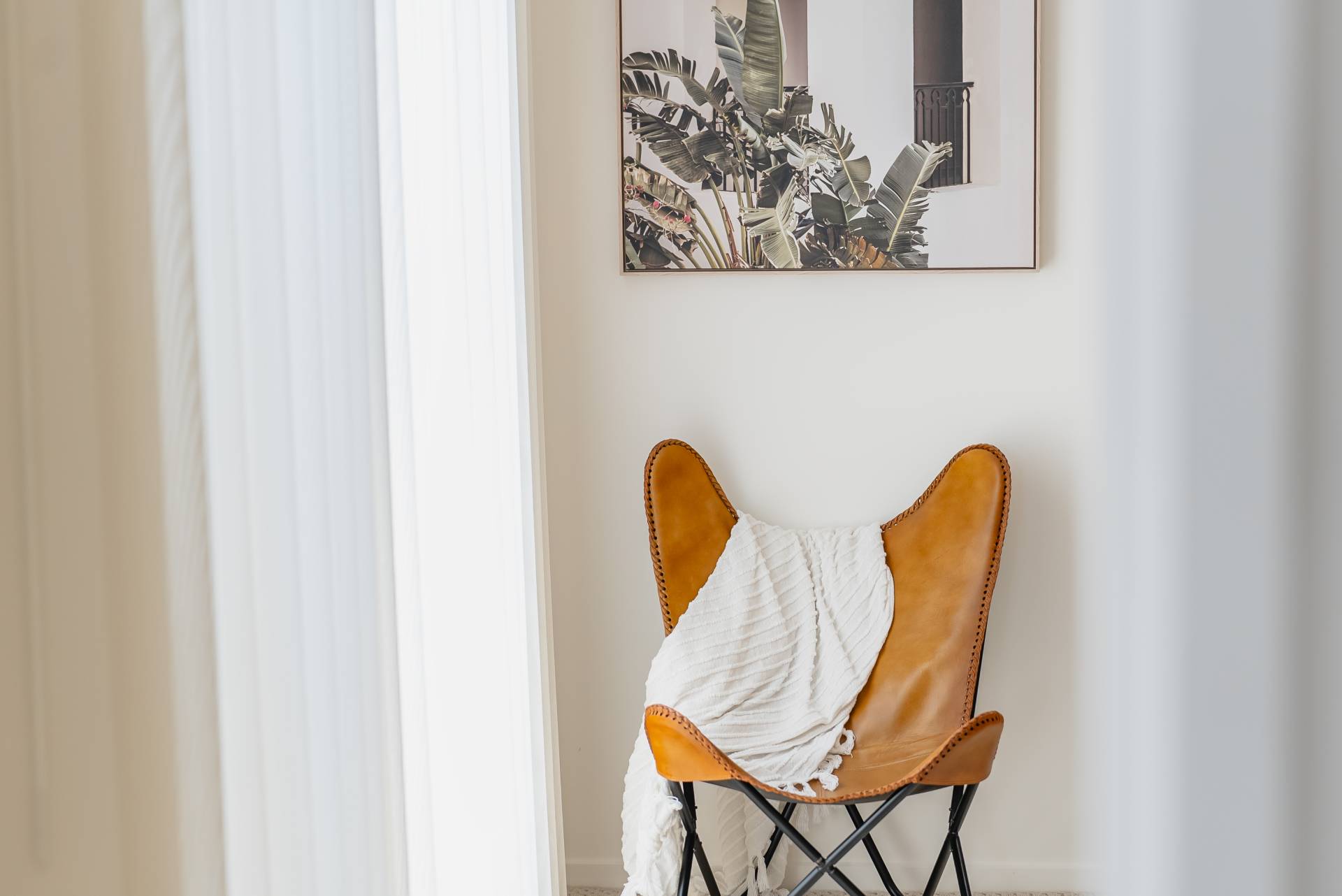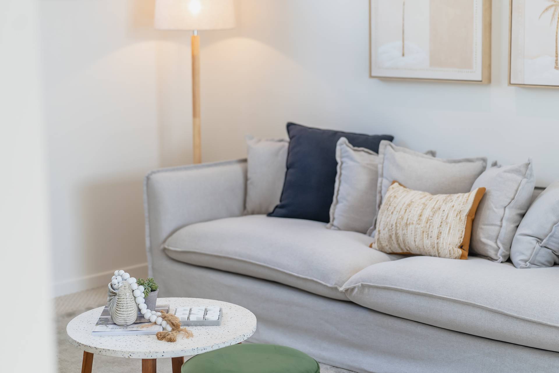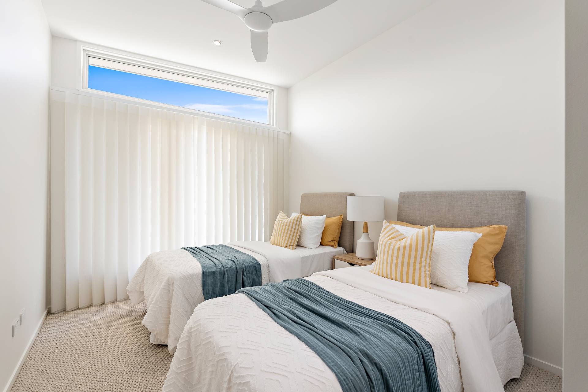 - Four spacious bedrooms with raked ceilings and stunning sheer window coverings