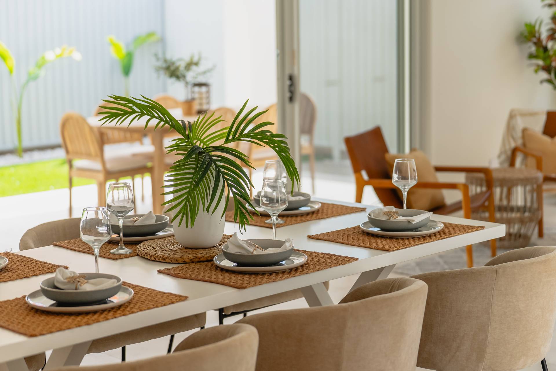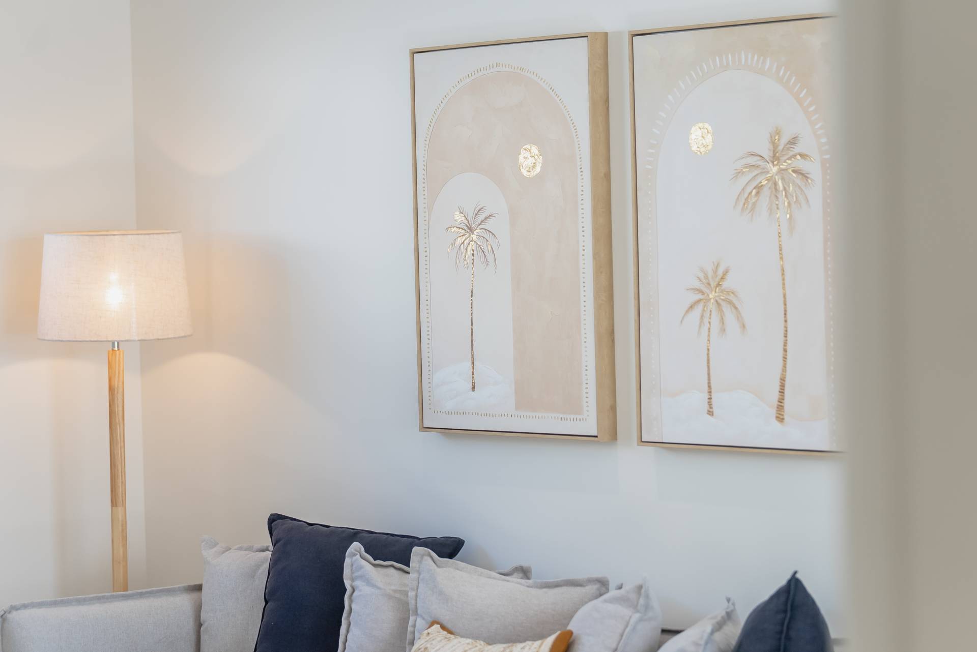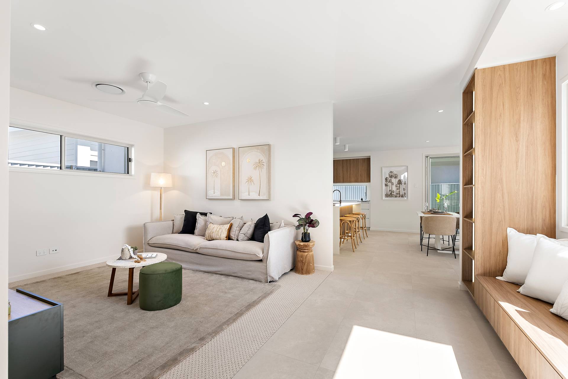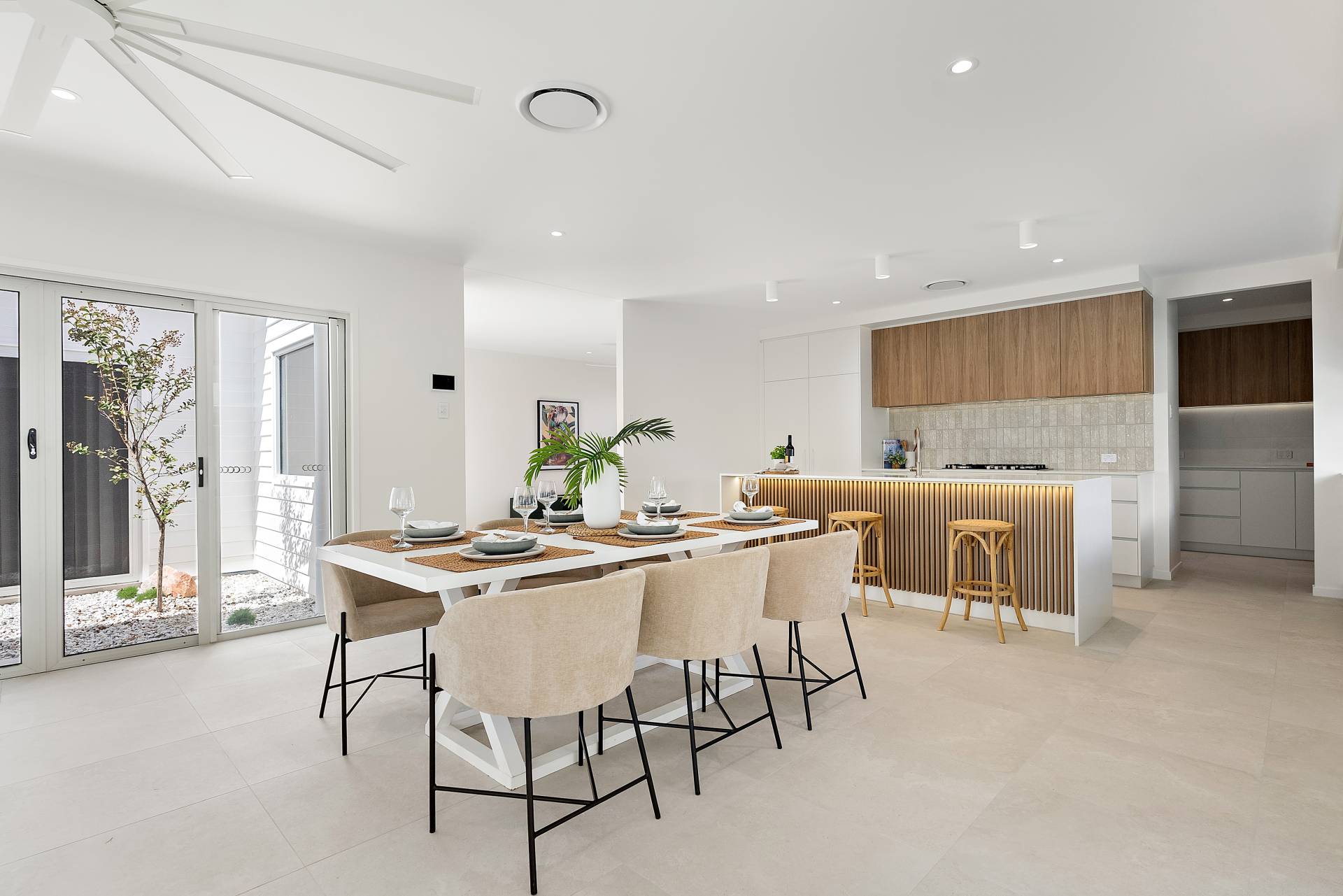 - Expansive open-plan living, dining, and kitchen area with iconic lighting and large feature fan