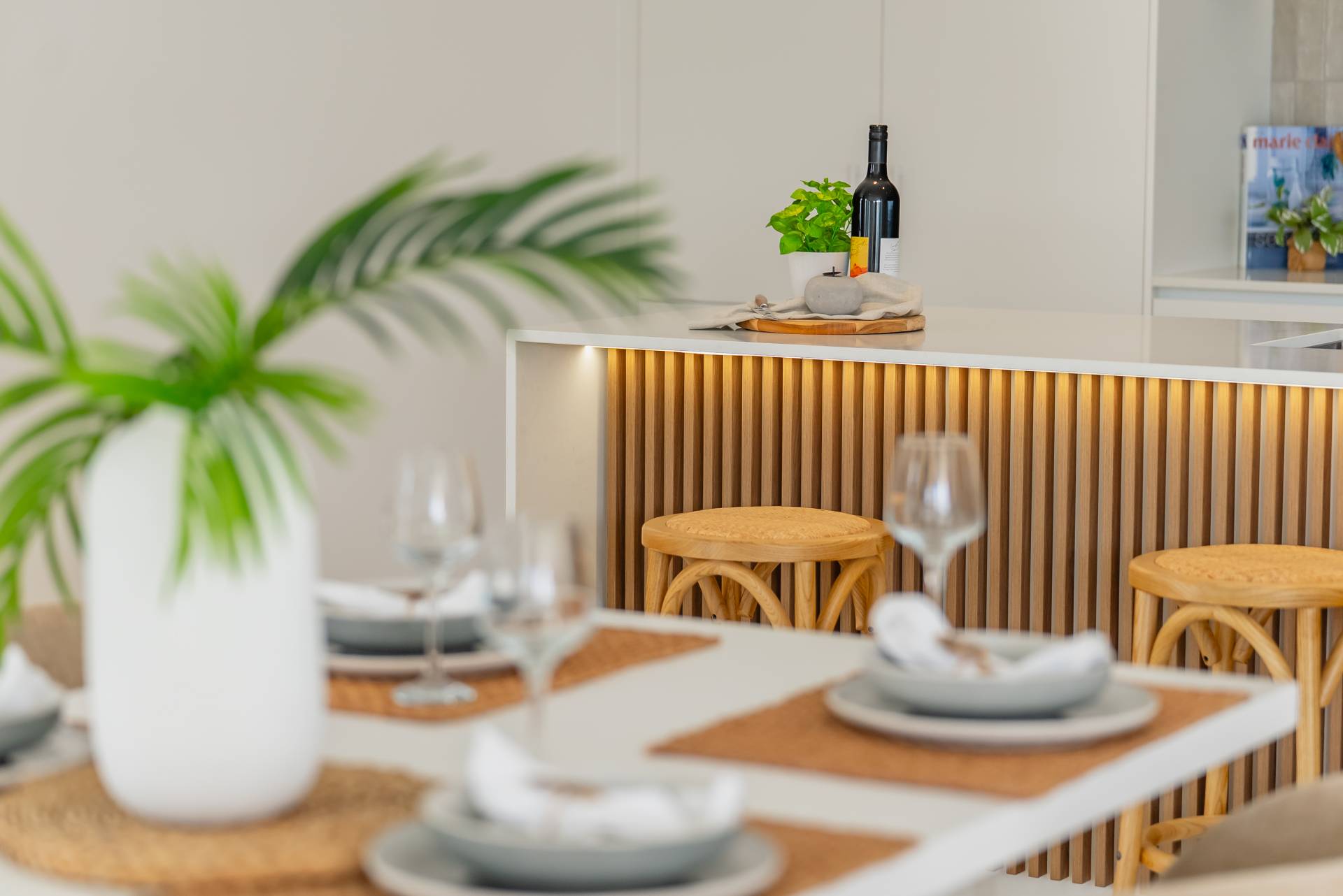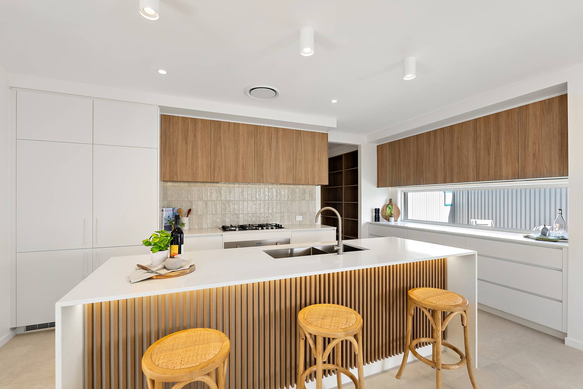 - Kitchen boasts large breakfast island with feature wood paneling, stone bench-tops, large window with views to the pool, bespoke cabinetry and integrated refrigerator, freezer and dishwasher