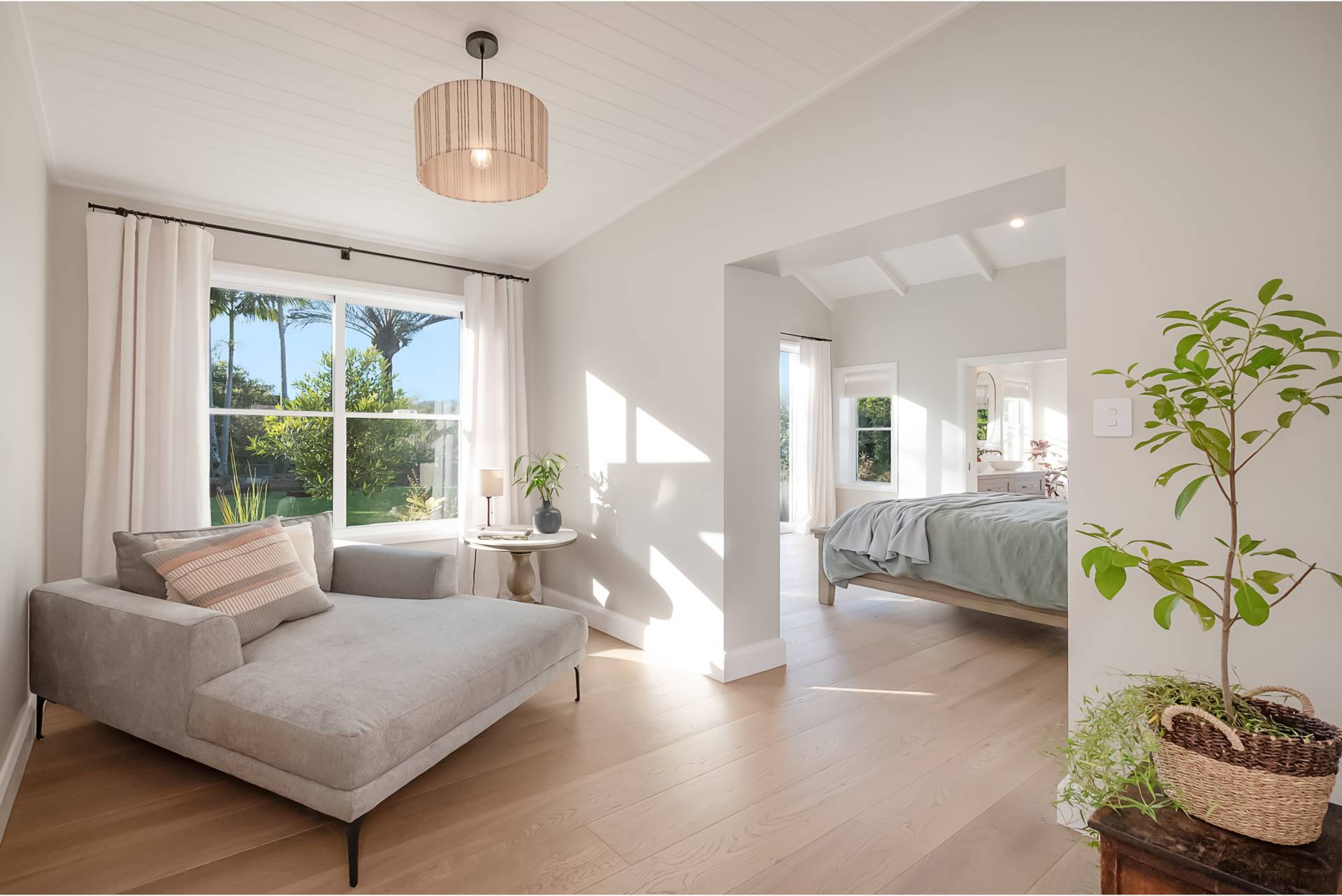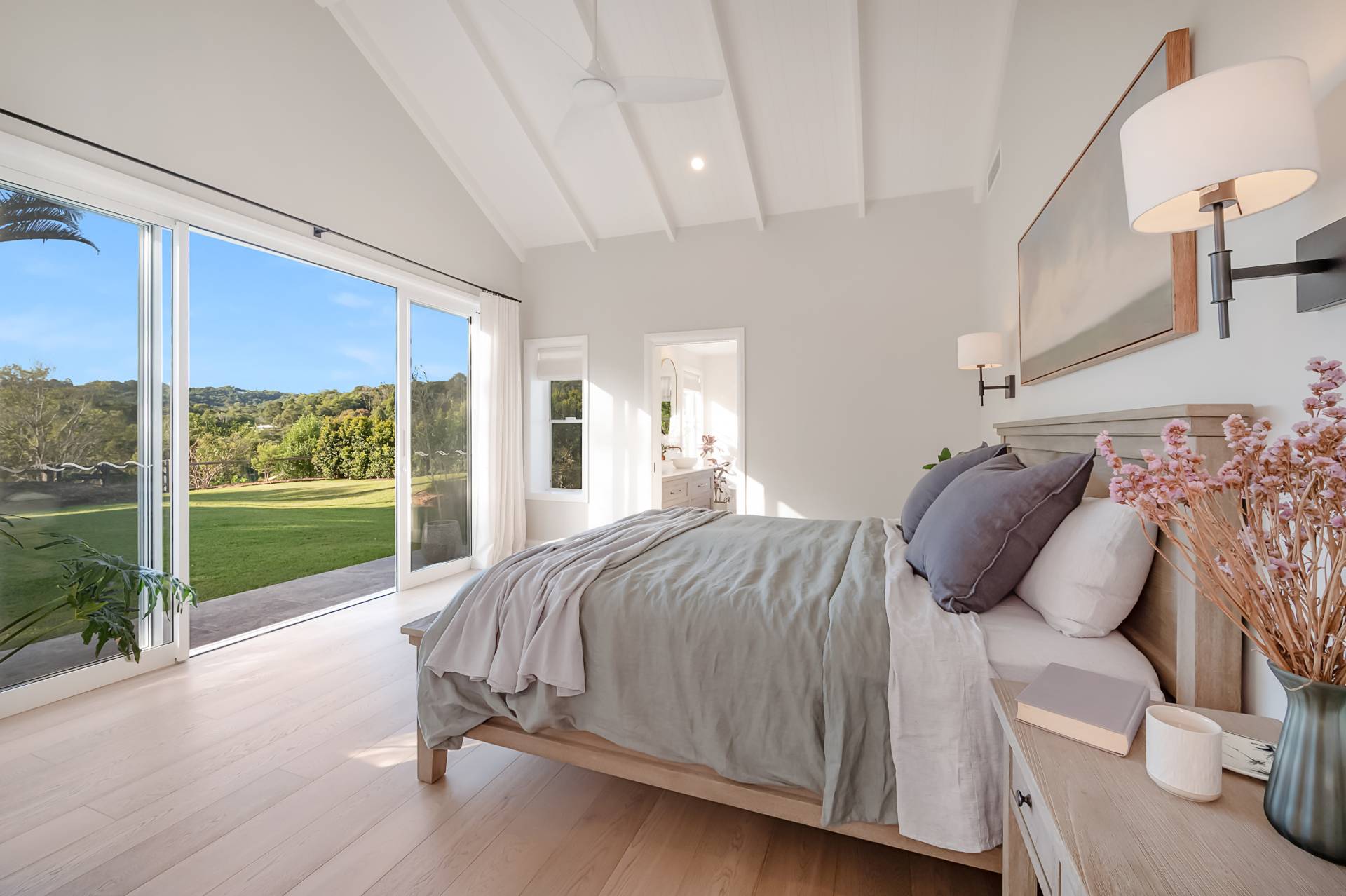 The incredible master suite is a haven of ordered calm, boasting 4m ceilings, a luxe bath ensuite, two dressing rooms, a reading retreat and doors opening out to the garden beyond.