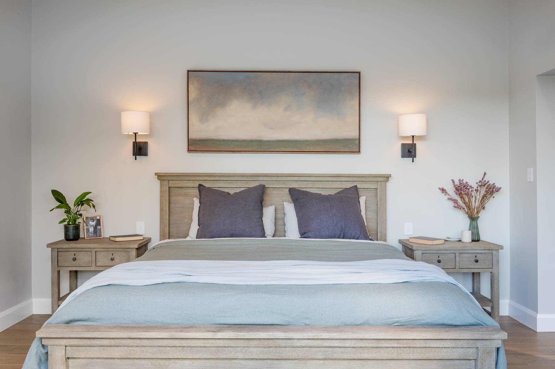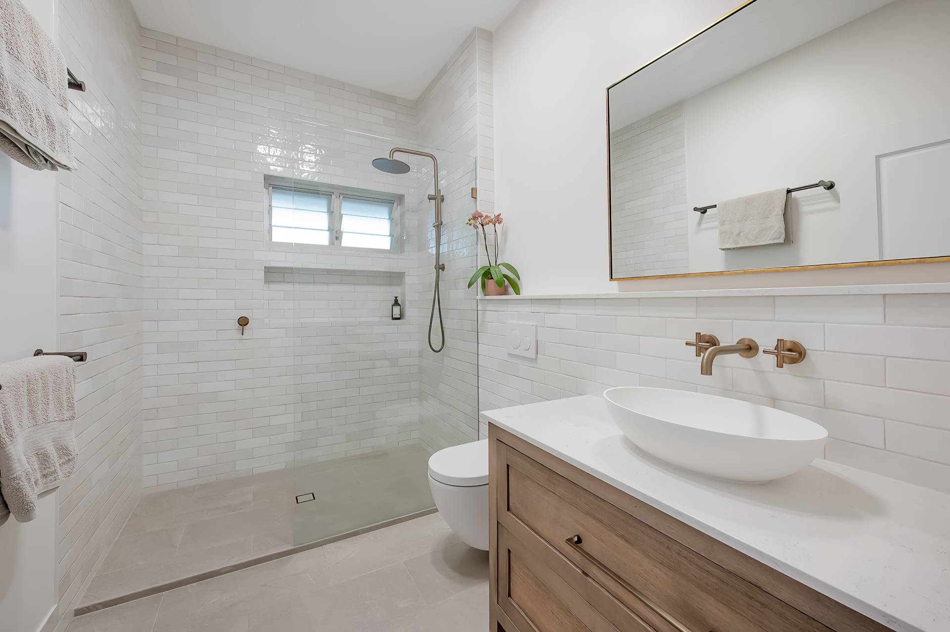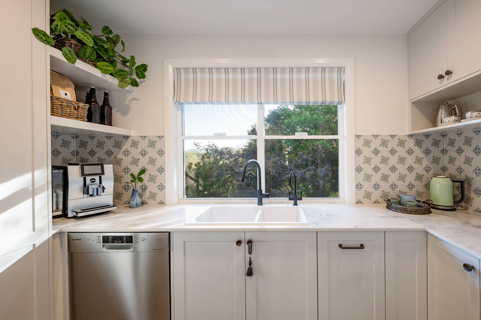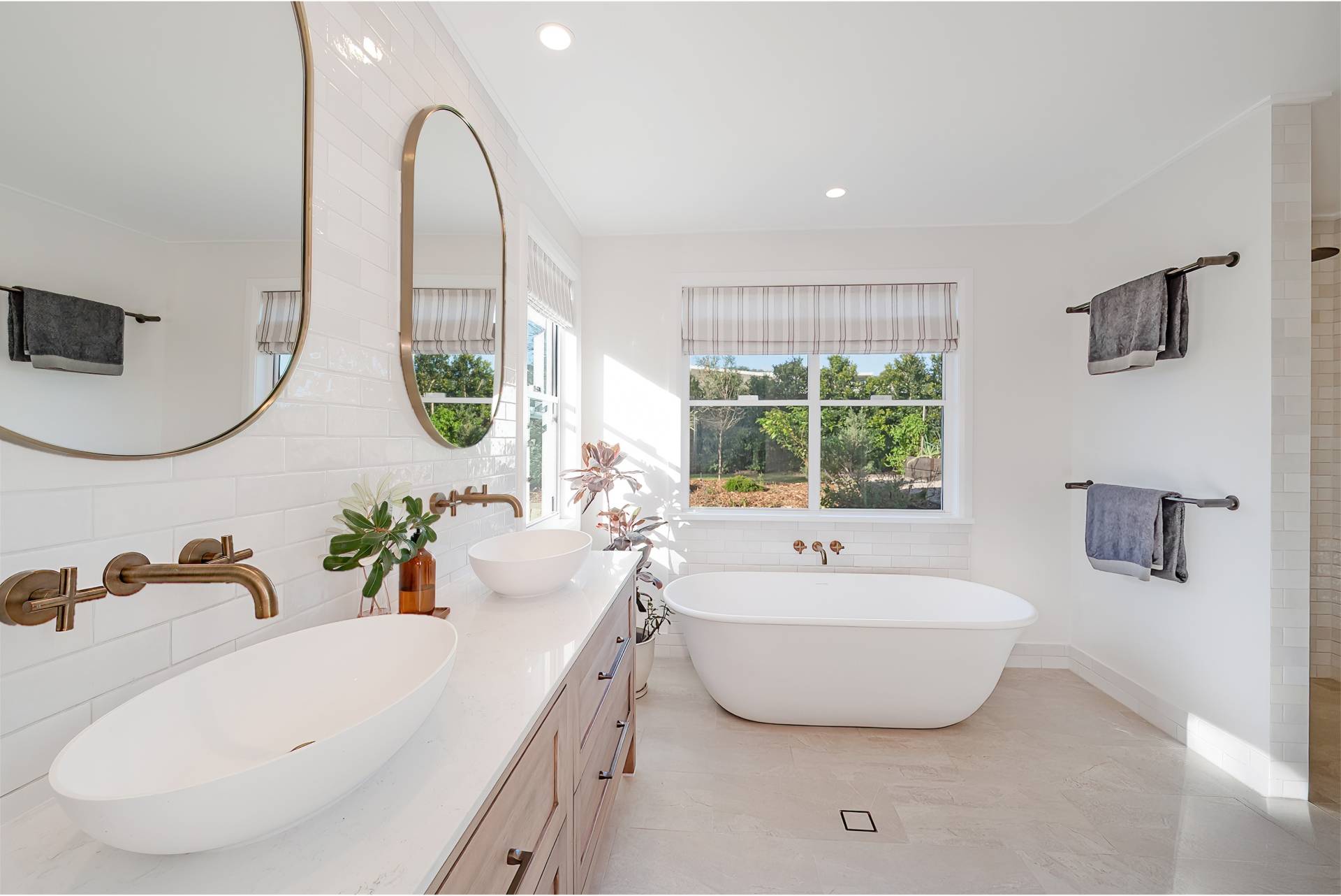 Hand-crafted timber vanities and artisan stone tiling blend with granite farmhouse sinks and designer hardware in a home which celebrates the materials of the natural environment and the artistry of local craftspeople.