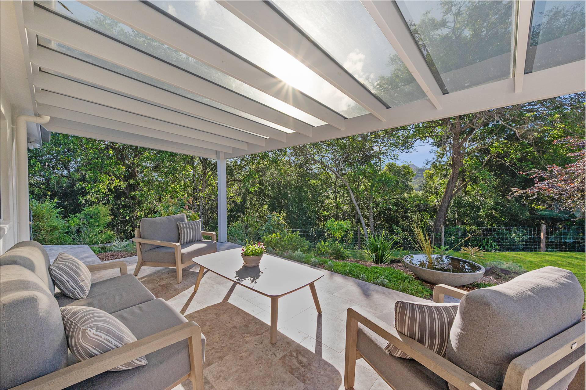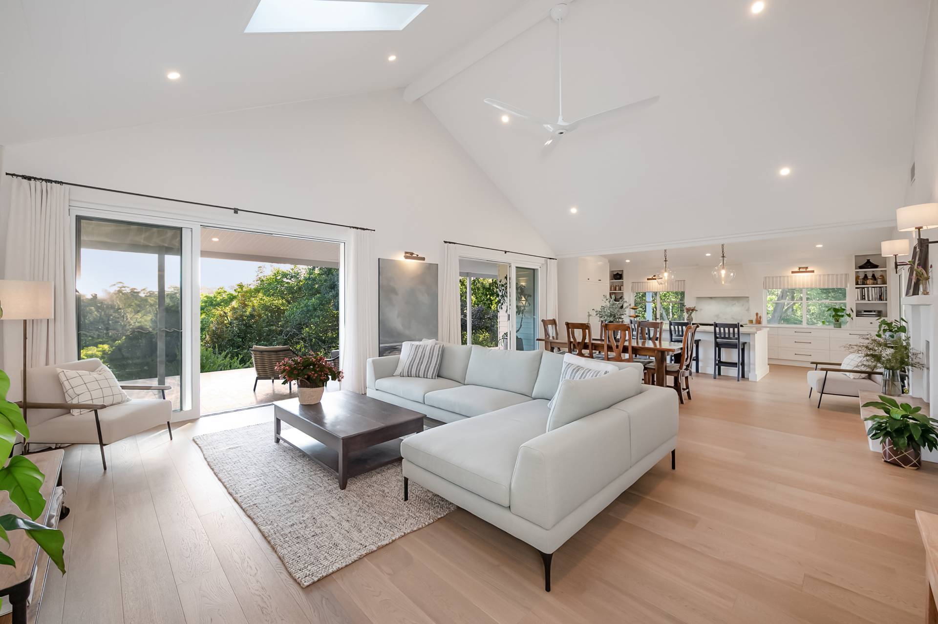 The light-filled central living/dining room, with its cathedral ceilings, skylights and feature fireplace, offers panoramic mountains views and flows out to the surrounding shaded entertaining spaces.
