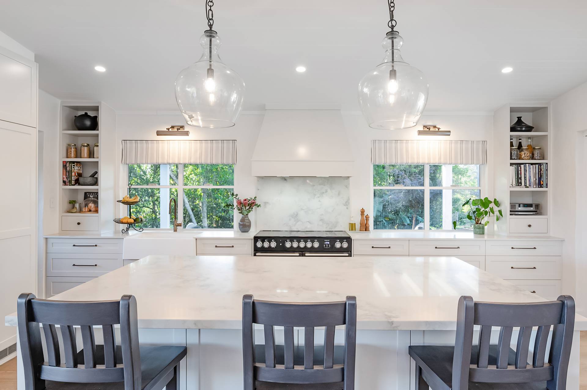 * Custom shaker kitchen cabinetry with stone benches and brass handles